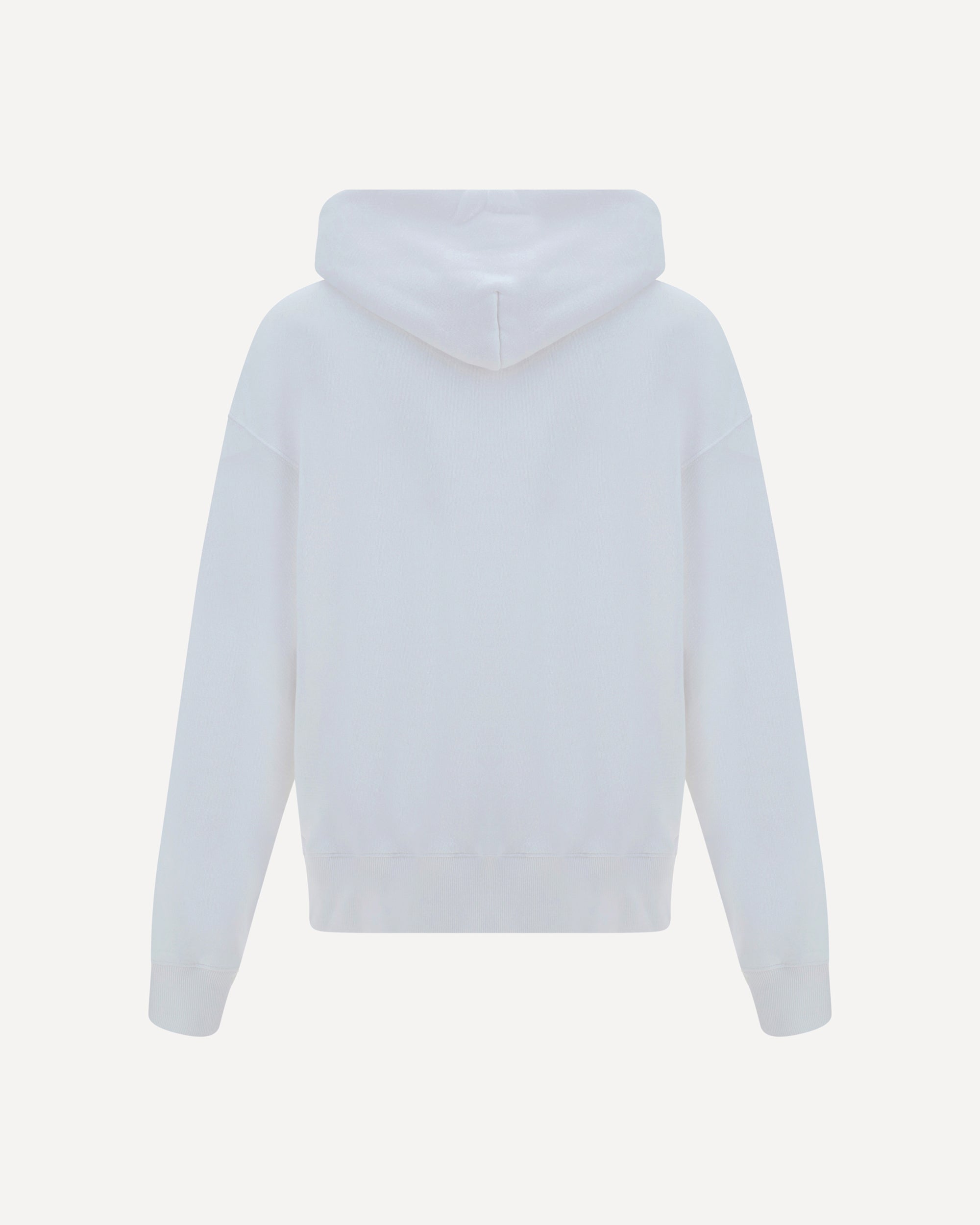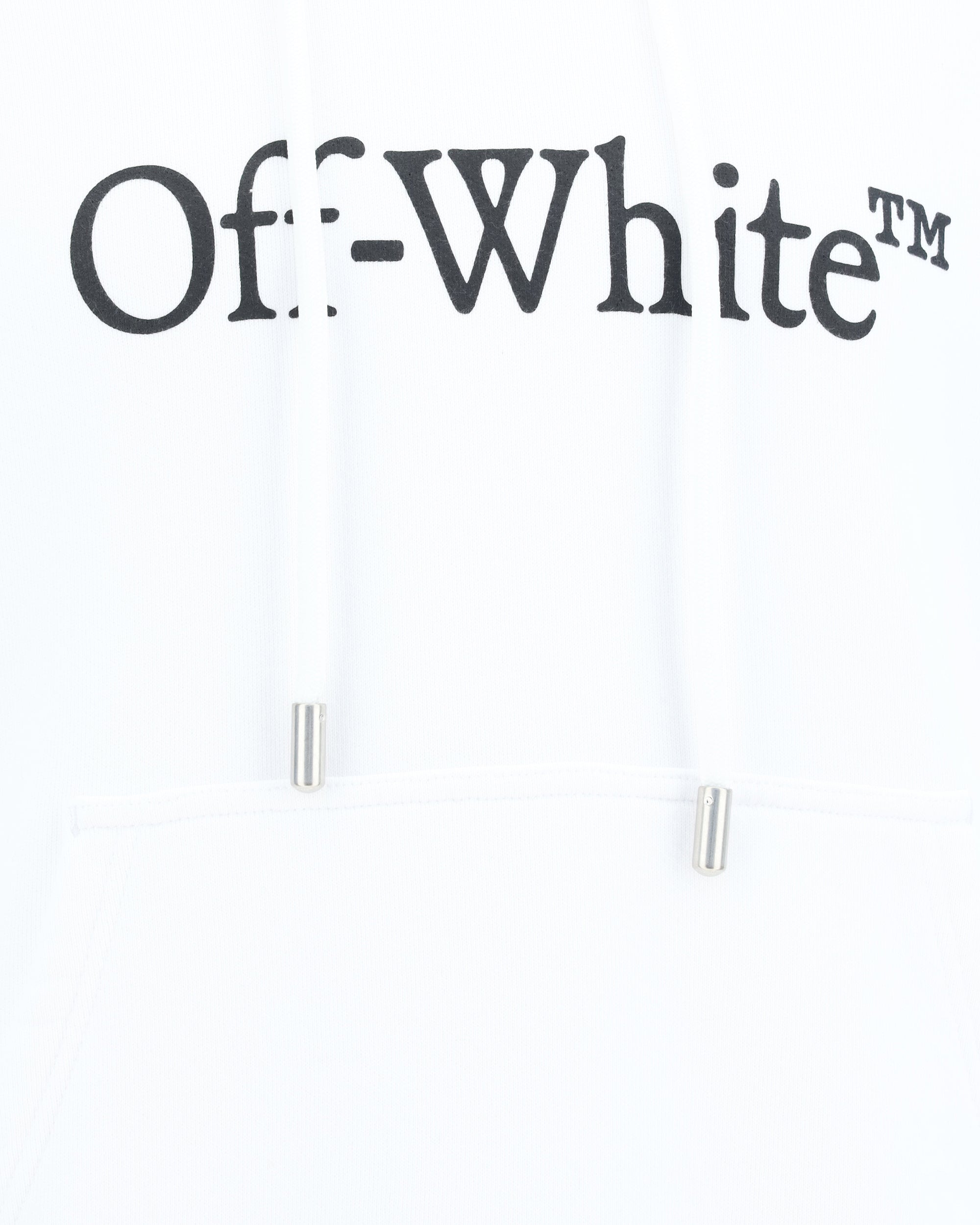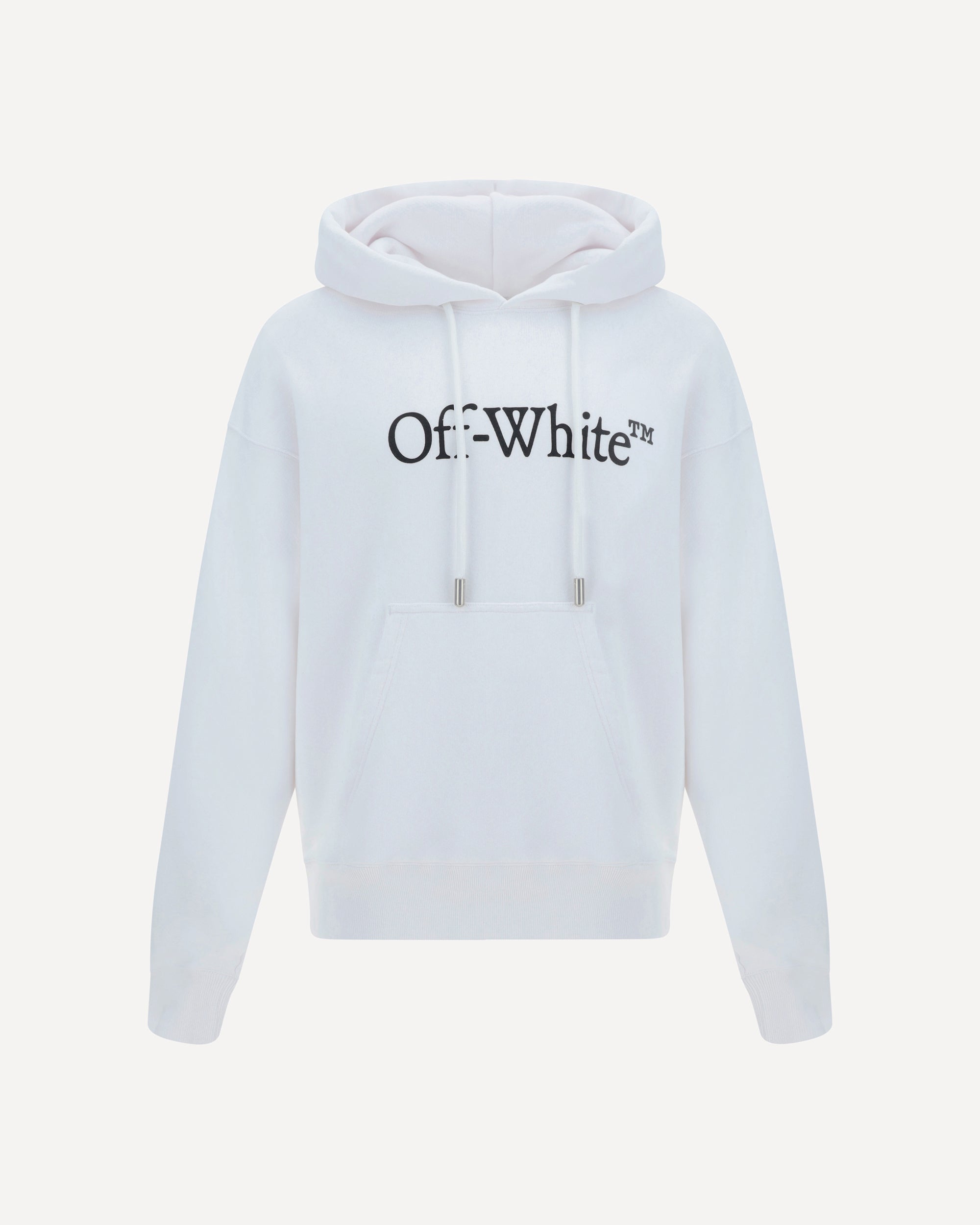 Cotton Big Bookish Skate Hoodie by Off-White, features hood with adjustable drawstring, ribbed cuffs, ribbed hem, front kangaroo pocket, iconic brand monogram printed in contrasting color on front, regular fit.
