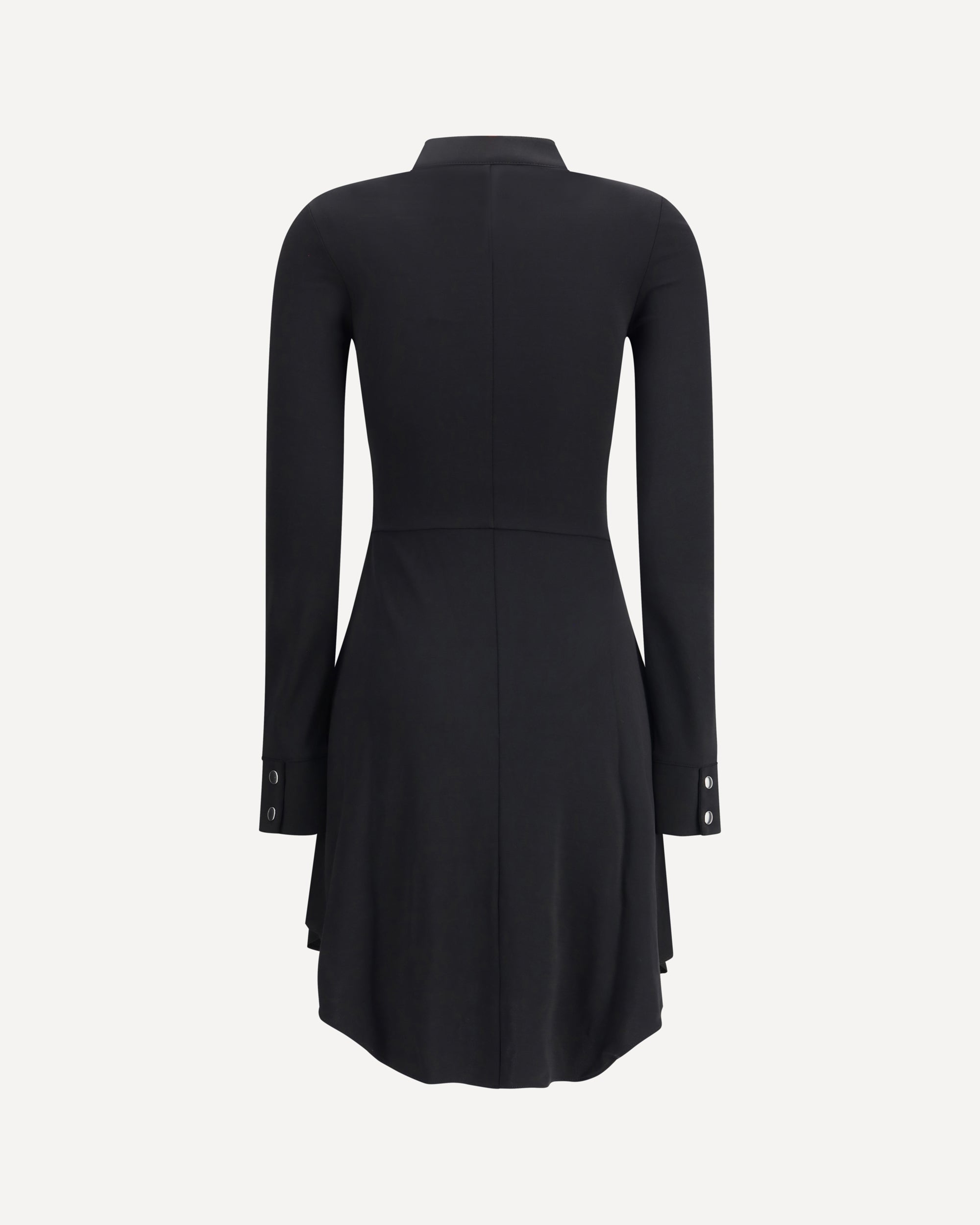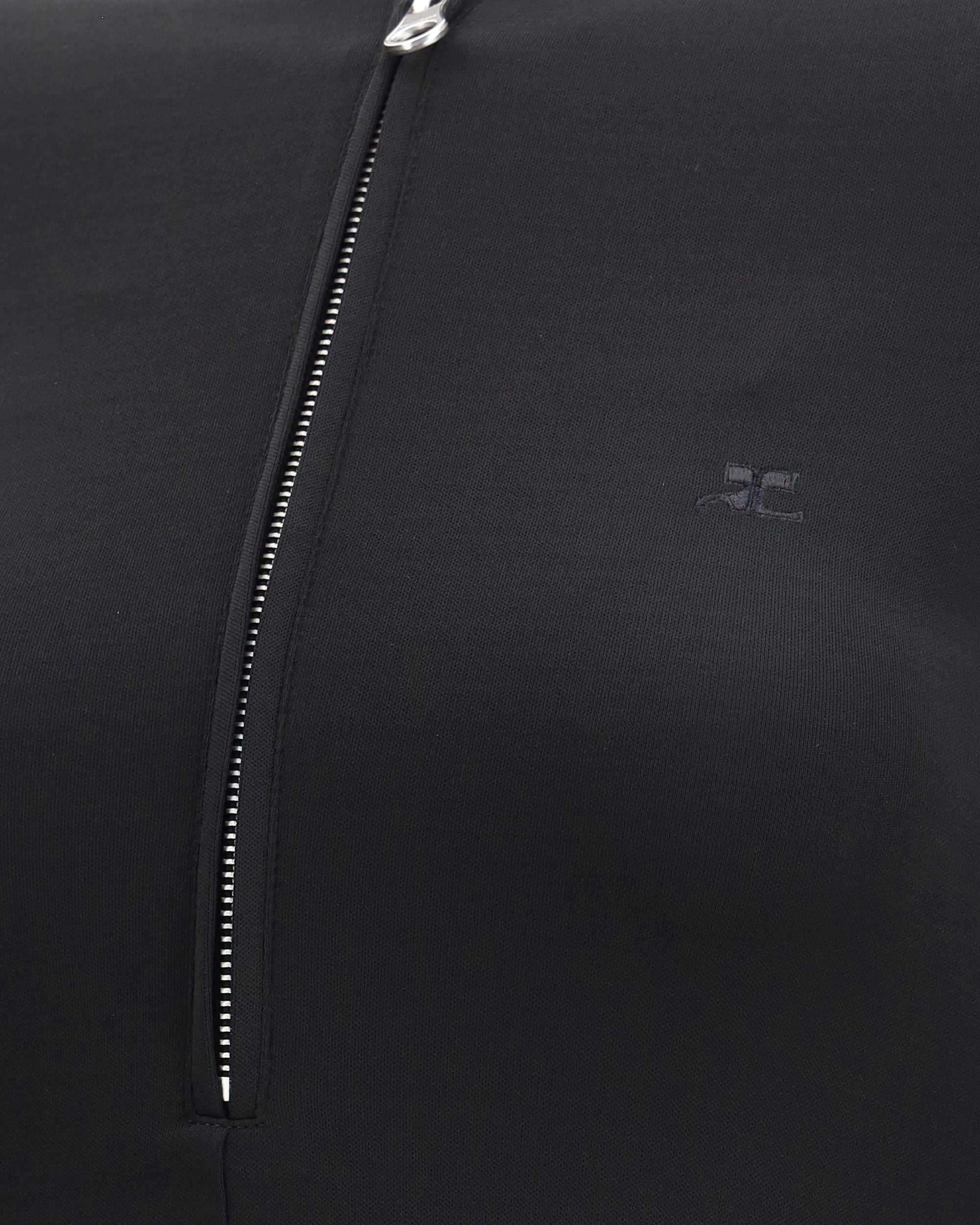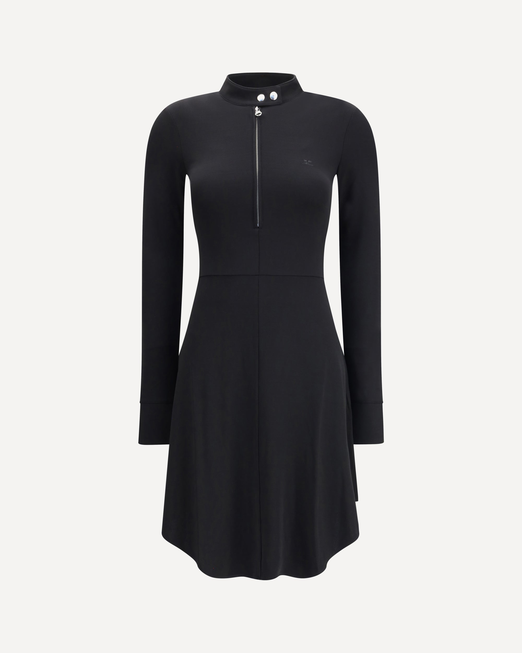 Courrèges' zippered jersey biker Dress is the perfect meeting of contemporary attitude and avant-garde spirit. Made of technical jersey, it envelops the silhouette with a bold yet comfortable fit. The long-sleeved design recalls the biker aesthetic with iconic details such as an adjustable high collar and a center front zipper that allows you to modulate the opening at will. The brand's essential signature "AC" logo stands out on the chest, adding a graphic and recognizable touch. A suit with an urban soul, designed for those who love a bold and sophisticated look.