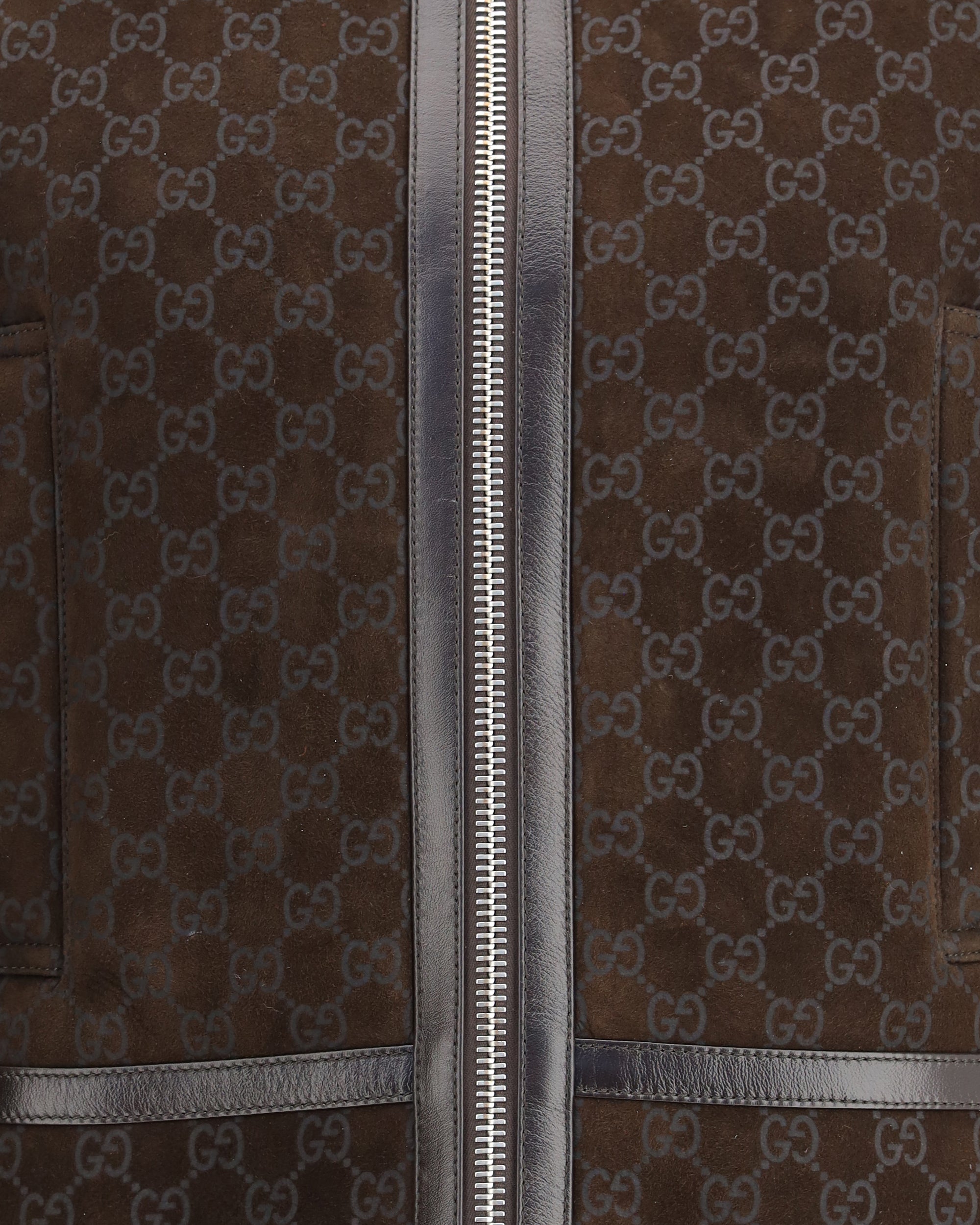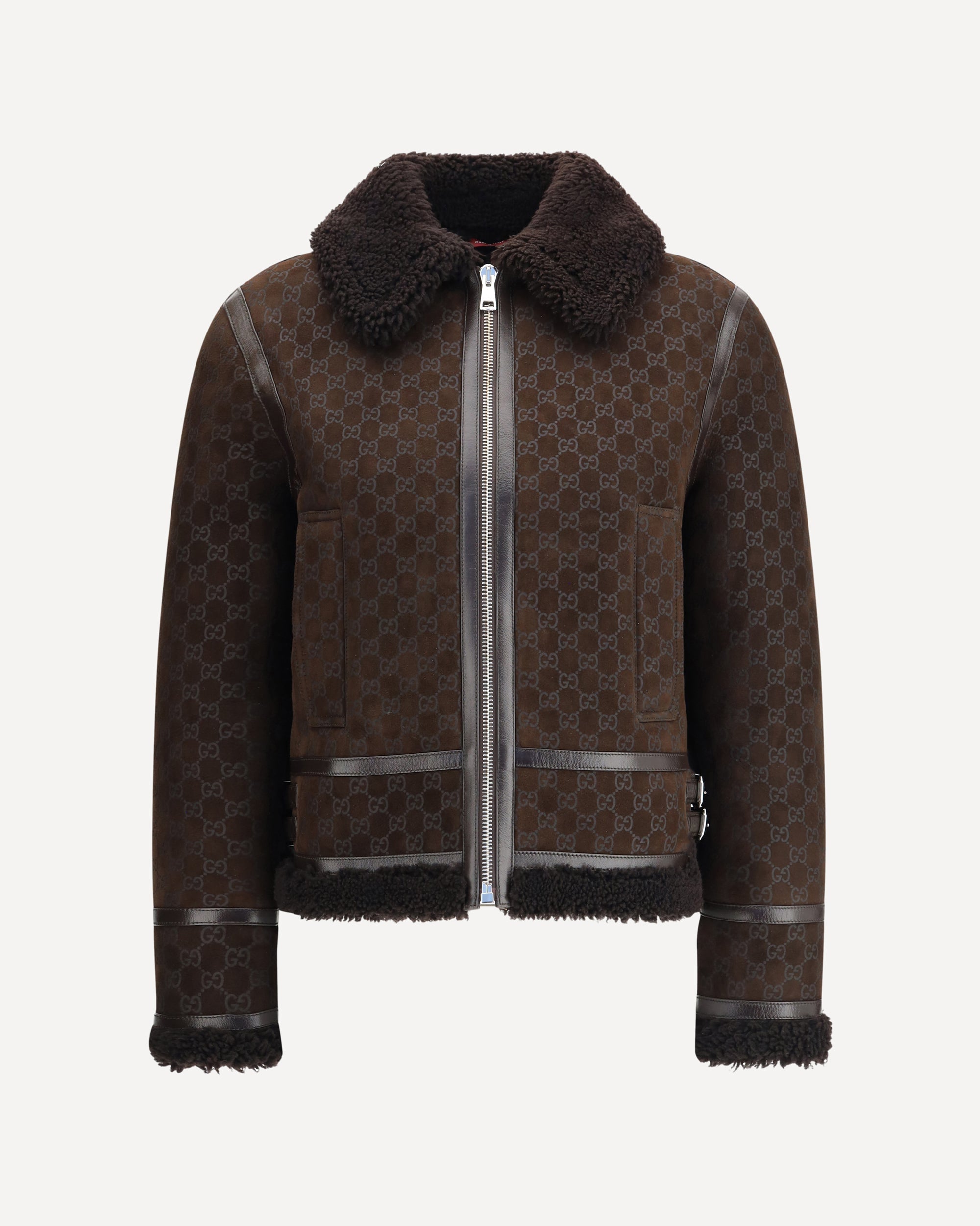 The Gucci Leather Jacket reimagines women’s outerwear with refined sophistication. Crafted from lambskin embossed with the GG motif, it reflects the maison’s distinctive codes. A shearling collar and lining enhance its warmth and enveloping feel, while leather trims, a front zip fastening, and turned-up details at the hem and cuffs add a modern finish. An iconic and timeless piece that embodies Italian craftsmanship and Gucci’s unmistakable style.