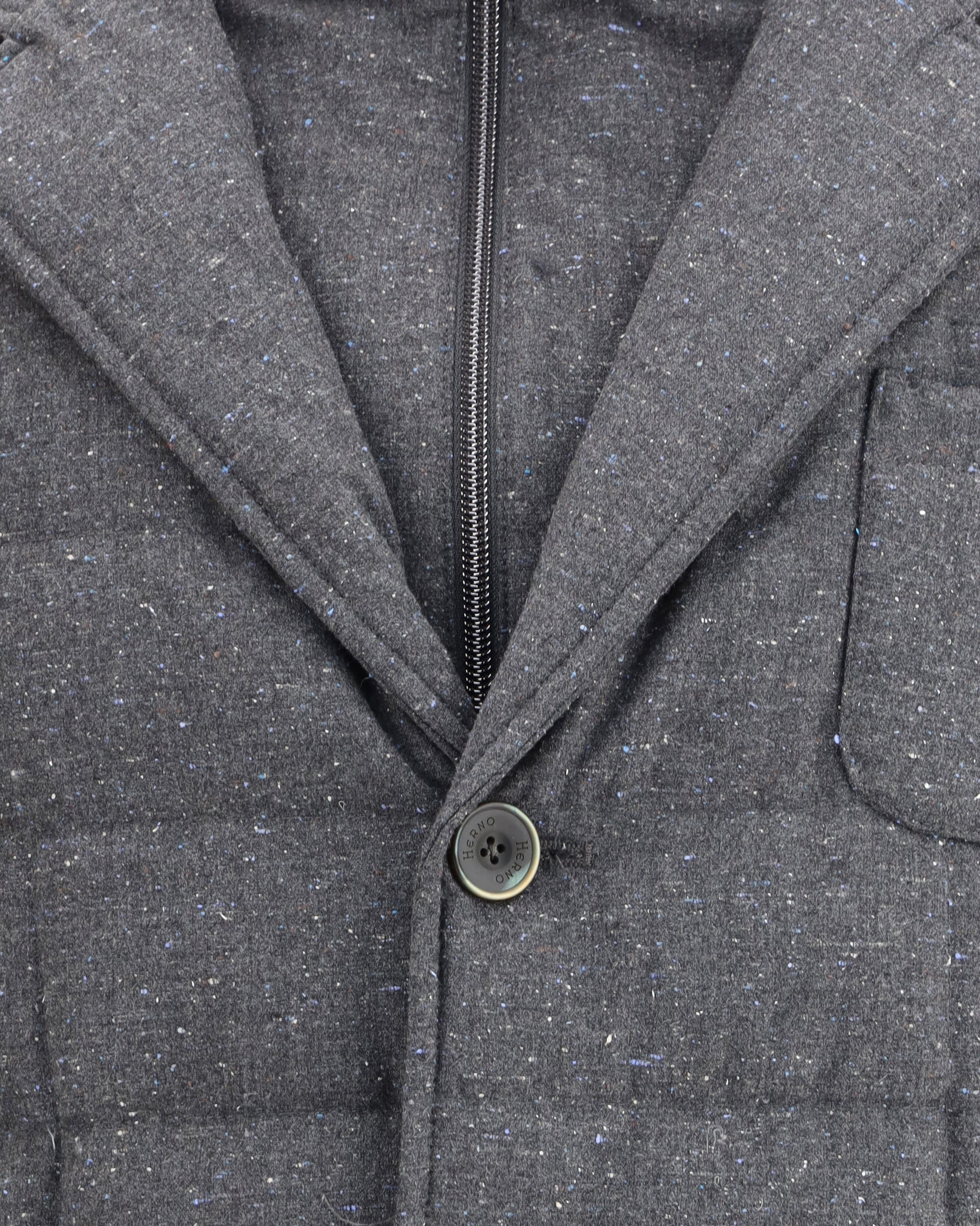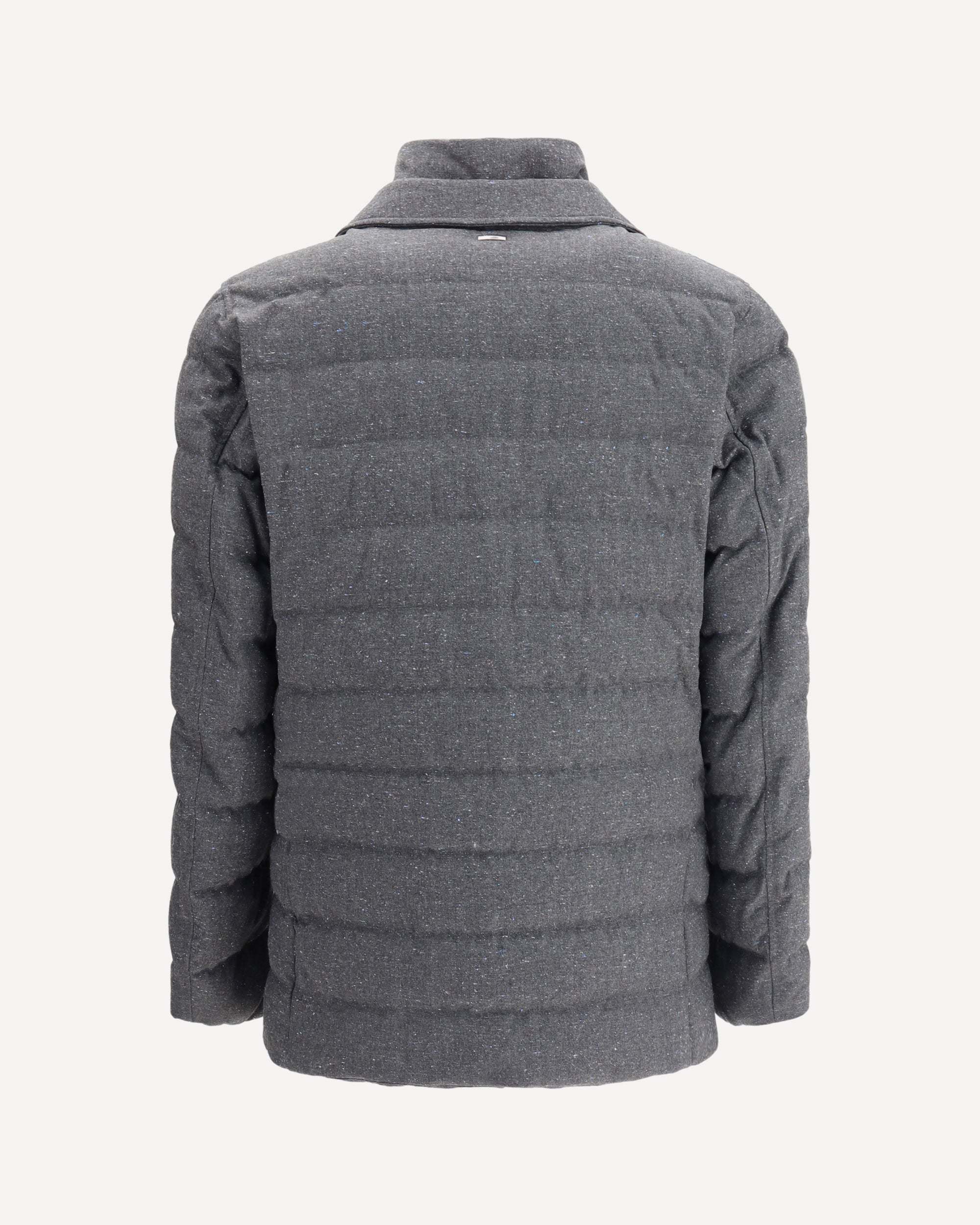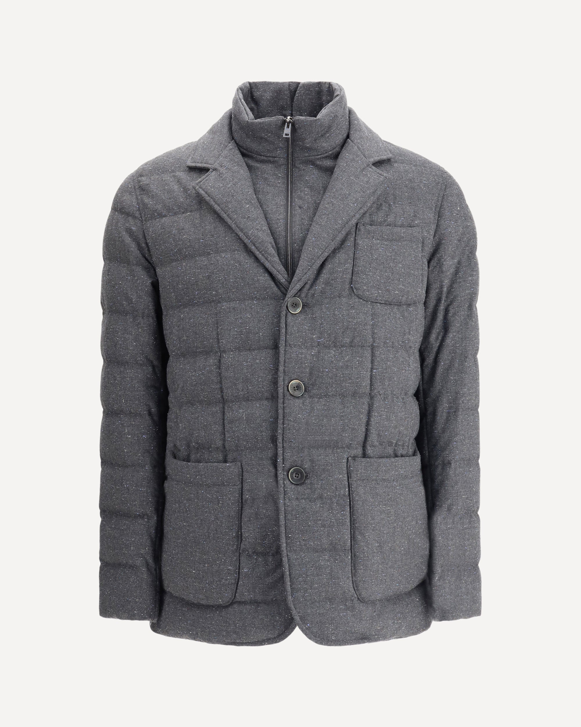 Herno's Down Jacket with a design inspired by the classic blazer, made of wool with a mélange pattern. The model features classic lapels, front button closure and a removable zippered inner part that offers added protection and versatility. Applied welt pockets on the front, quilted design and warm but lightweight padding complete the garment. A perfect blend of sartorial elegance and outdoor functionality.