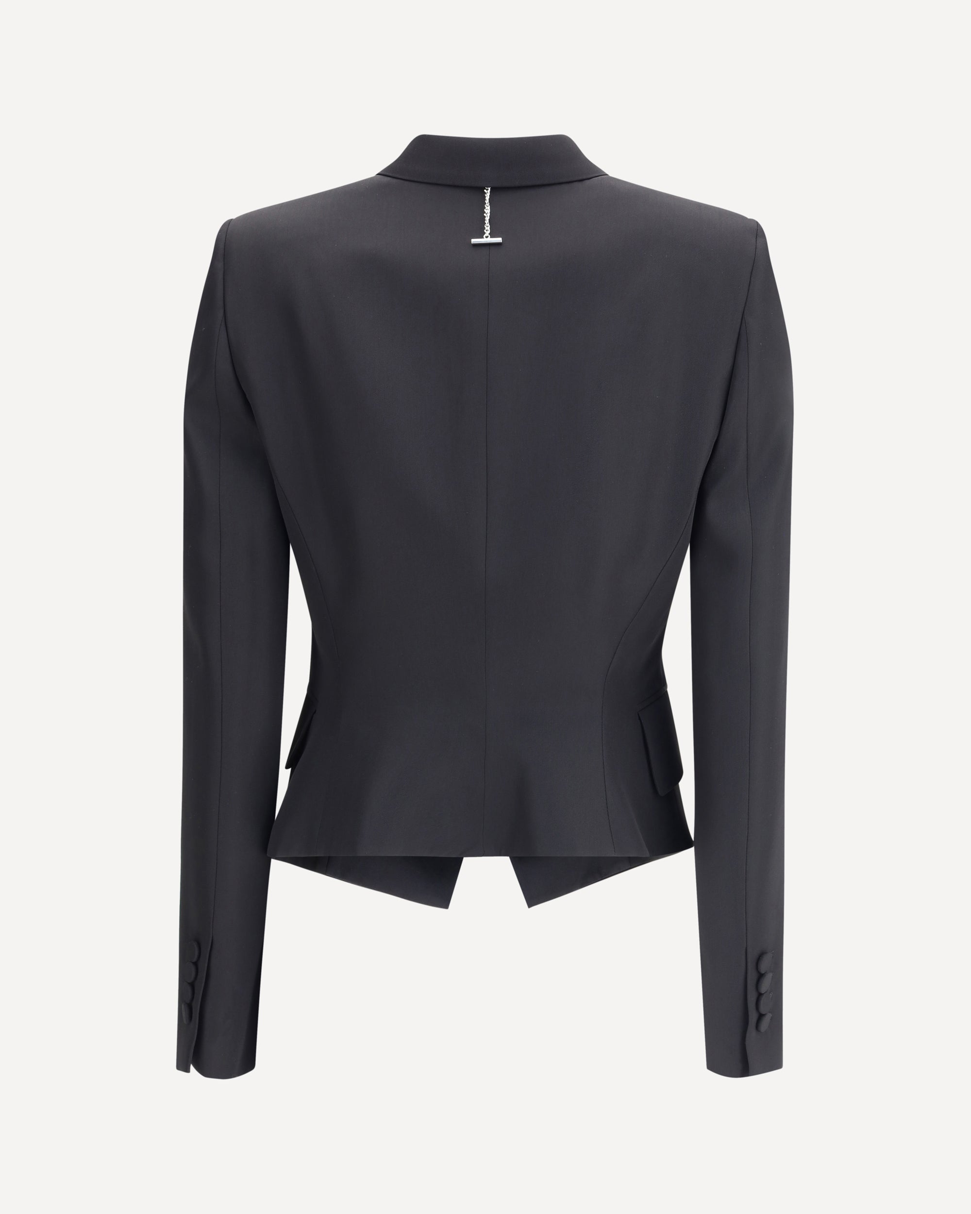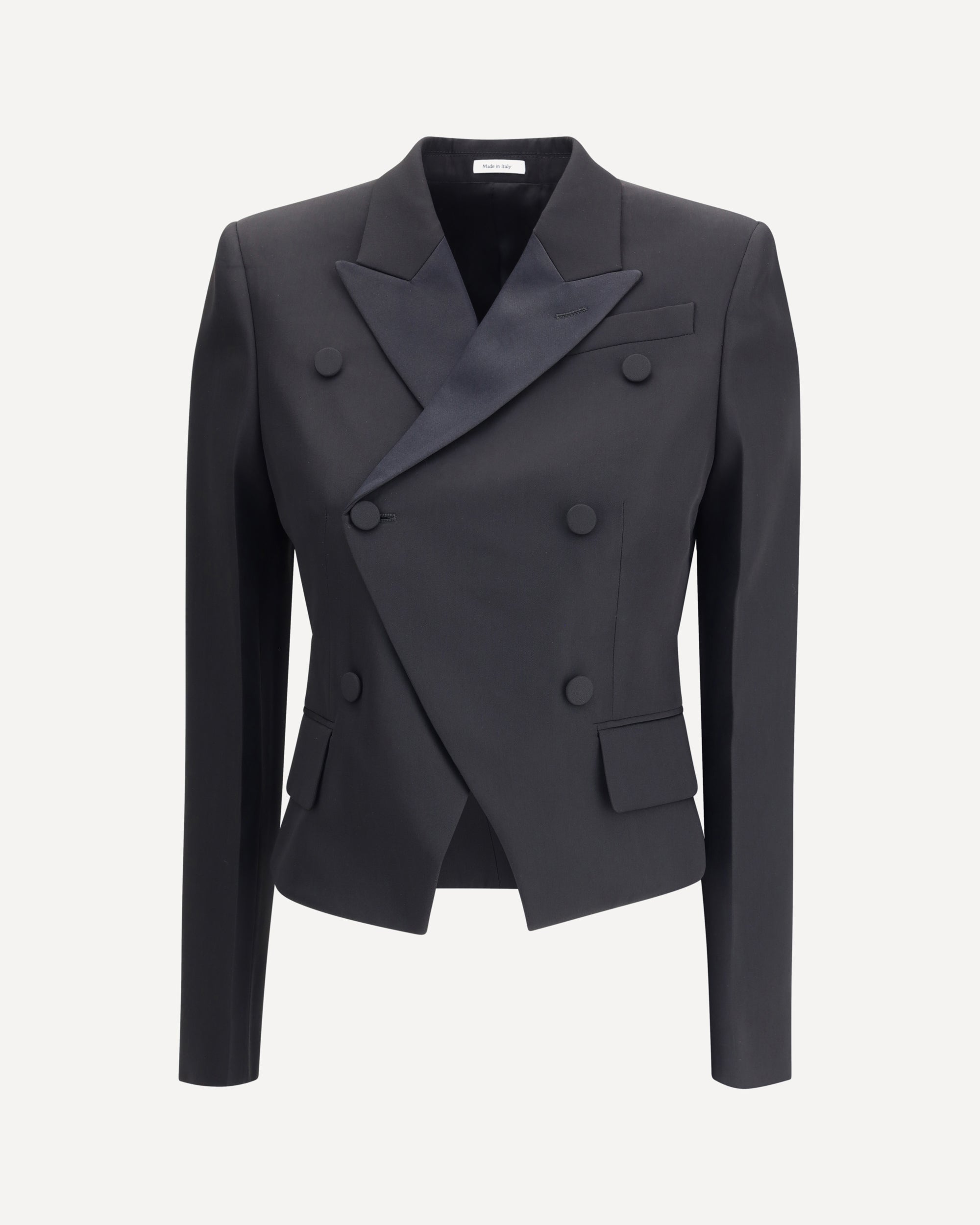 Alexander McQueen's Double-Breasted Blazer stands out for its short, fitted cut, with pronounced shoulders and a sculpted hem that enhance its architectural shape. Crafted from smooth, matte fabric, it adds a refined touch to the piece. The double-breasted button fastening and peak lapels complete the design, while discreet flap pockets and decorative cuffs add elegant, refined details.
