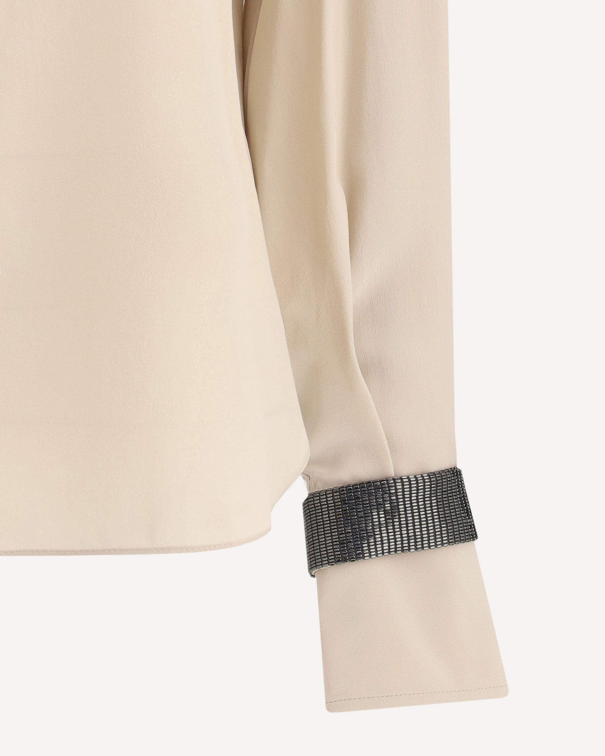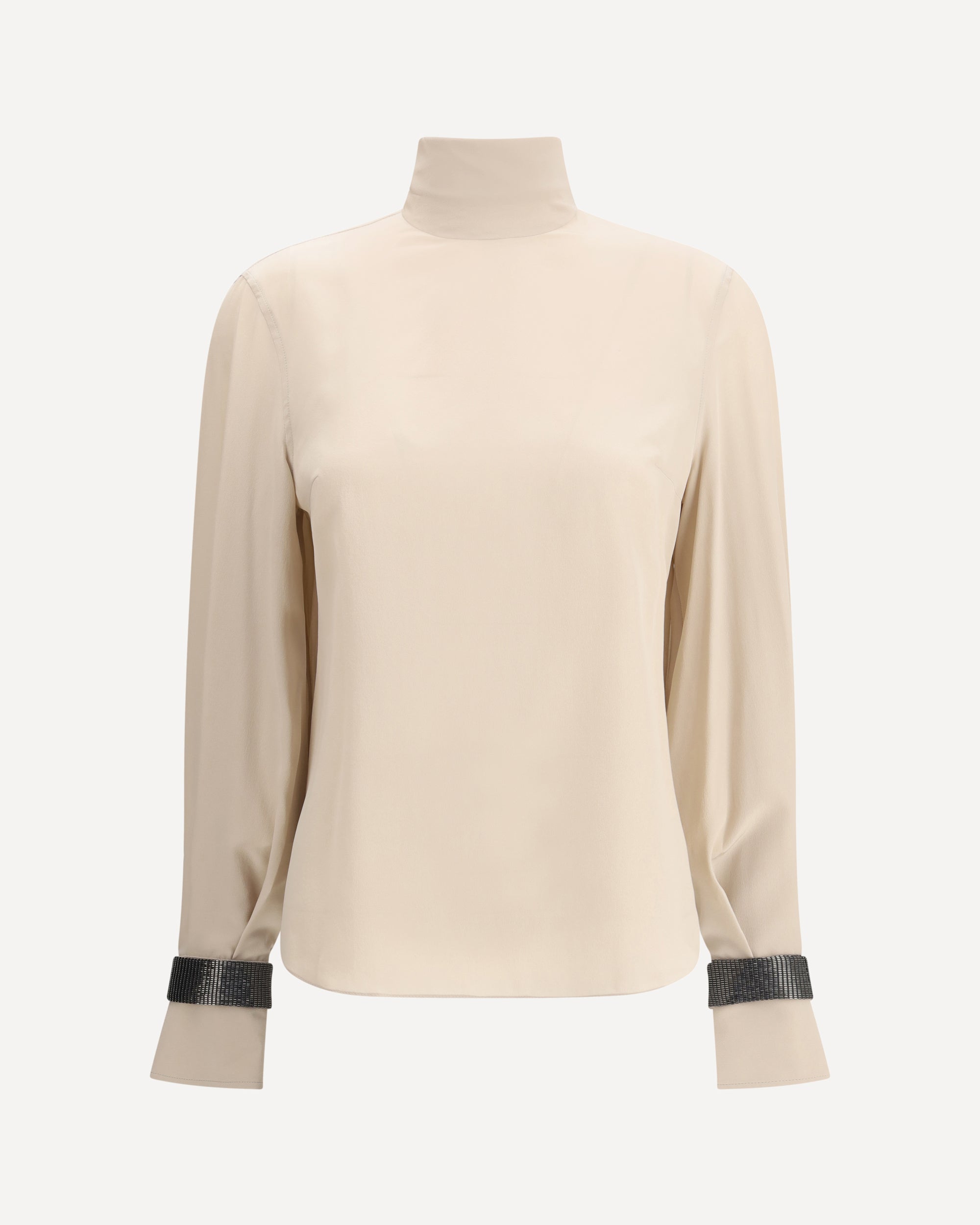 Brunello Cucinelli's silk crepe de Chine turtleneck Blouse is a feminine and refined piece, perfect for completing elegant looks with a light touch. The fluid, lightweight fabric enhances the essential silhouette, while the drop opening with a button at the back adds delicacy to the design. The high neck is embellished with a removable jewel decoration, the Precious Bracelets, which give a bright and sophisticated accent, in full Cucinelli style.