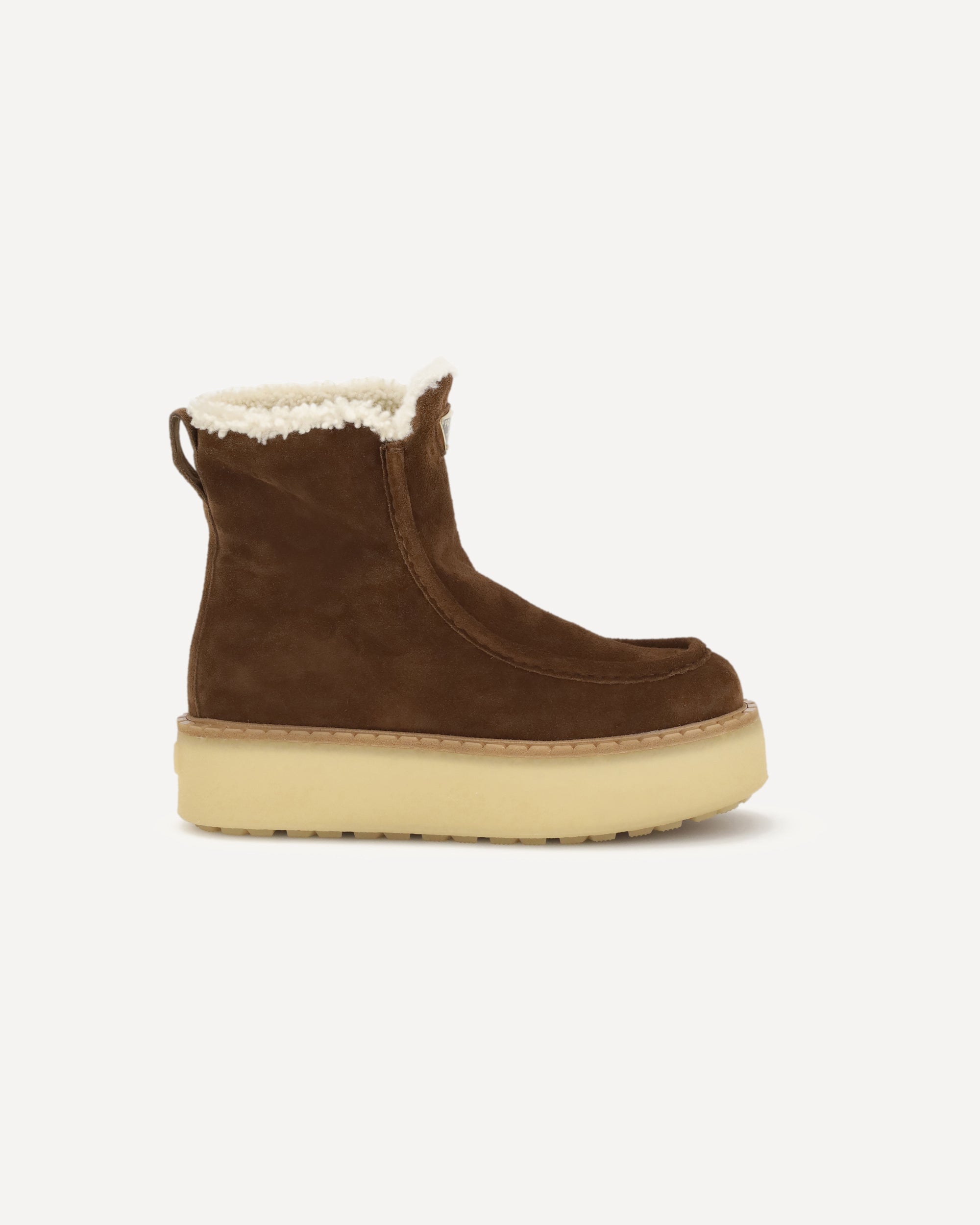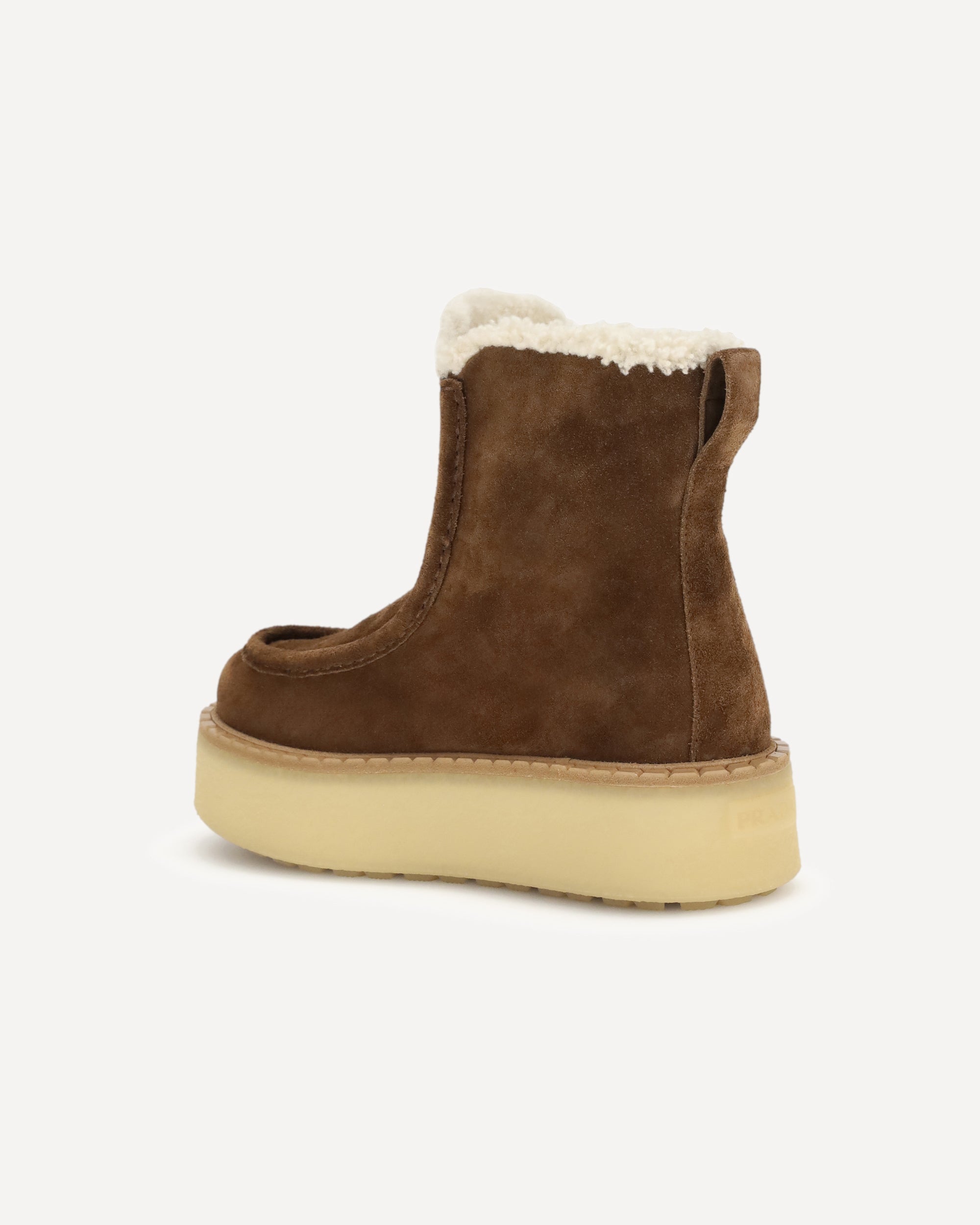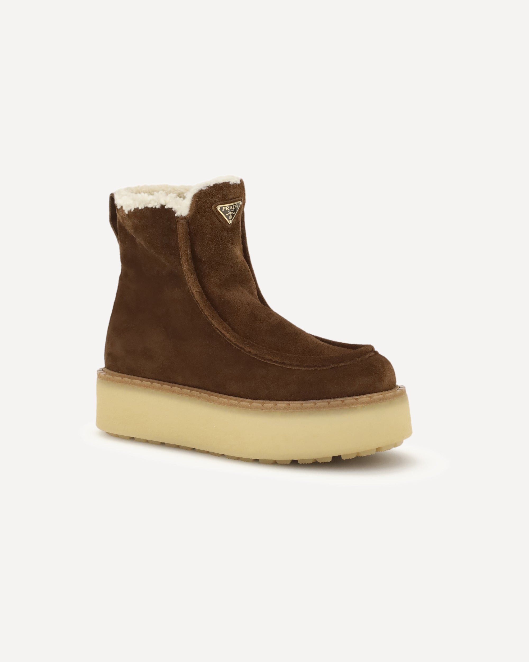The suede and shearling Ankle Boots by Prada combine comfort and sophistication in a design designed for the winter season. Made of suede leather with a soft sheepskin interior, they offer warmth and softness, while the rubber sole ensures lightness and durability. The triangular enameled metal logo adds a distinctive touch, complemented by a sheepskin-lined removable footbed for ultimate comfort.