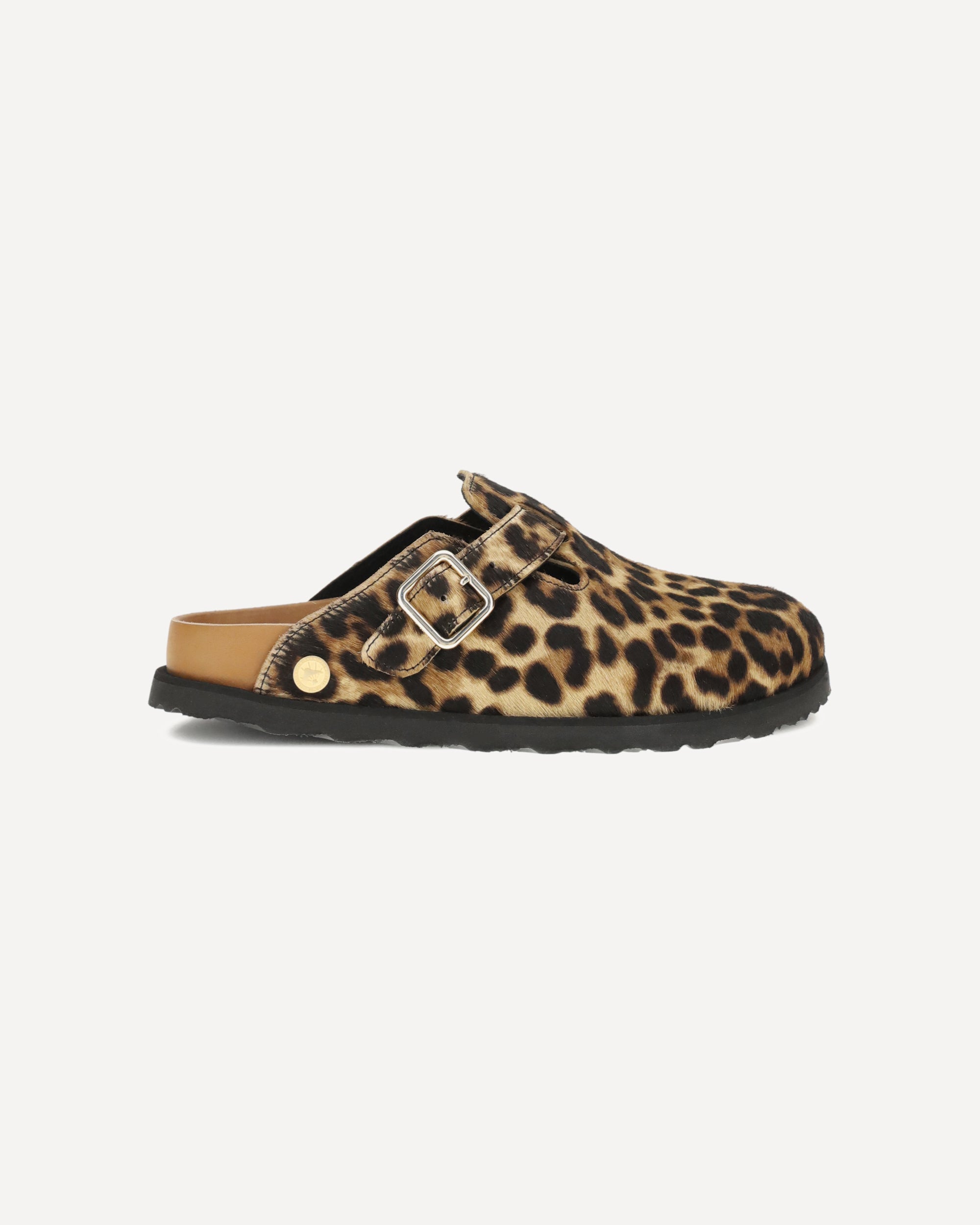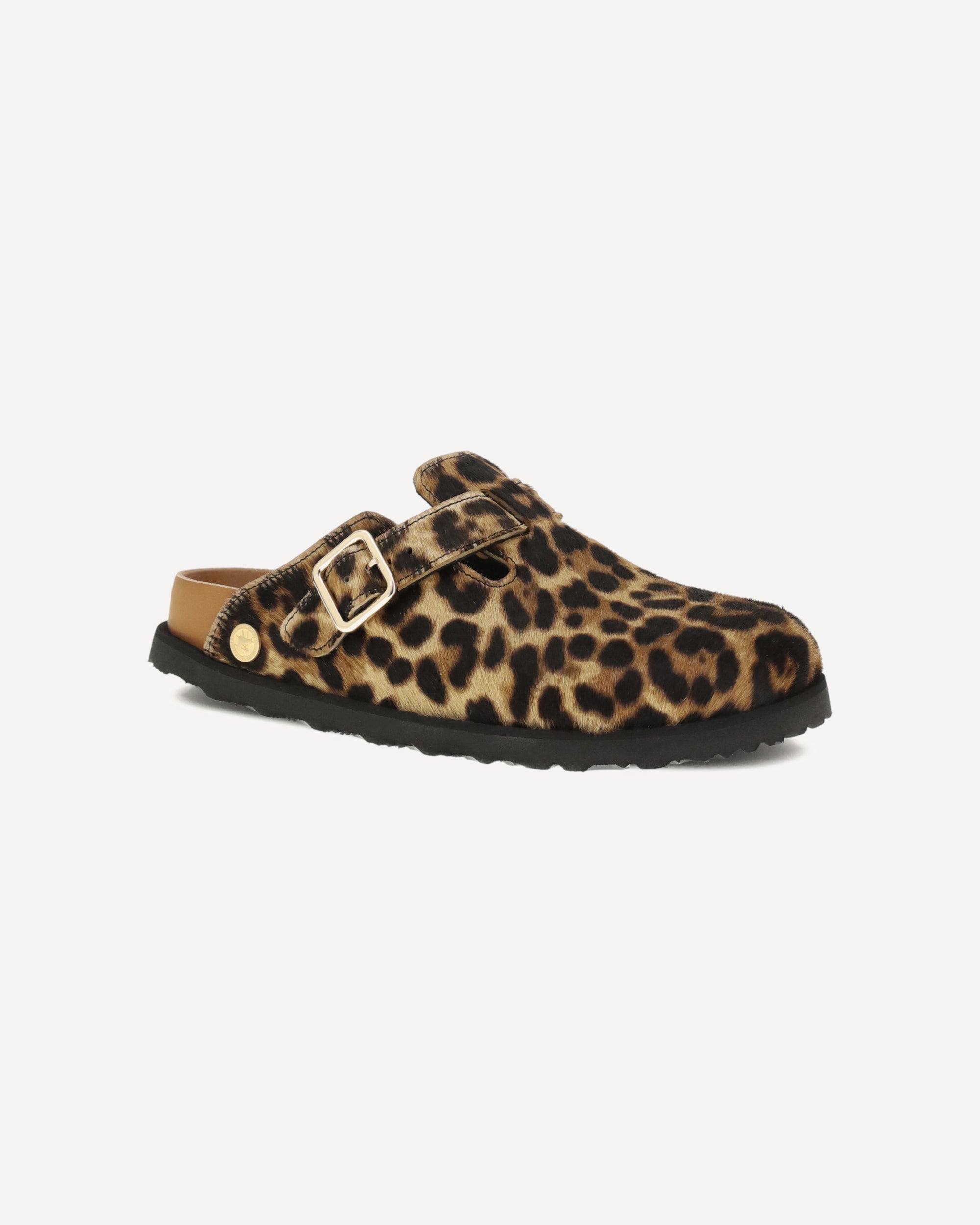 The Boston Pony Hair Mules by Birkenstock 1774 revisit a brand classic in a bold, contemporary key. Featuring a spotted pony skin upper, they catch the eye with their distinctive, textured design. The anatomically shaped Soft Footbed provides superior comfort, while the suede footbed and EVA outsole ensure lightweight cushioning. The adjustable metal buckle strap allows for a customized fit, combining style and iconic functionality.