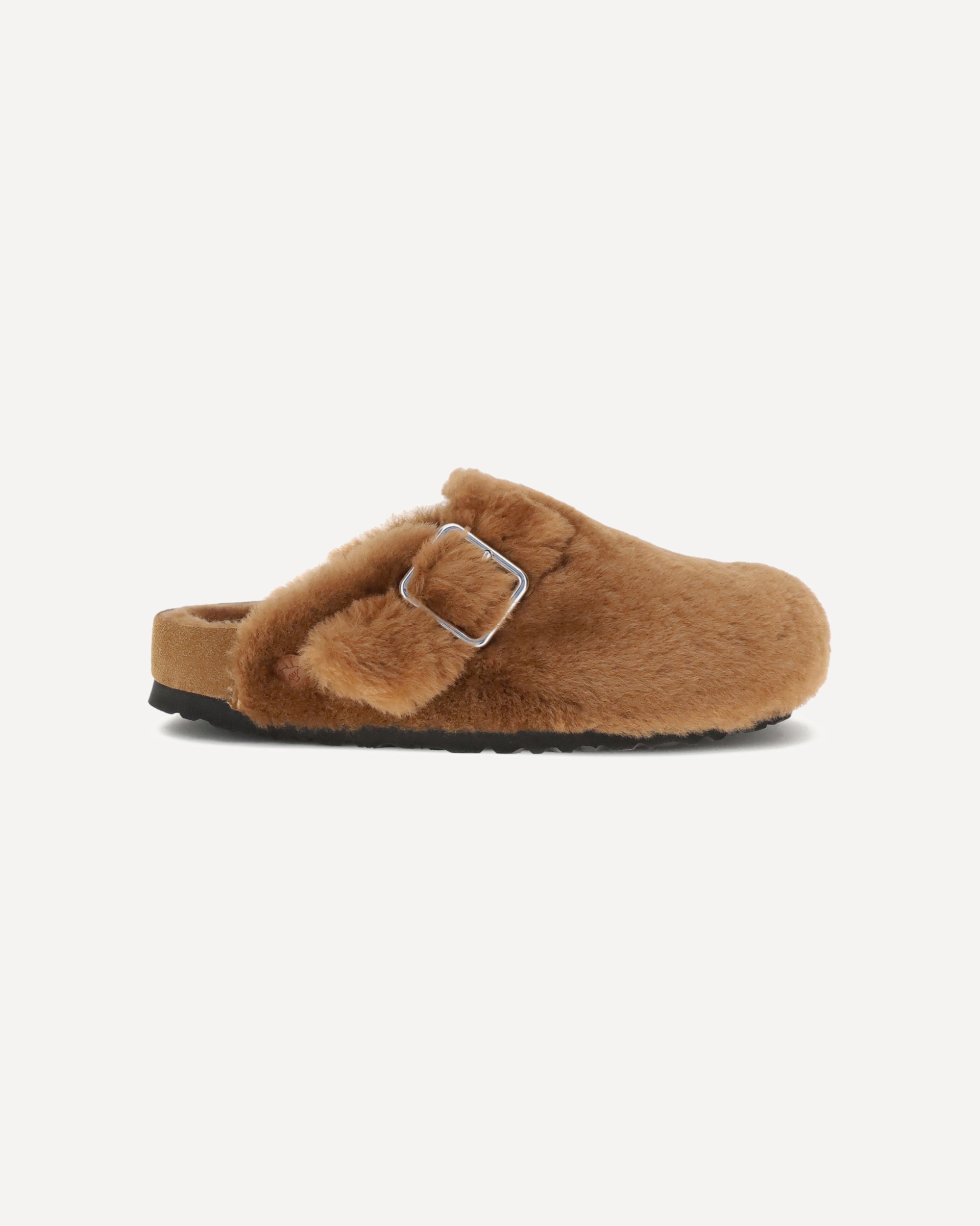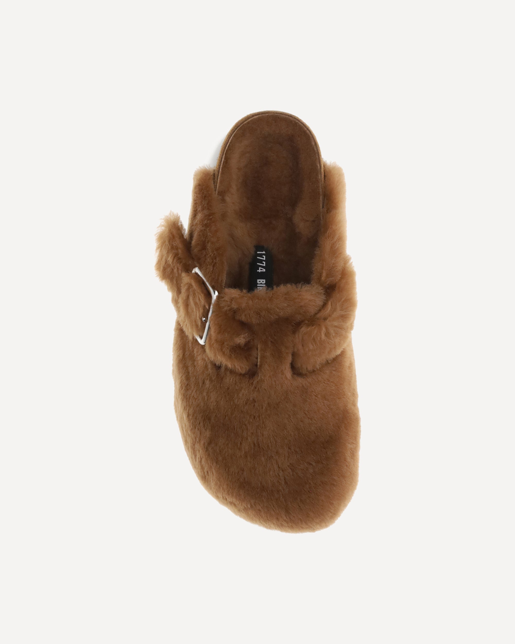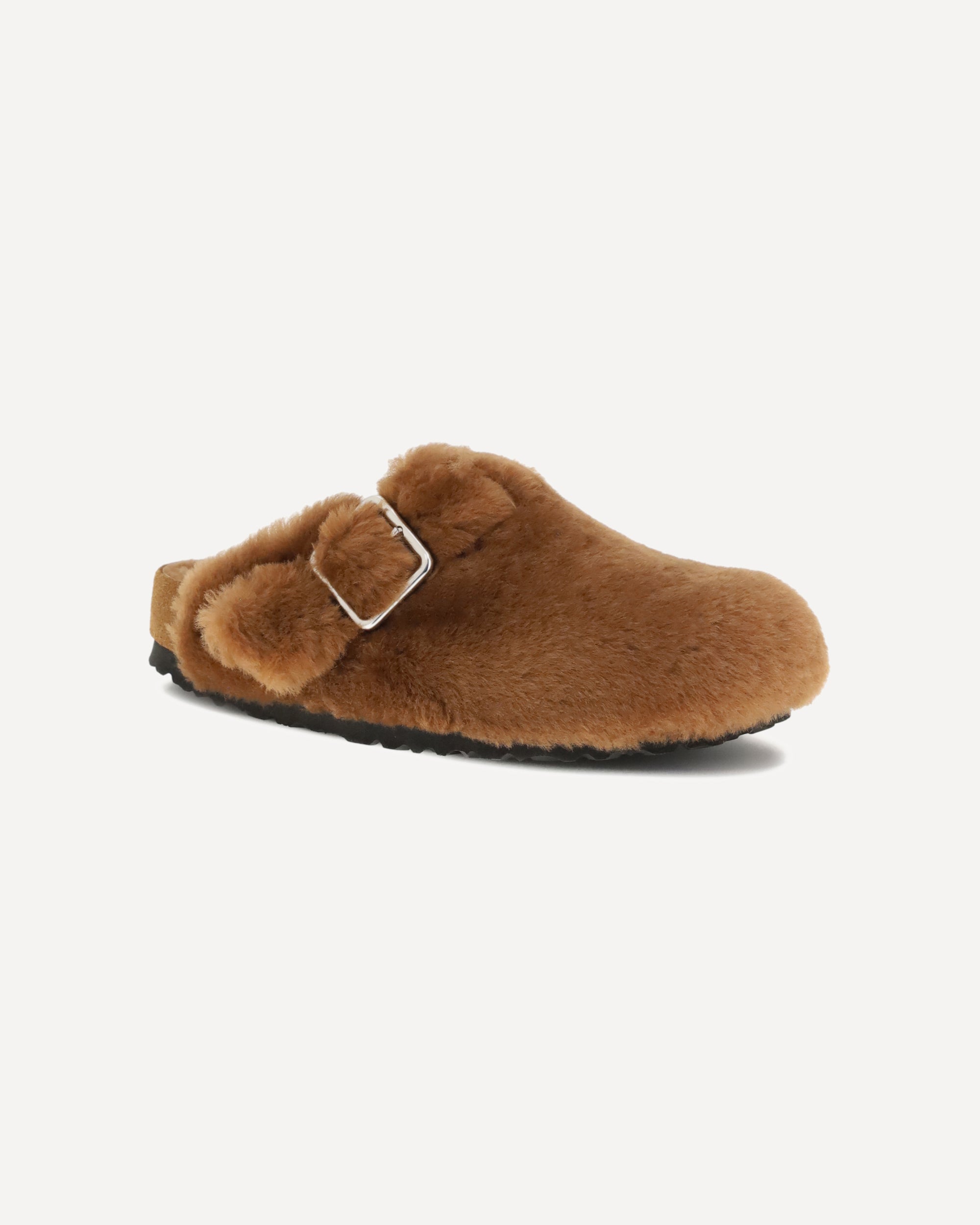 Shearling Boston Mules by Birkenstock 1774 offer the perfect blend of comfort and refined style. Made with a soft fur lining and a warm lamb fur footbed, they are designed to wrap the foot in a hug of softness. The anatomical cork and latex footbed provides ideal support, while the EVA sole ensures lightness and flexibility. Adjustable metal buckles complete the design for a customized fit and timeless aesthetic.