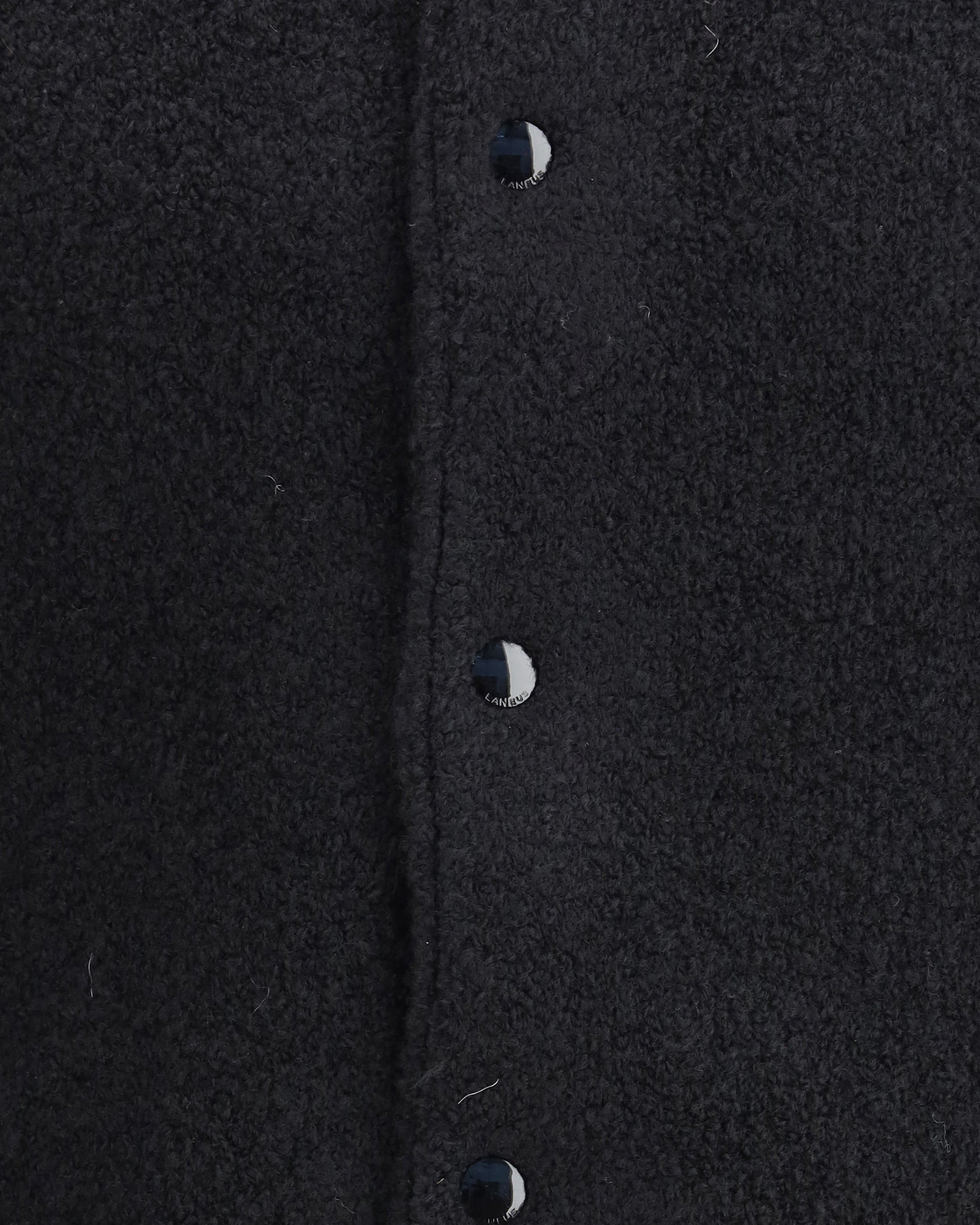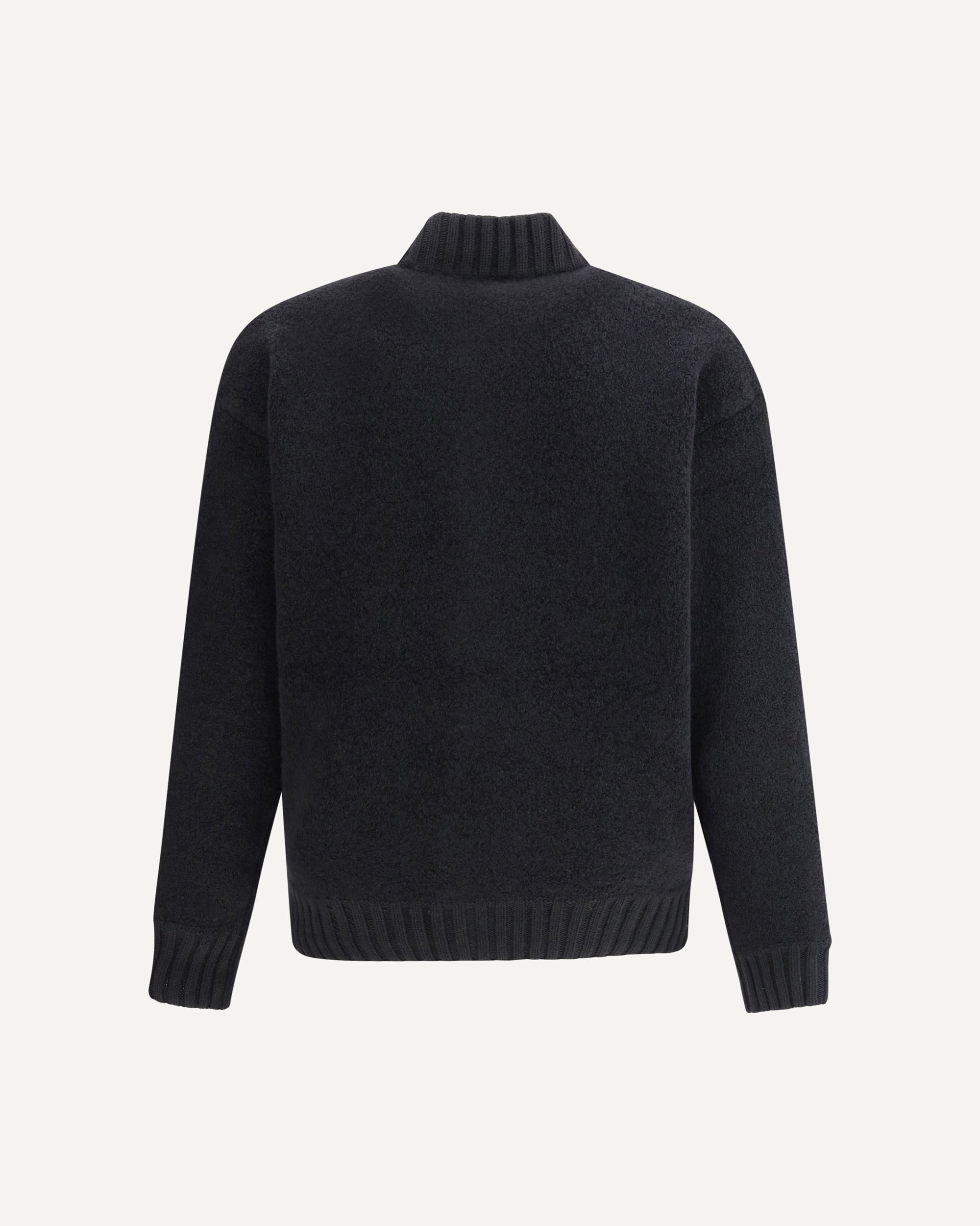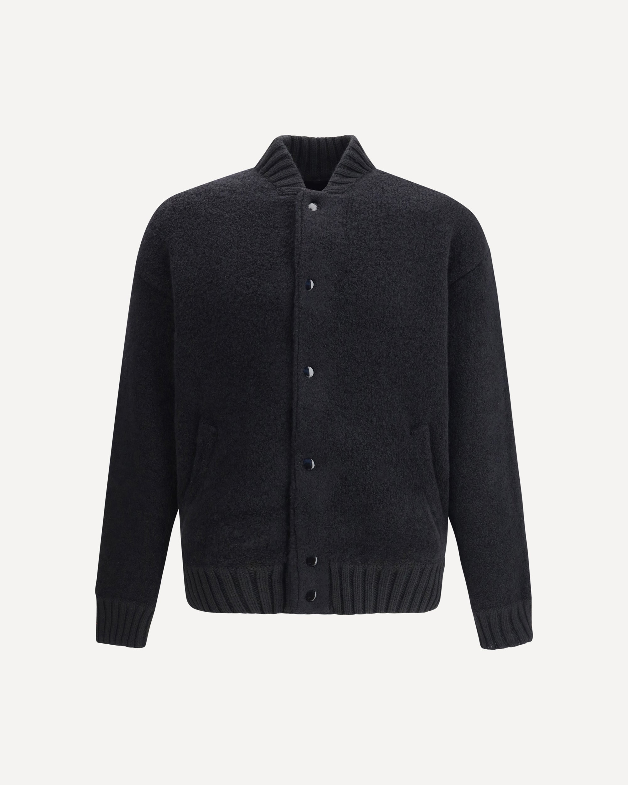 The wool bouclé Bomber by Laneus redefines knitwear through a balance of relaxed elegance and modern attitude. Crafted from Merino wool yarn, it features a regular silhouette that blends comfort with everyday sophistication. The snap-button closure and welt pockets enhance its clean design, while the ribbed collar, cuffs, and hem provide subtle structure. Made in Italy, this piece celebrates the harmony between craftsmanship and contemporary style.