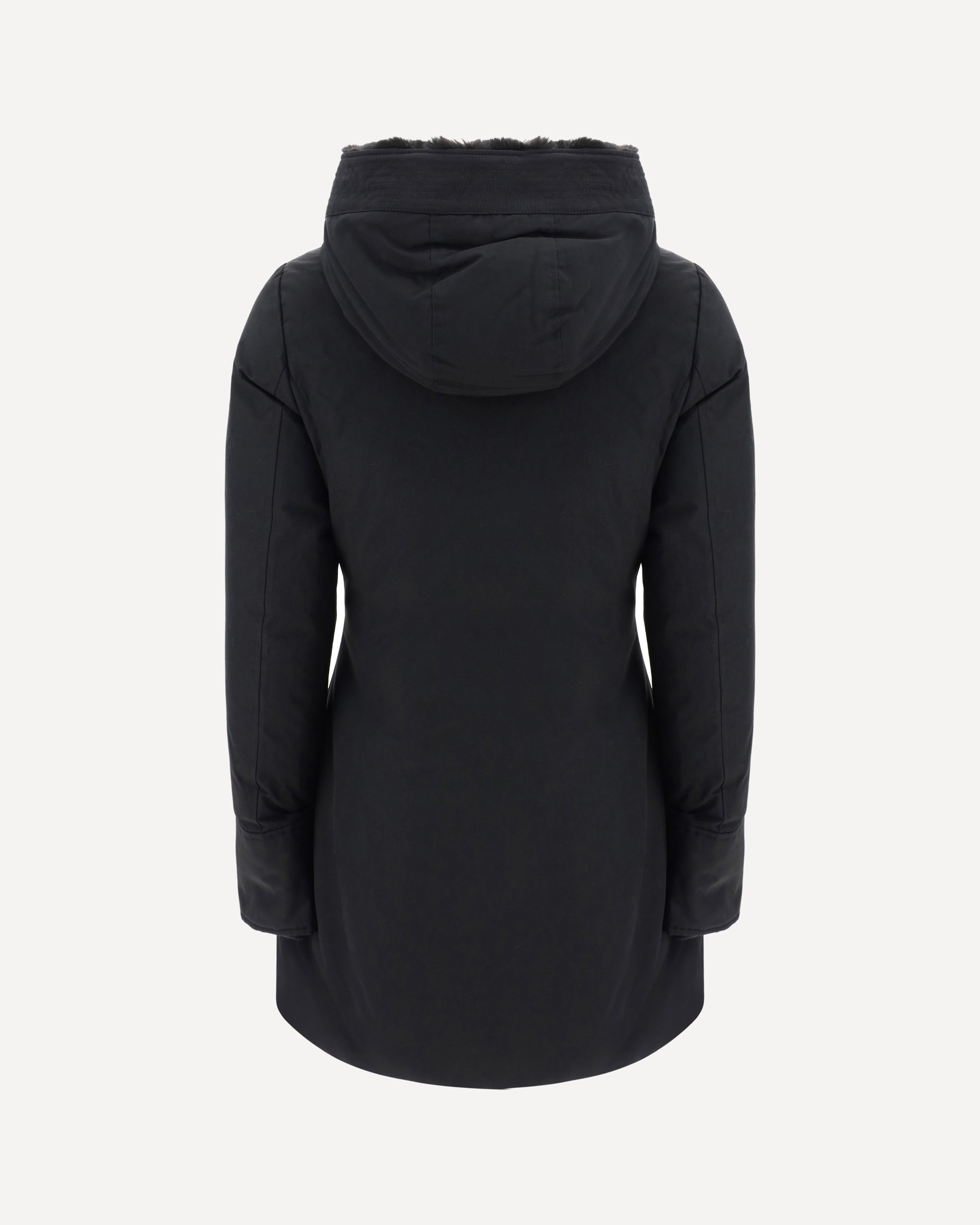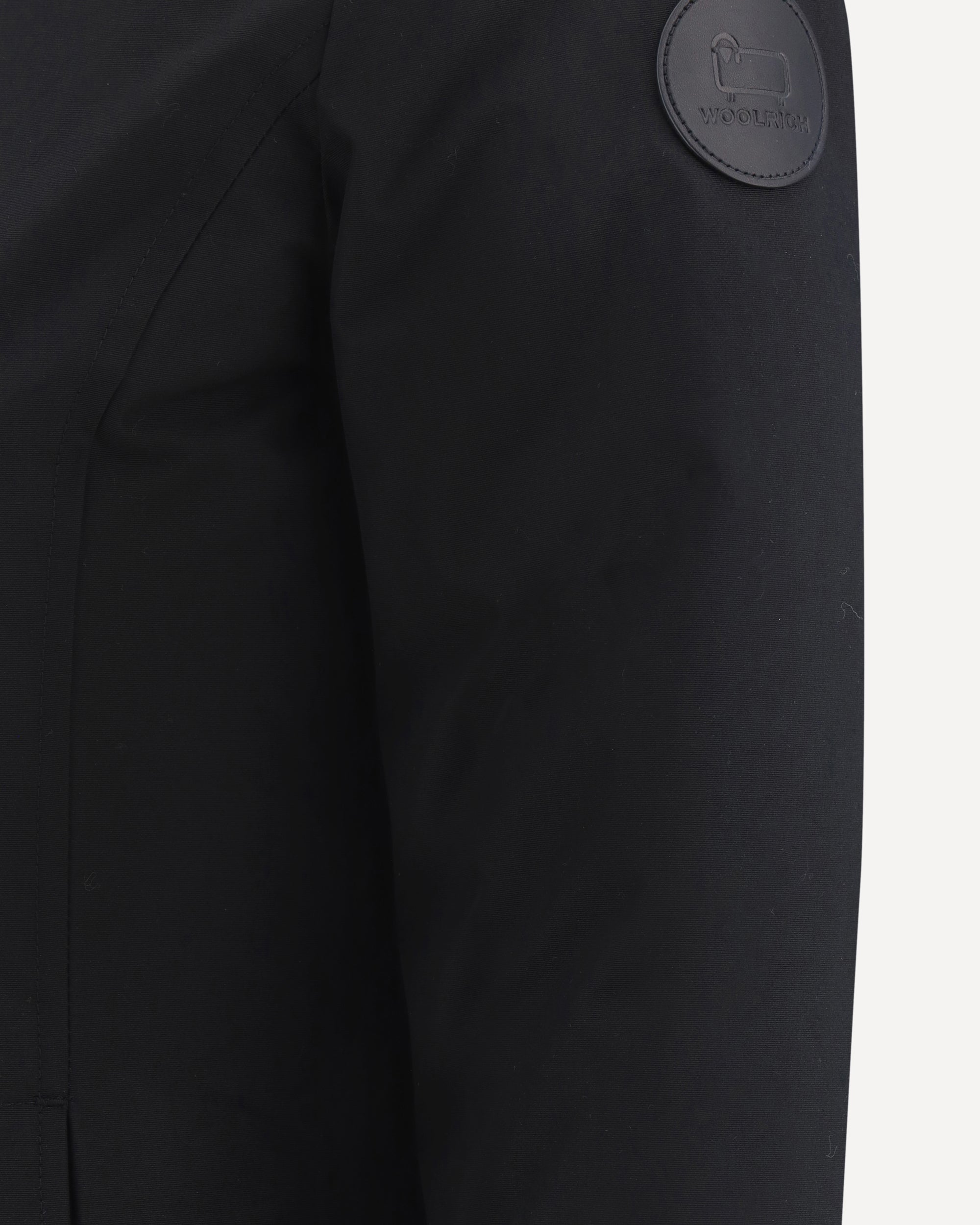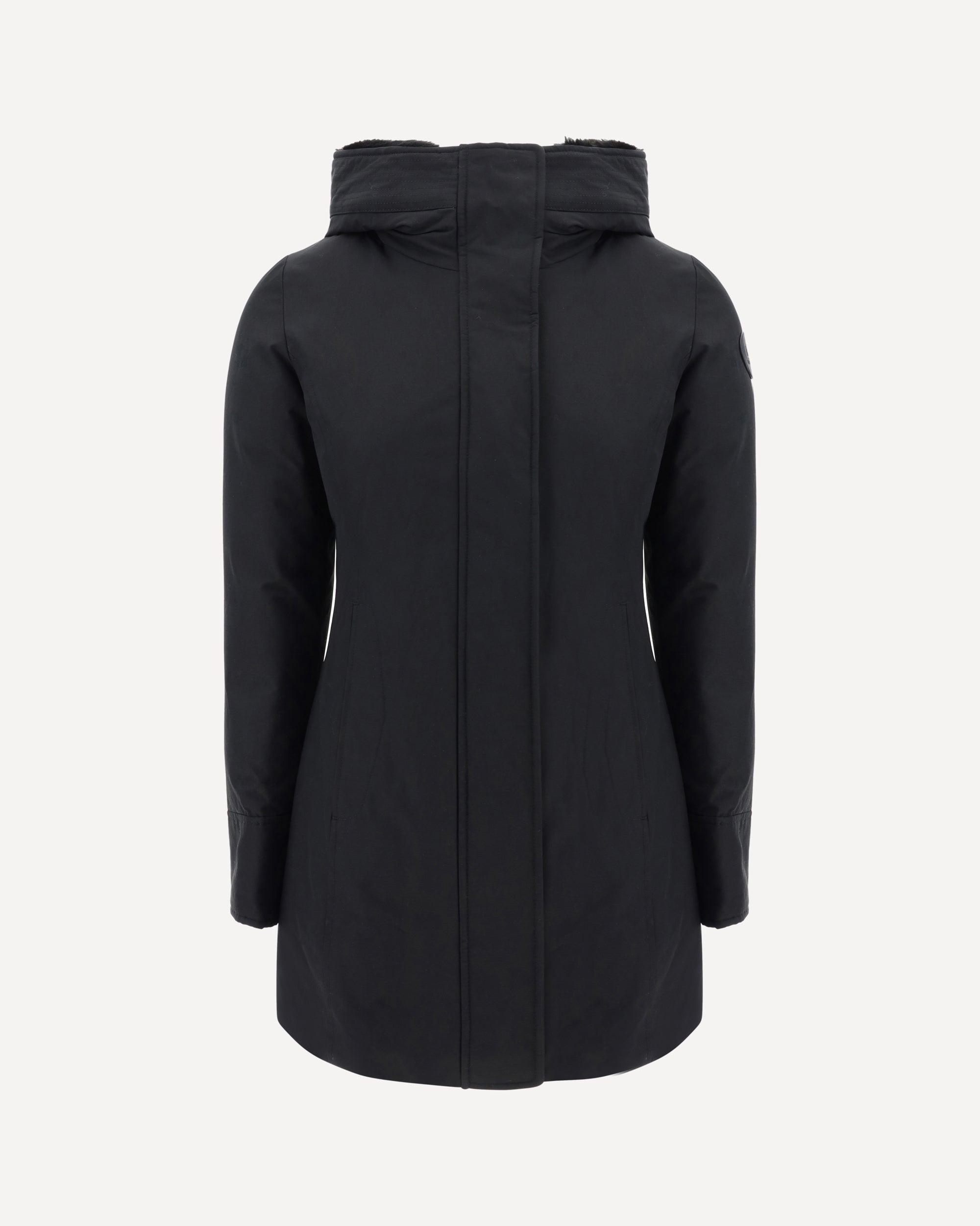 Boulder Down Jacket by Woolrich, front zipper closure with concealed snap buttons, faux fur-lined hood design, elastic ribbed cuffs, padded and quilted inner lining design, buttoned welt pockets, brand's iconic logo patch applied on left shoulder.