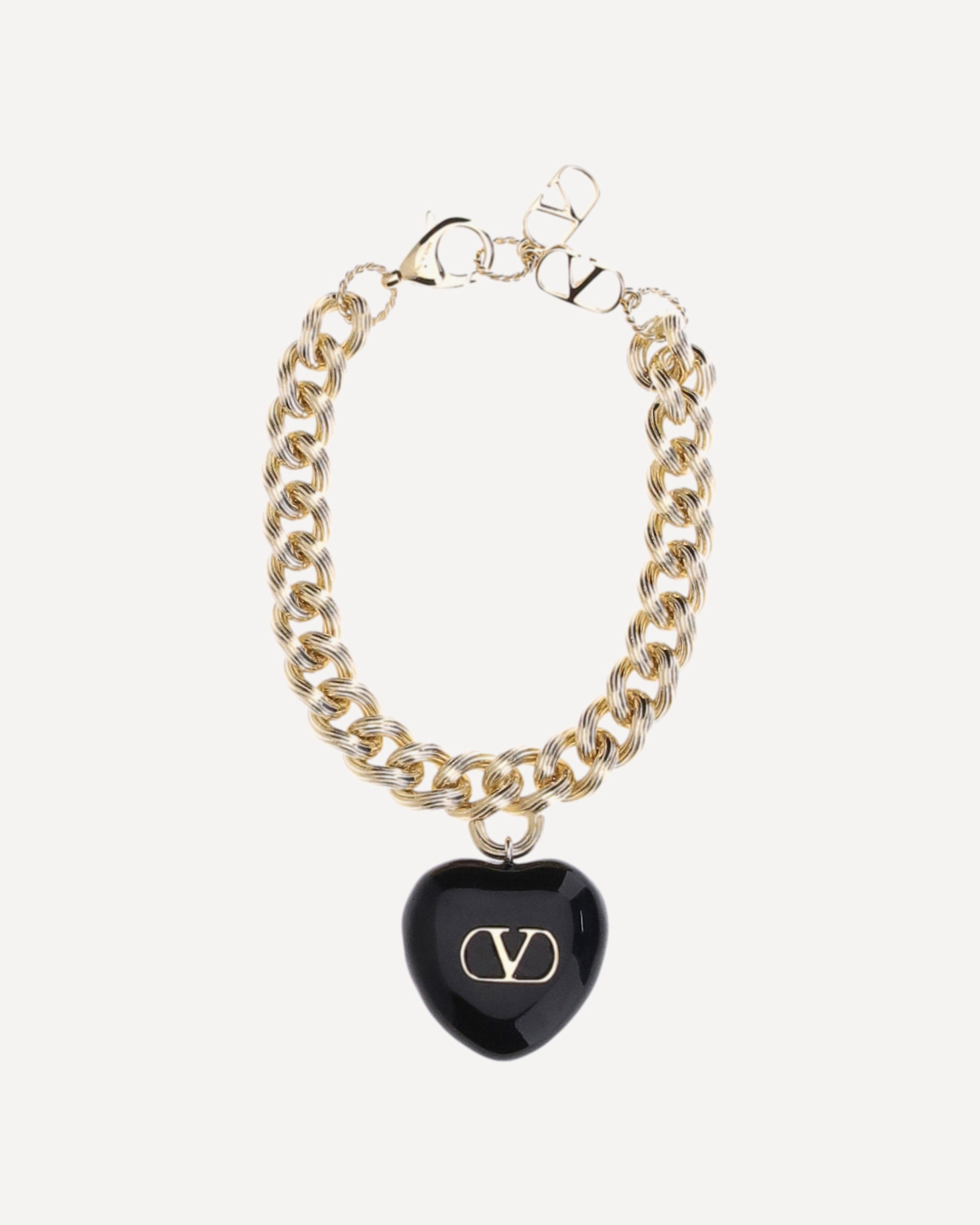 The Coeur Royal chain Bracelet by Valentino Garavani is a refined and romantic piece of jewelry made of gold-plated metal. Featuring a shiny black heart-shaped charm, it is embellished with the iconic Signature VLogo on the front and delicate openwork on the back. The swivel lobster clasp ensures practicality and security. An elegant accessory, perfect for adding a distinctive and feminine touch to any look.