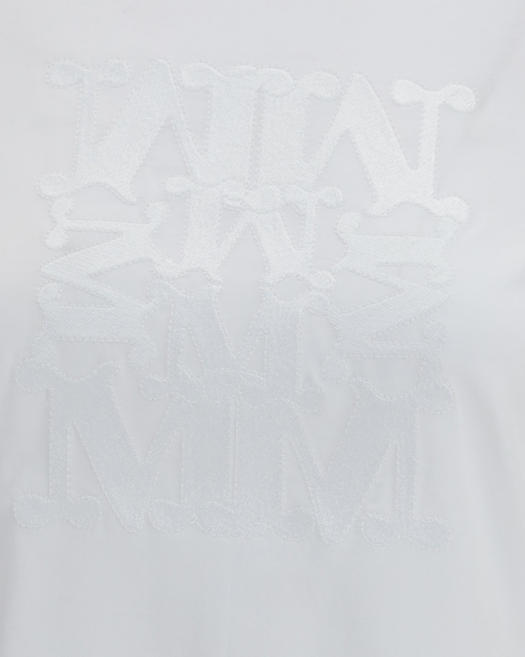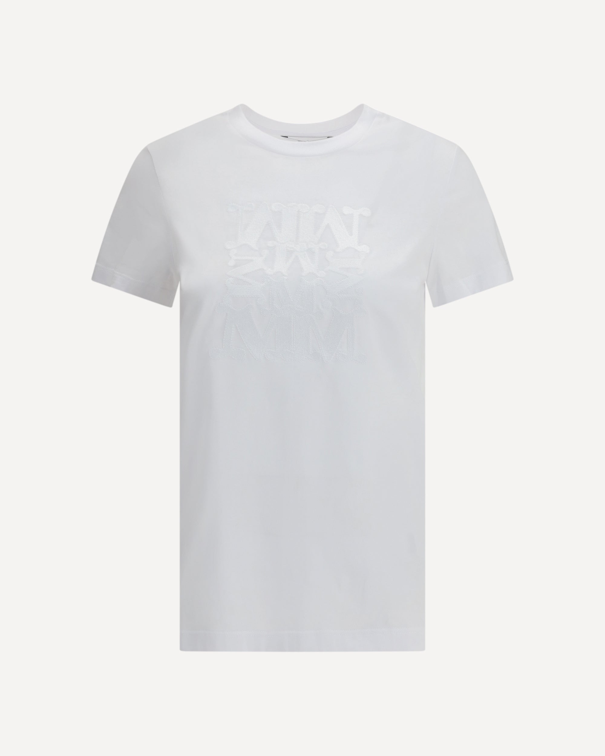 The short-sleeve T-shirt by Max Mara is an essential piece made of soft cotton jersey, enhanced by the tone-on-tone embroidered Monogram motif on the front for an understated touch of style. The micro ribbed worked crew neck and regular fit make this T-shirt a great choice for a casual yet polished look. A versatile must-have for any wardrobe.