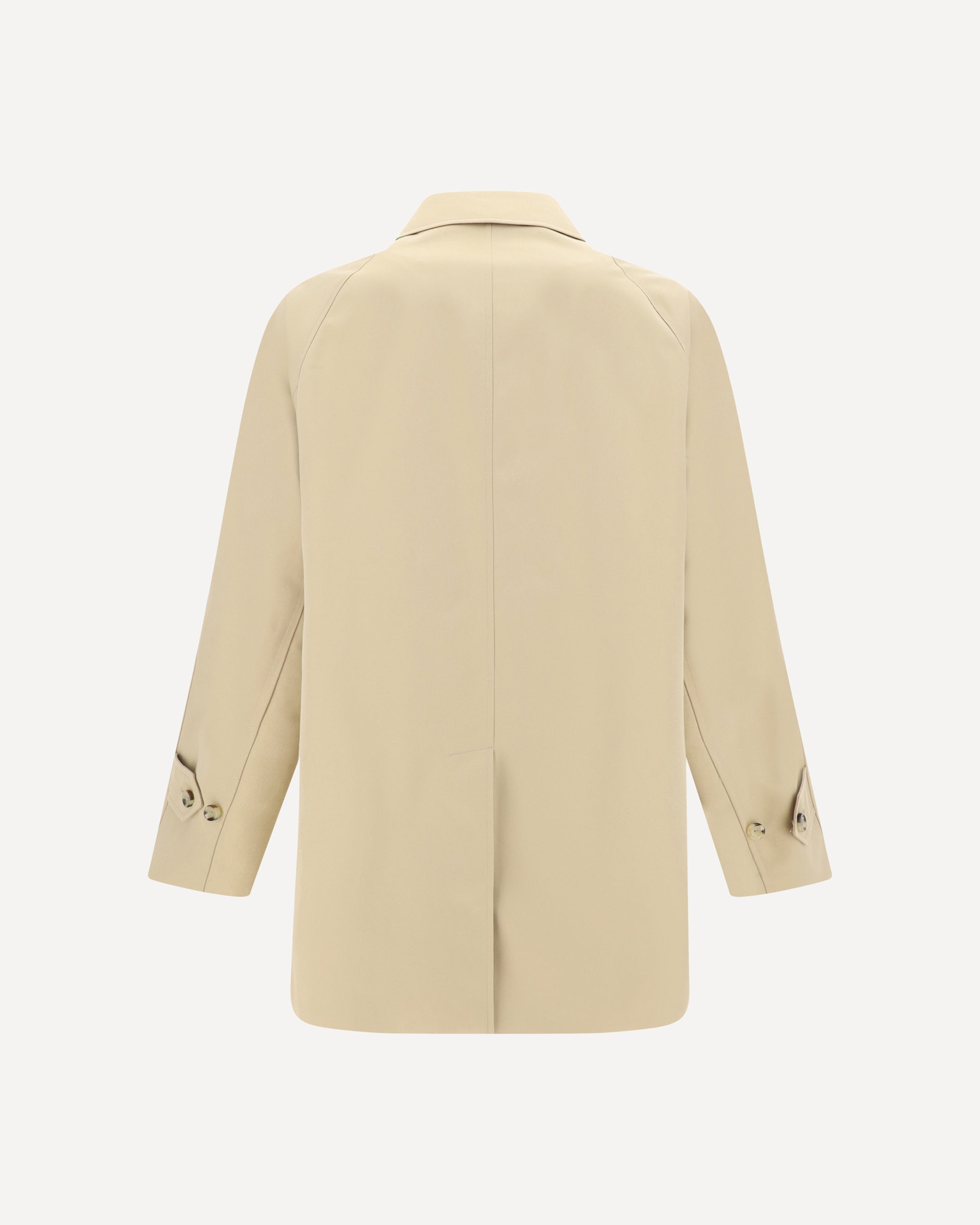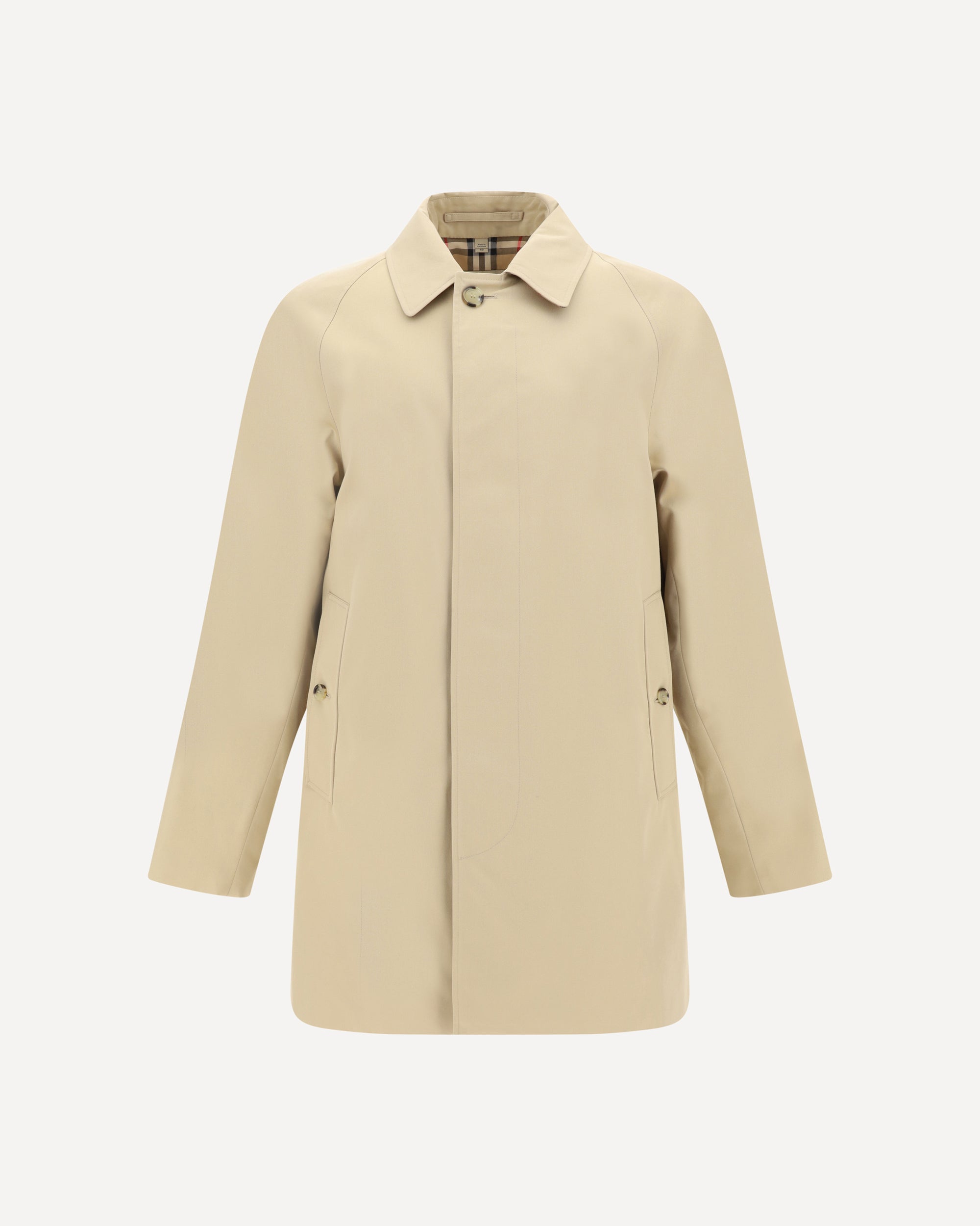 Cotton Camden Coat by Burberry, featuring a classic collar, a concealed button front closure, two side welt pockets, an interior with iconic all-over Check Archivio pattern, a back slit, and a regular fit.