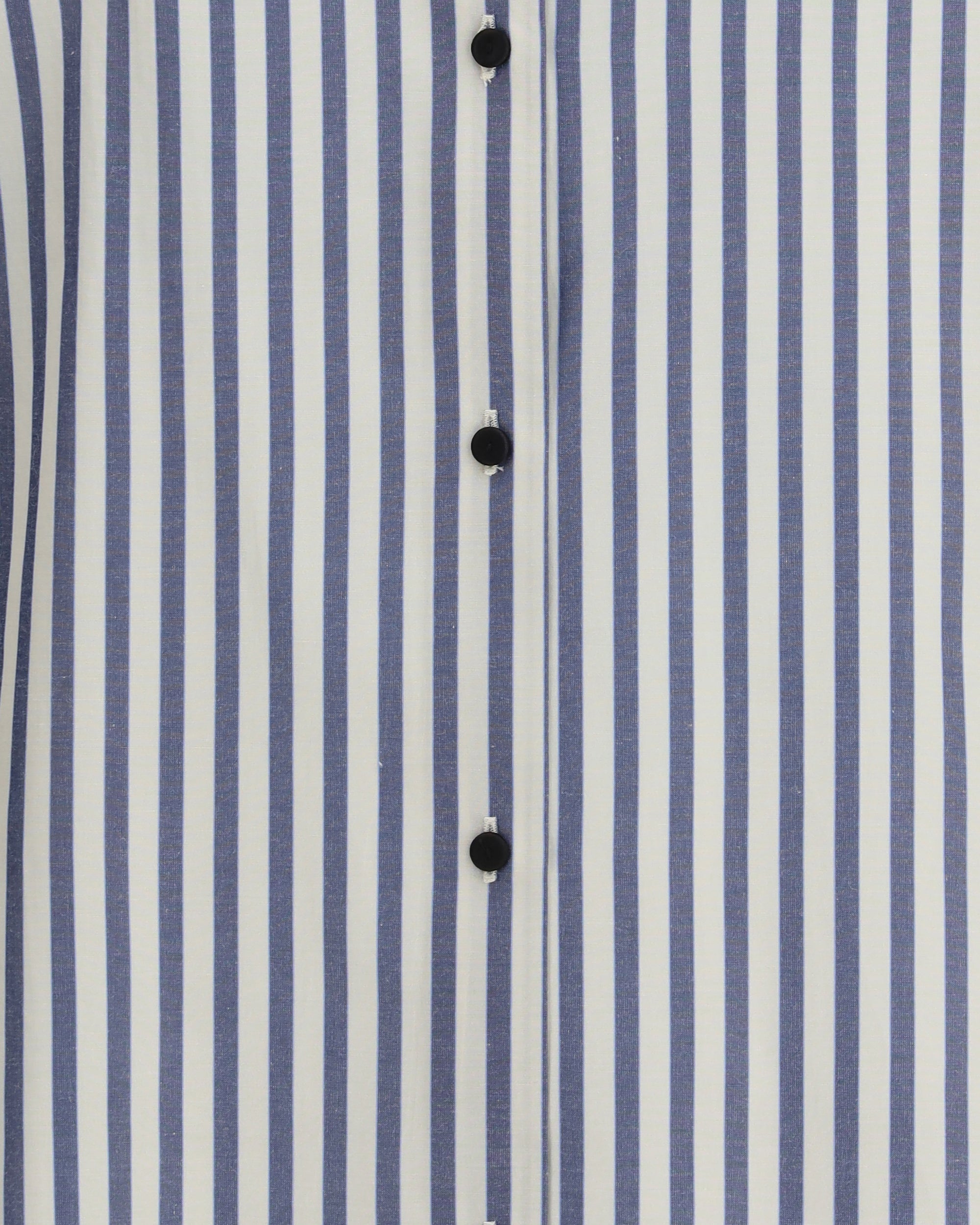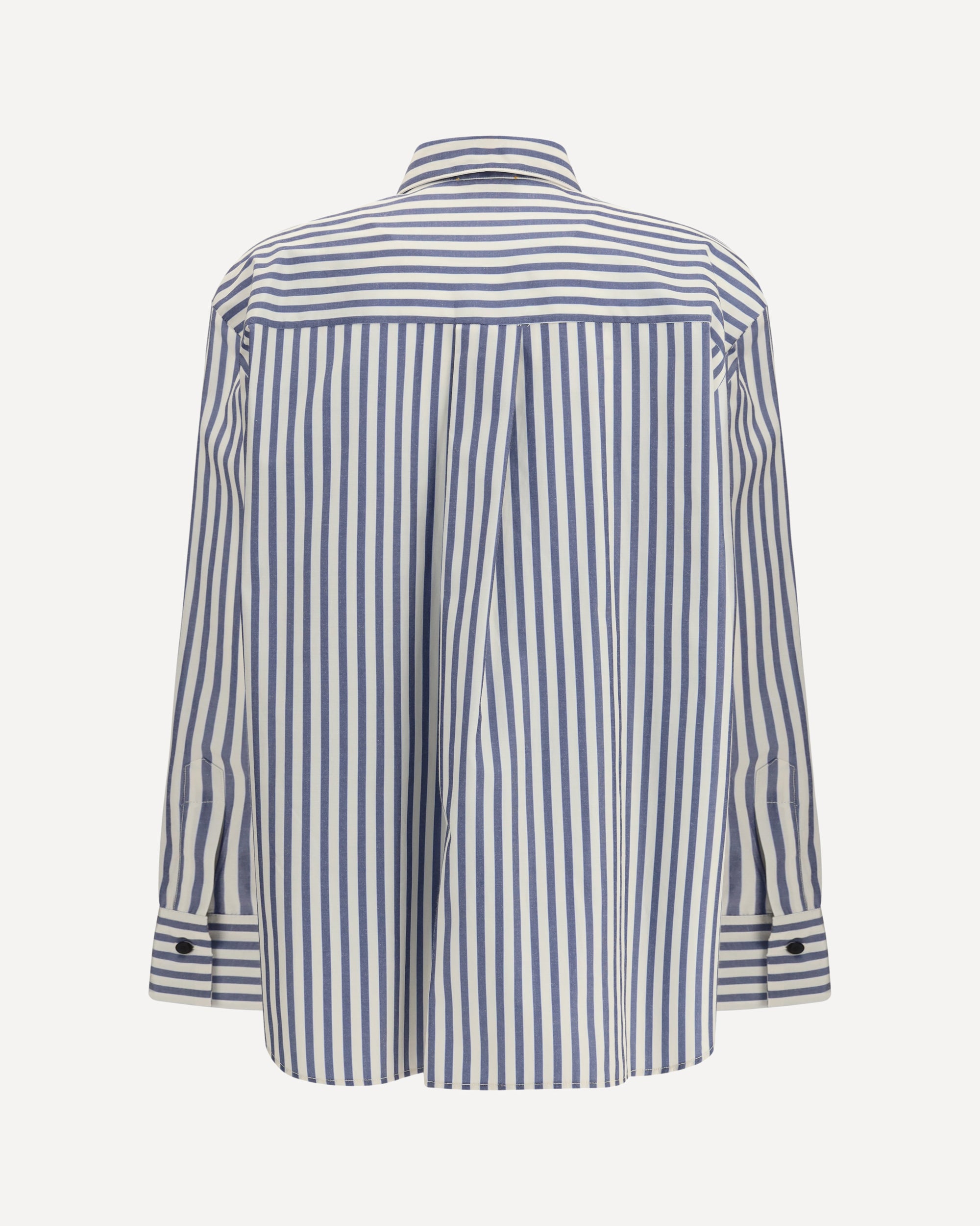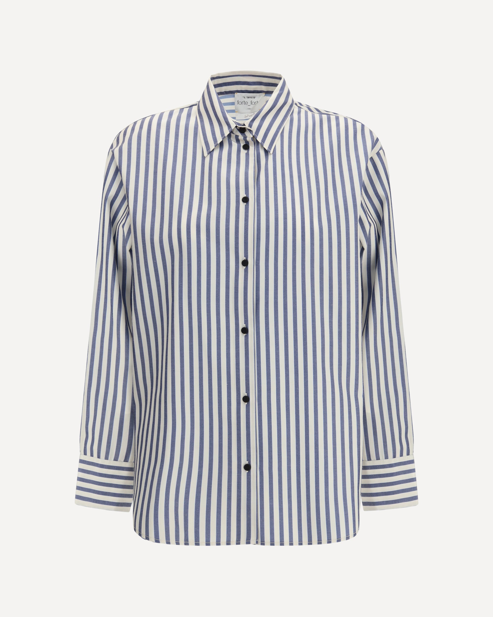 The striped Taffetà Shirt by Forte Forte reimagines the masculine cut in an oversized key, introducing a Riviera-inspired note into everyday wear. The rounded hem and generously proportioned collar add freshness and a bold character, while the ample volume lends the piece a relaxed and effortless elegance.