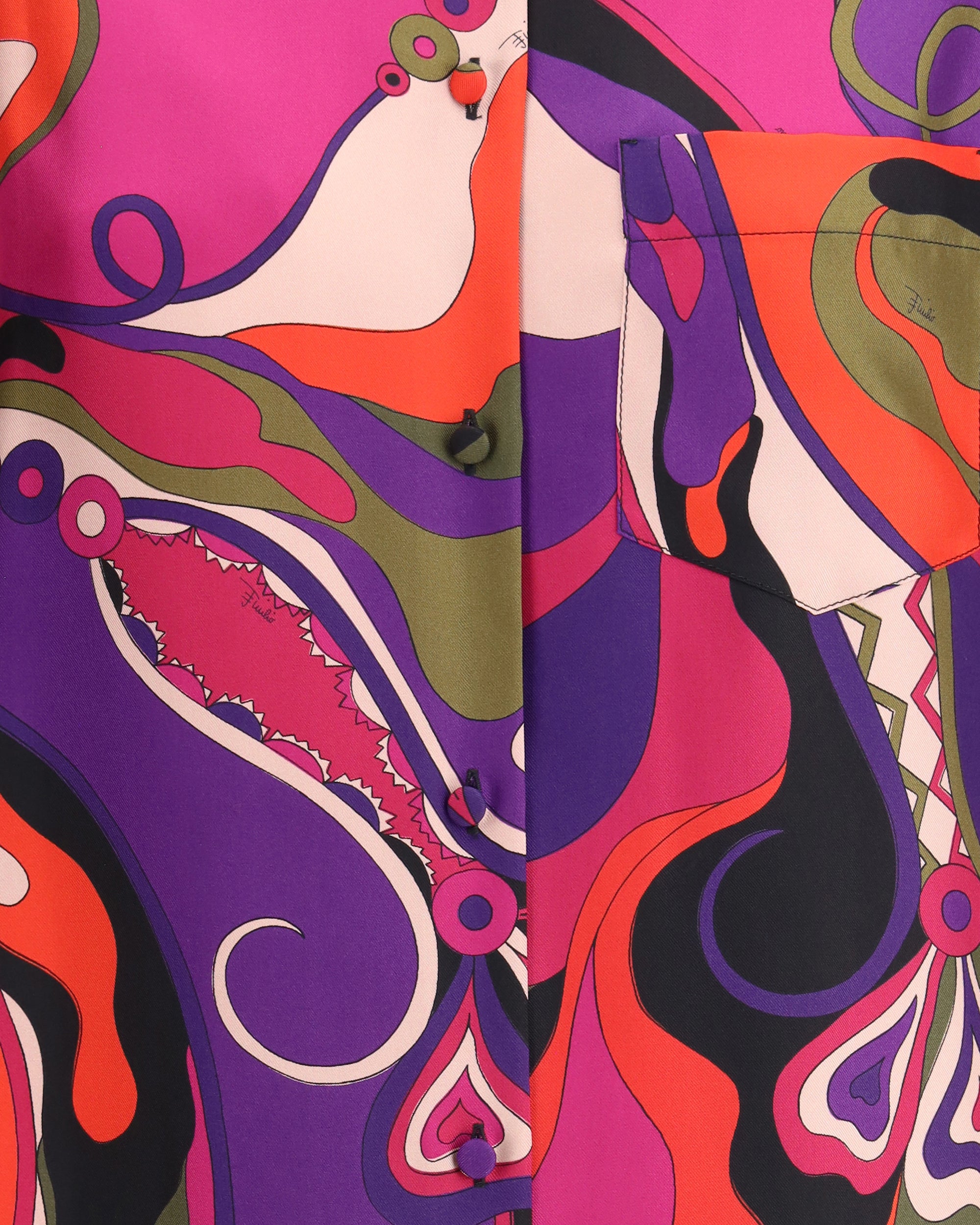 The Silk Shirt with Abstract Print by Pucci offers a fresh, sophisticated take on an essential wardrobe piece. The slightly oversized fit drapes naturally, creating a contemporary allure, while the lightweight, soft fabric ensures comfort and refinement in every movement. The classic design with collar and button closure is enriched by a side pocket, a practical detail that discreetly completes the look. The all-over abstract print makes each shirt unique and unrepeatable, a true expression of the brand’s creativity.