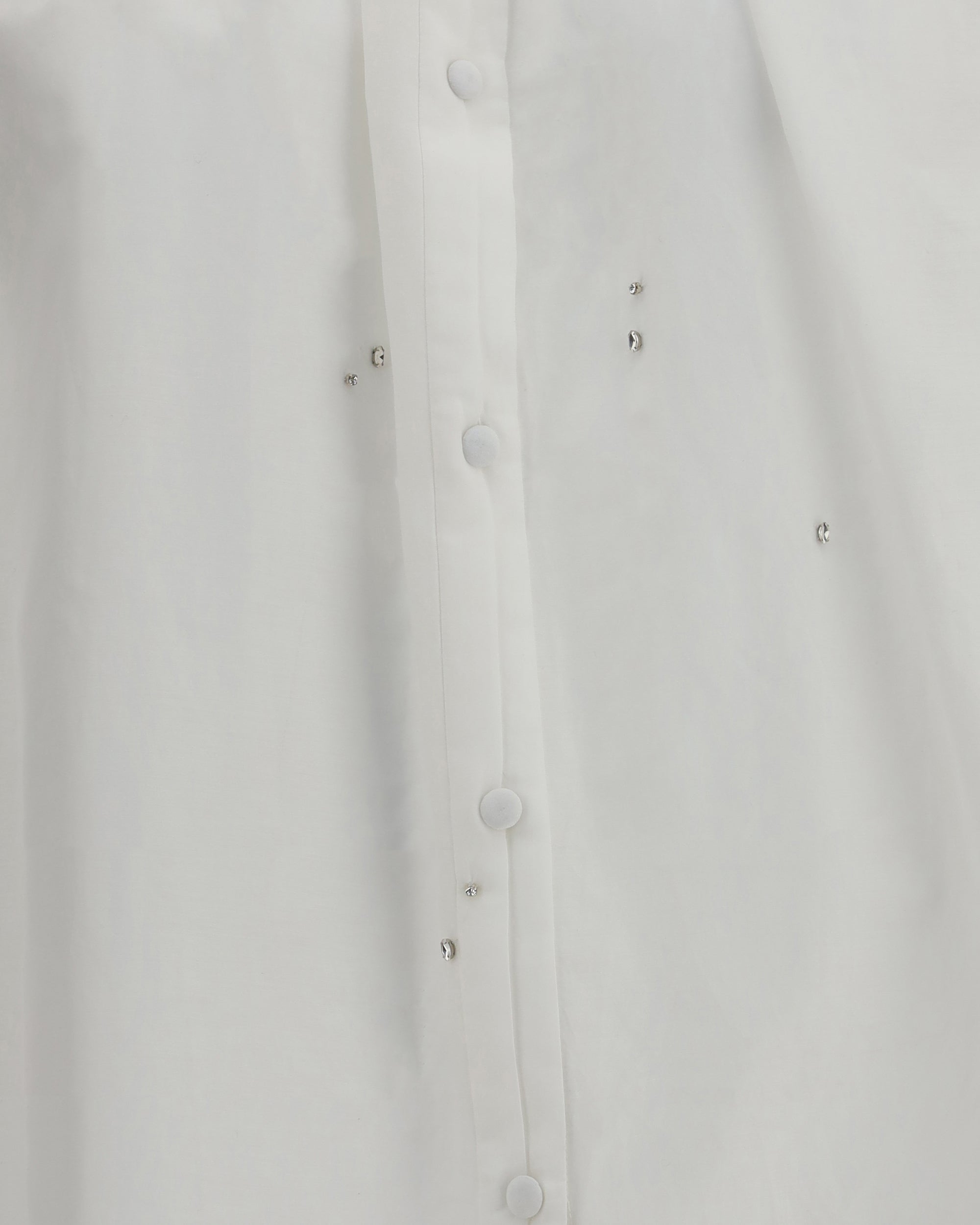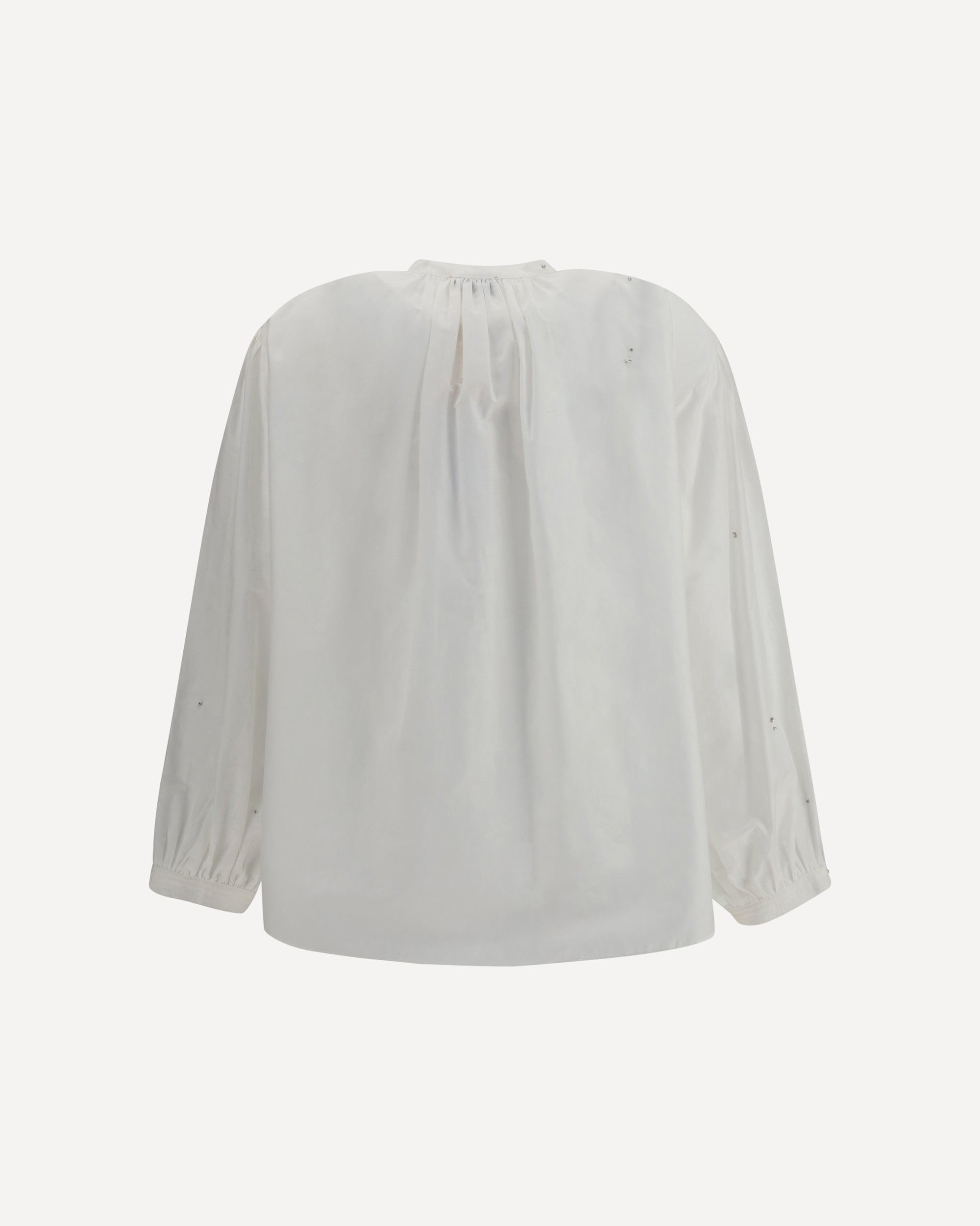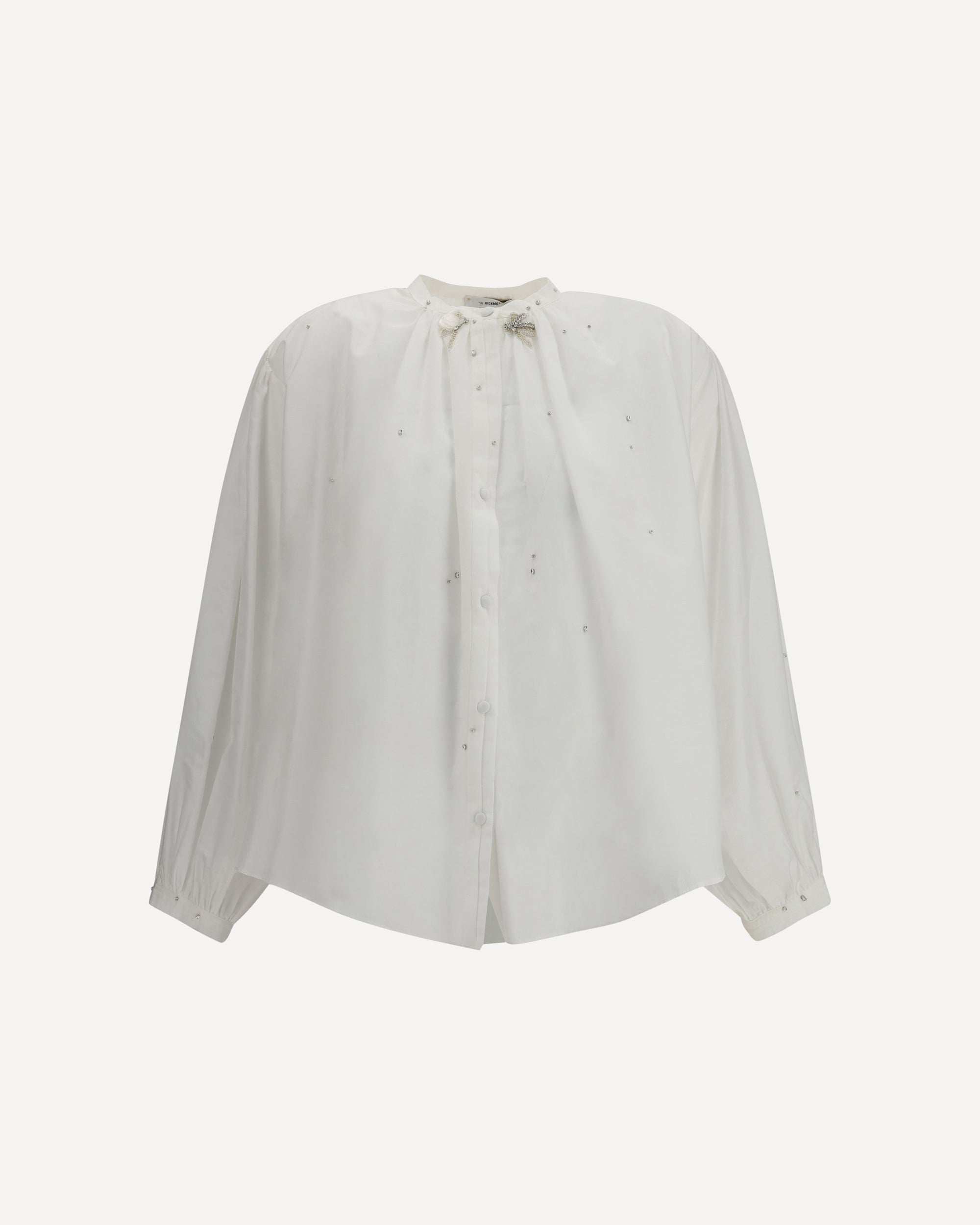 Forte_Forte's Voile Shirt with embroidery is a romantic and sophisticated piece, featuring a mandarin collar and a front button closure. The puff sleeves give volume and femininity, while the delicate dragonfly embroidered on the front with beads adds a precious detail. The entire blouse is embellished with an elegant all-over rhinestone effect, giving it a touch of discreet and refined shine.