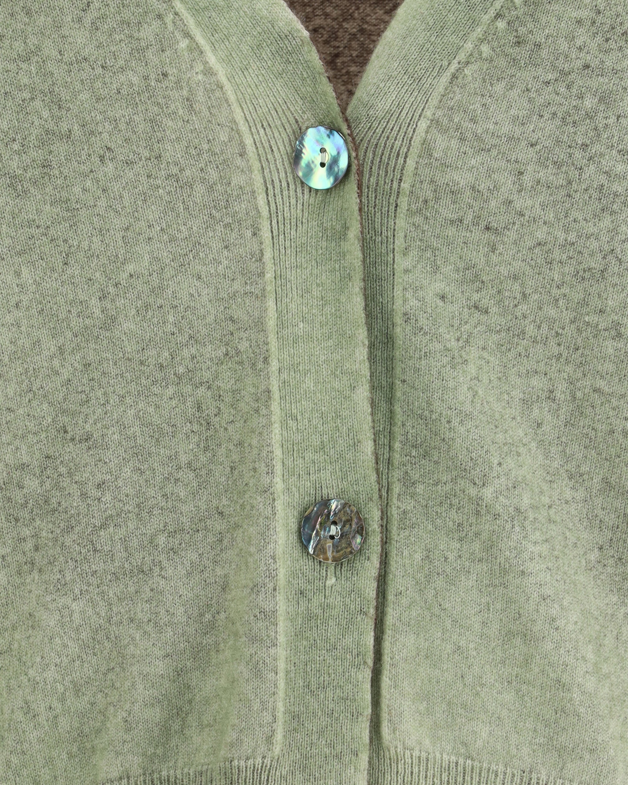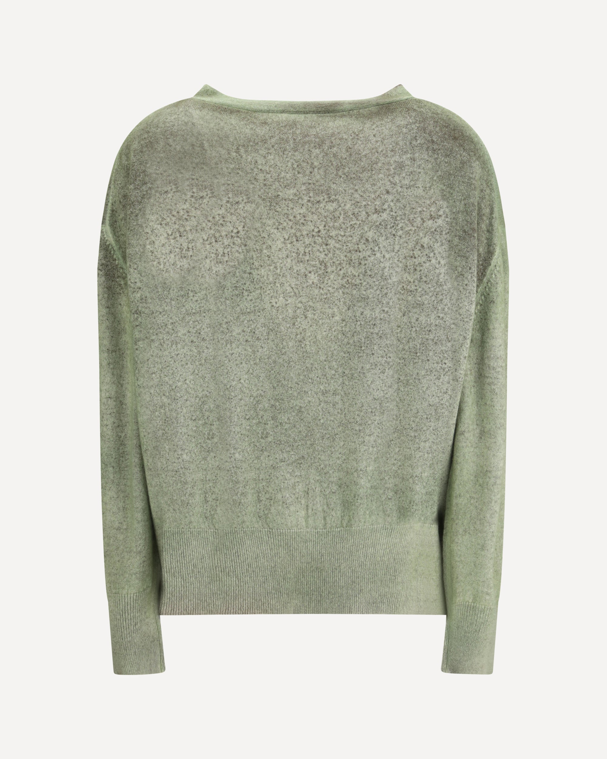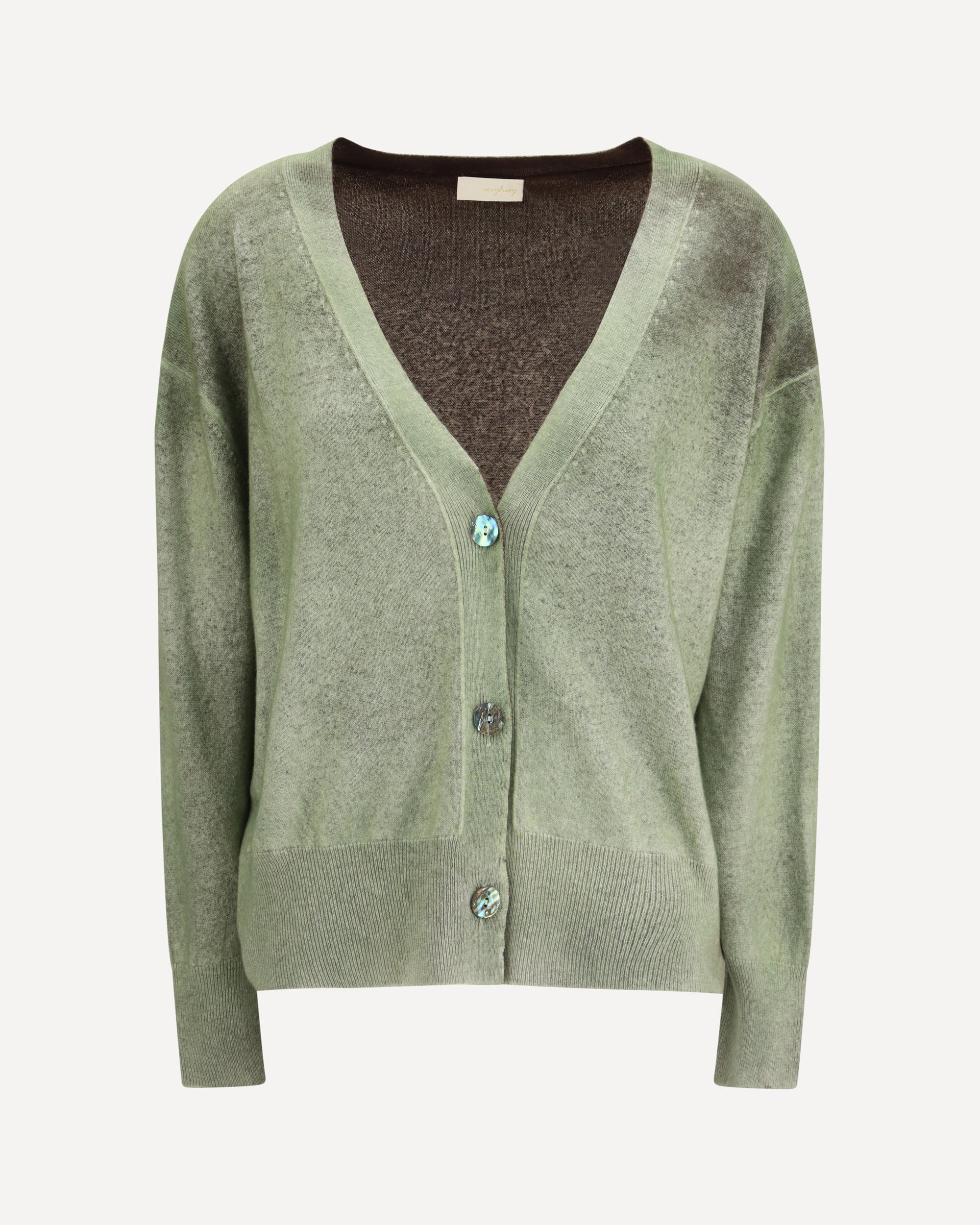 The Cardigan with a button closure with long sleeves by verybusy features a refined gradient effect that fades smoothly from deeper tones at the top to lighter hues toward the bottom. Finished with ribbed hem and cuffs, it offers a comfortable fit and a modern touch, with the color transition adding depth and character to the piece.