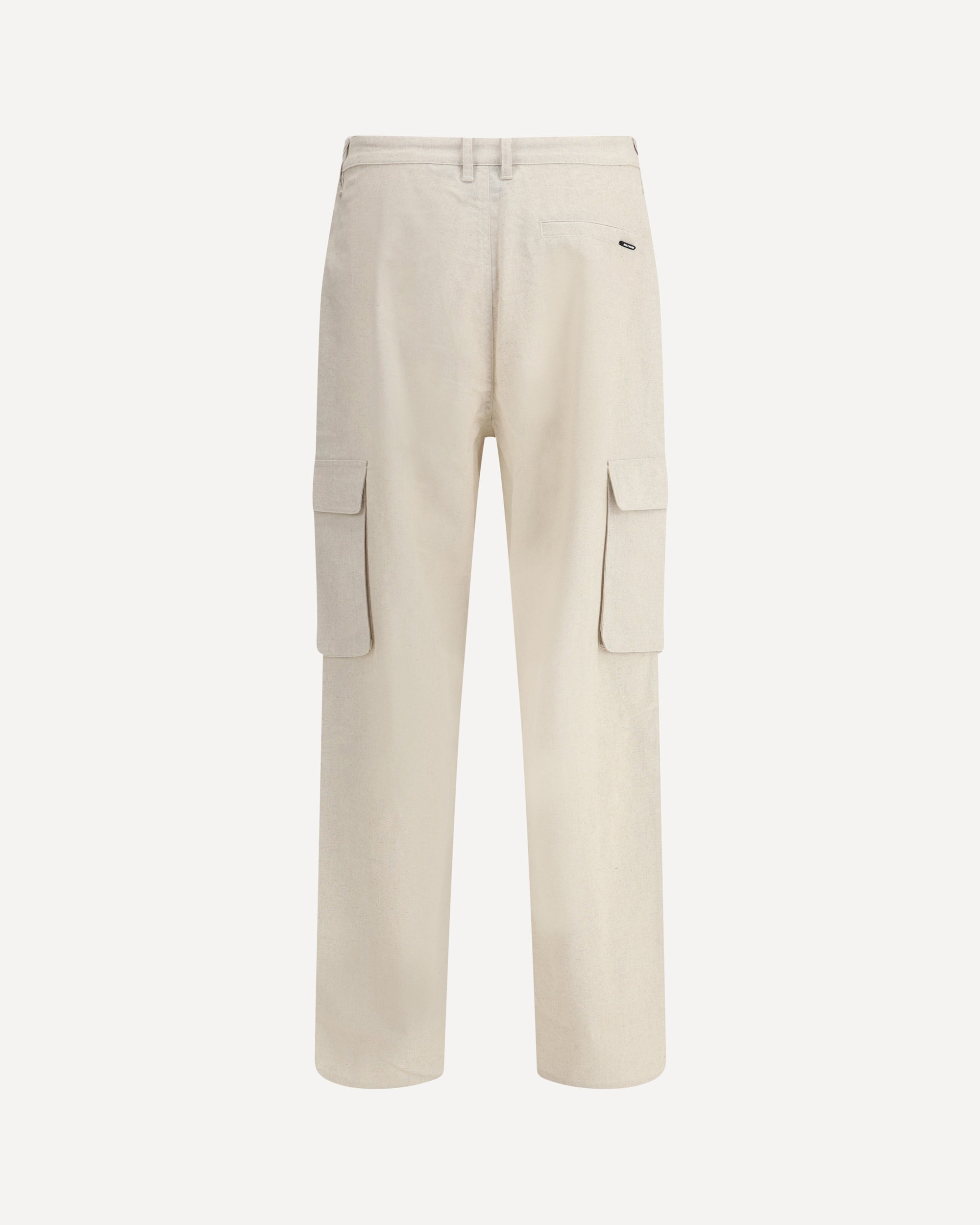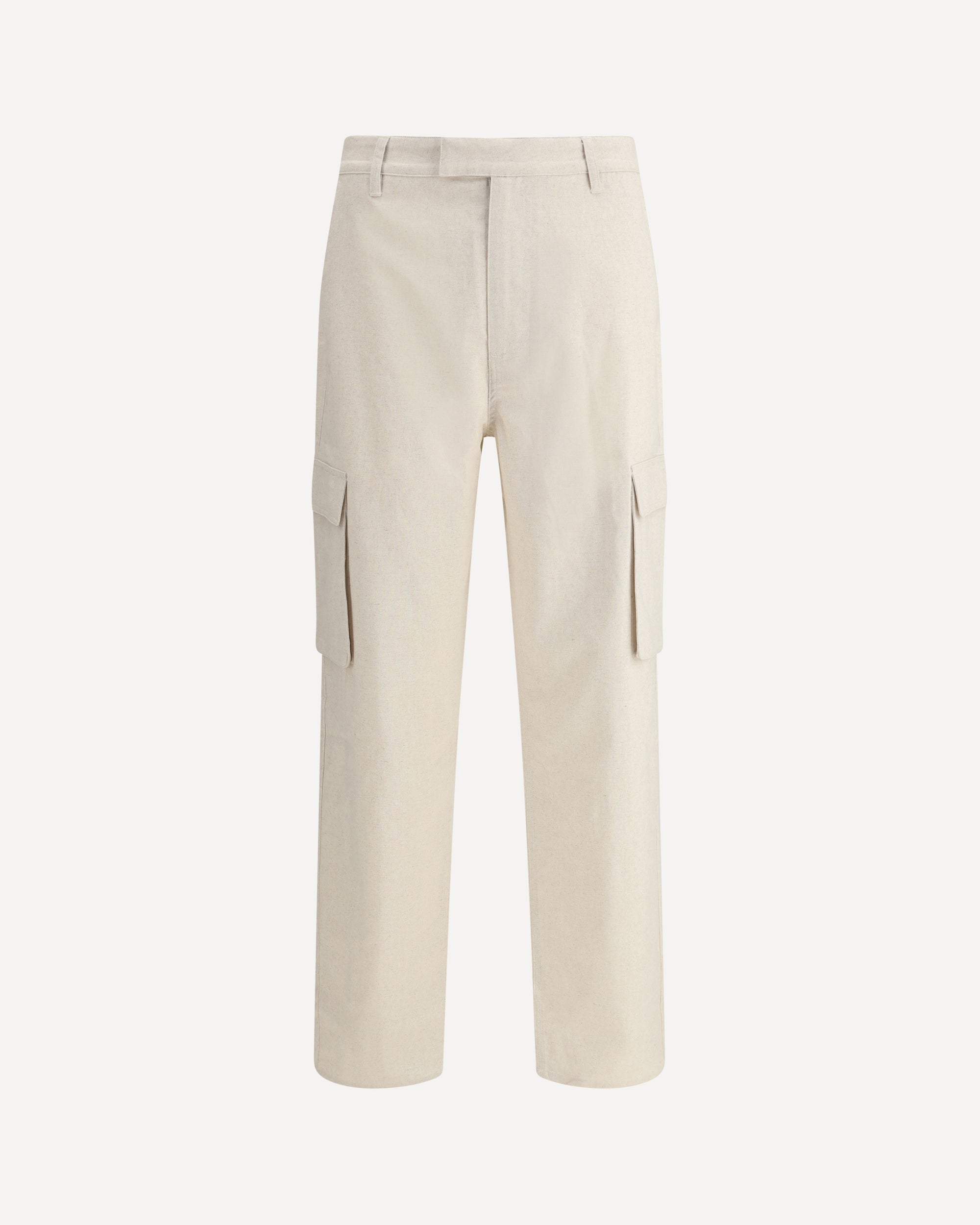 Daily Paper's Linen Pants are made of a lightweight and breathable material, ideal for warmer weather. They feature a button and zipper closure on the front for a secure and comfortable fit. Two side slash pockets and a welt pocket on the back provide practical space, while two cargo pockets on the side panels add a functional, modern touch.