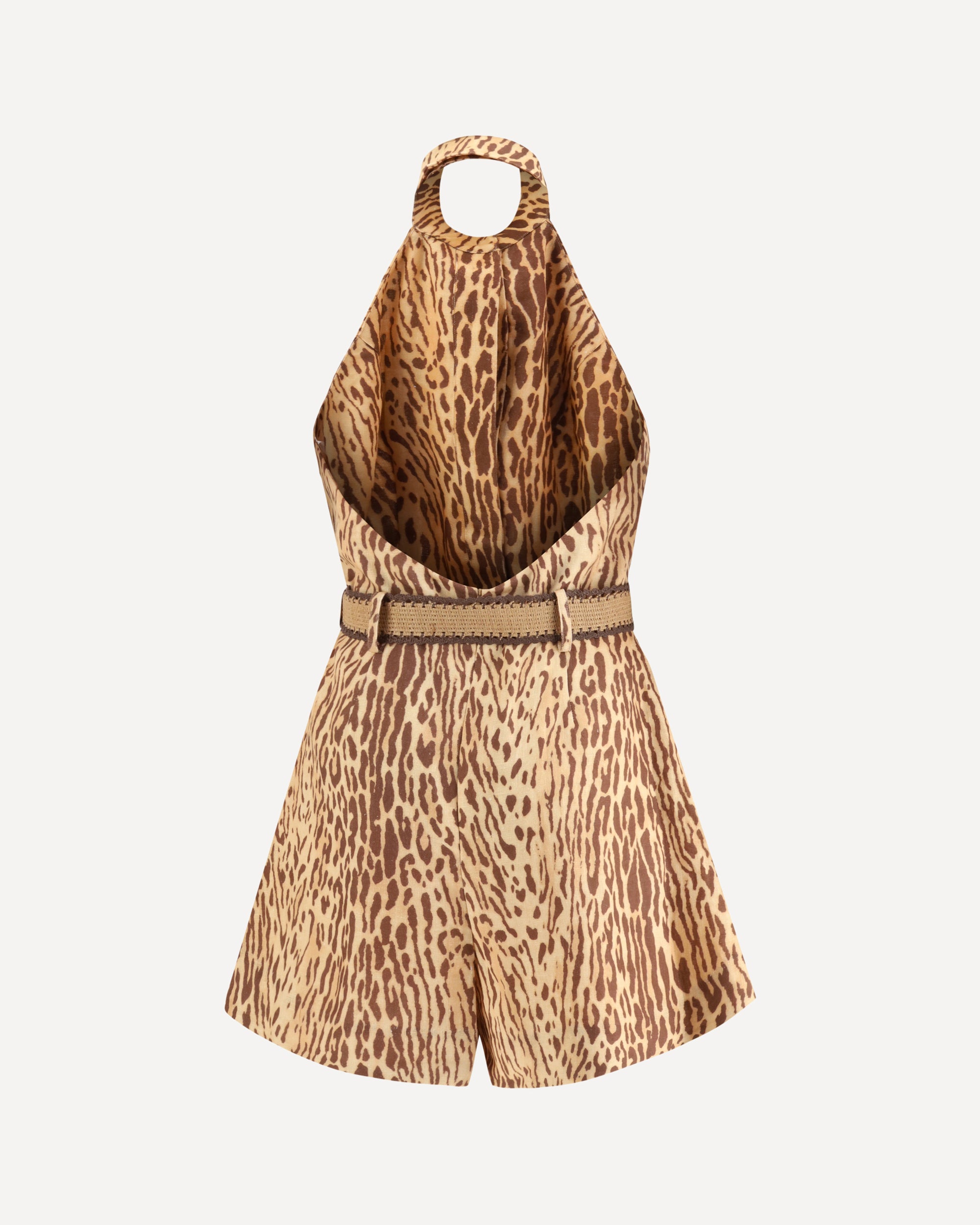 Zimmerman's Leopard Short Dress combines a bold pattern with refined details. Featuring a concealed back zipper closure and partial front button closure, the design offers practicality and elegance. Side-stitched pockets add discreet functionality, while the lightweight, natural linen fabric is complemented by a detachable raffia belt that defines the waist with a summery, sophisticated touch.