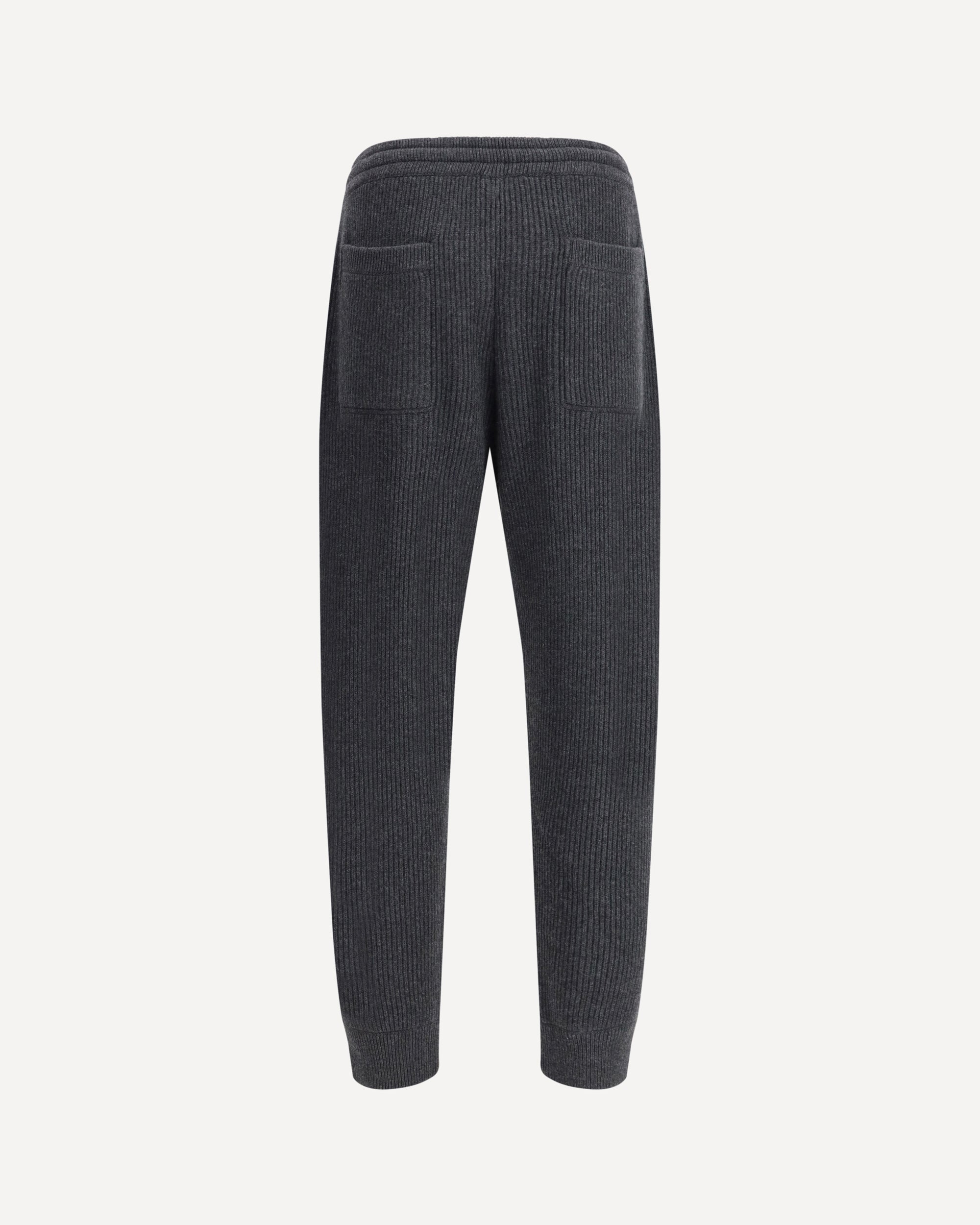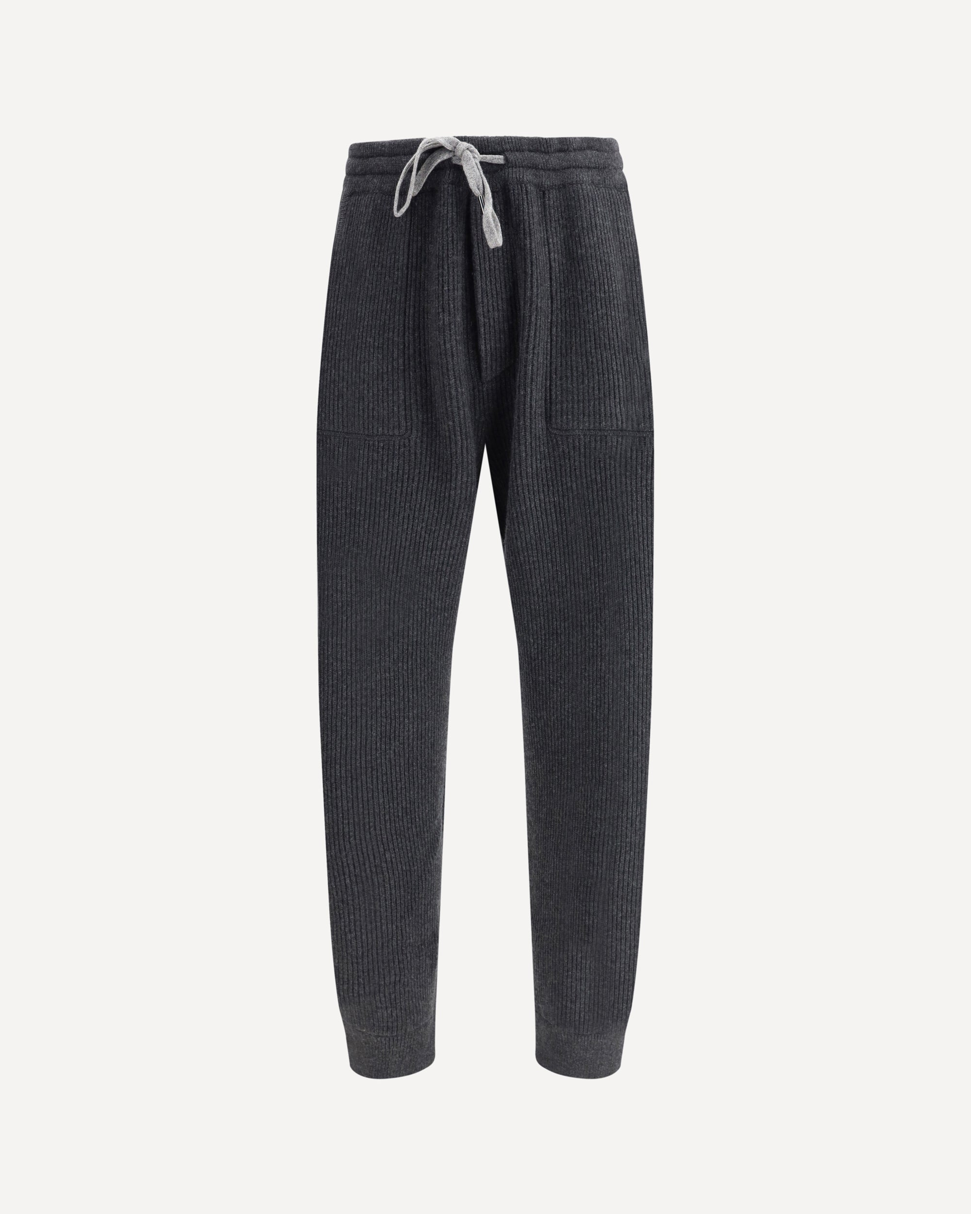 The Travelwear Joggers by Brunello Cucinelli combine traditional craftsmanship, active style, and modern comfort for relaxed moments with the soft touch of knitwear. Crafted from luxurious cashmere in an English rib texture, they feature a ribbed waistband with drawstring, front pockets, and back patch pockets, blending functionality with refined elegance.