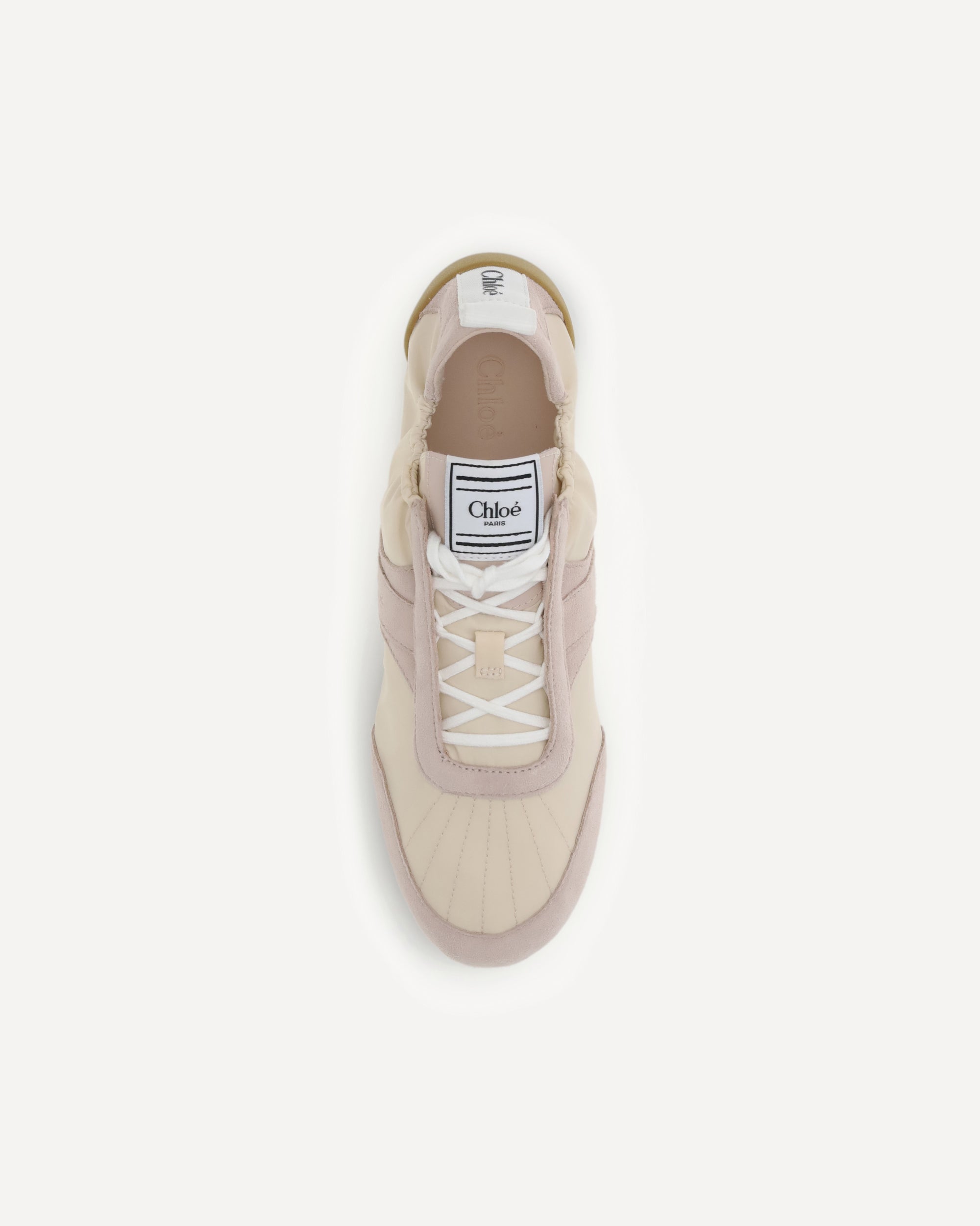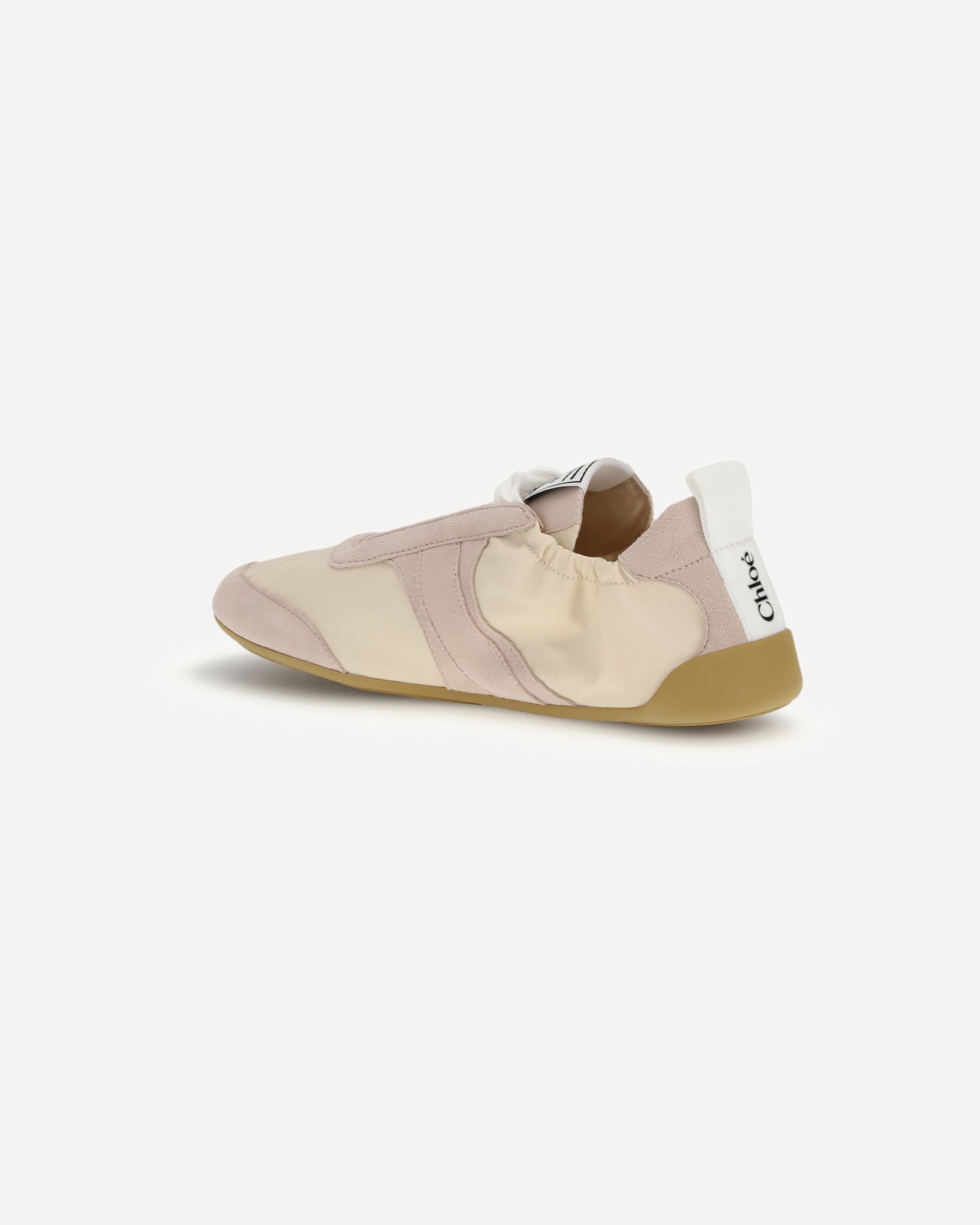 The Chloé Kick Sneakers draw inspiration from ballet and boxing, blending grace with sporty edge. Crafted from cotton nylon and suede leather, they feature an ultralight silhouette and a flexible sole in recycled rubber for a second-skin feel. The Chloé logo adorns the side and heel tab, while a boxing-style label accentuates the tongue. Finished with a lace-up closure, these sneakers embody effortless comfort and refined urban style.