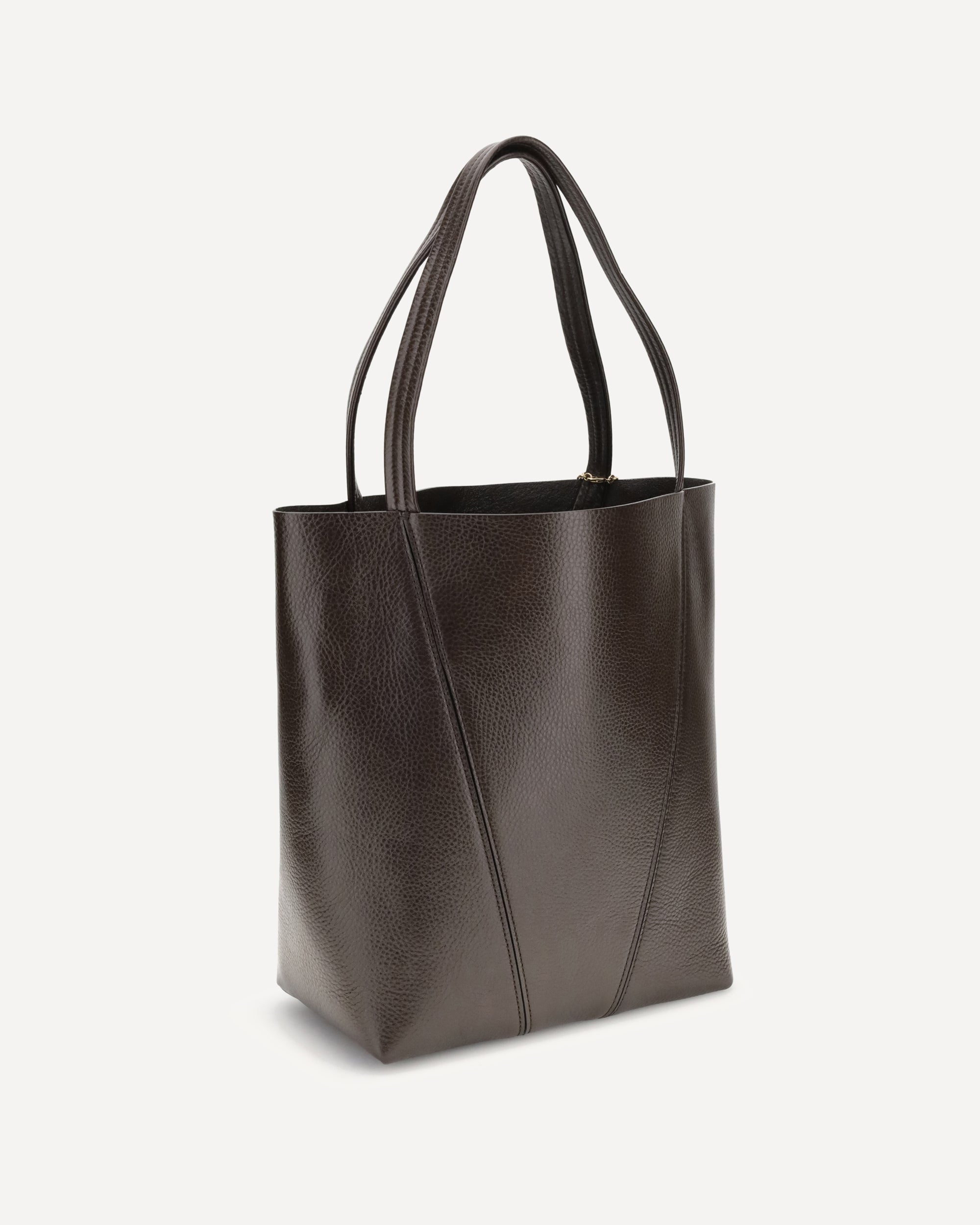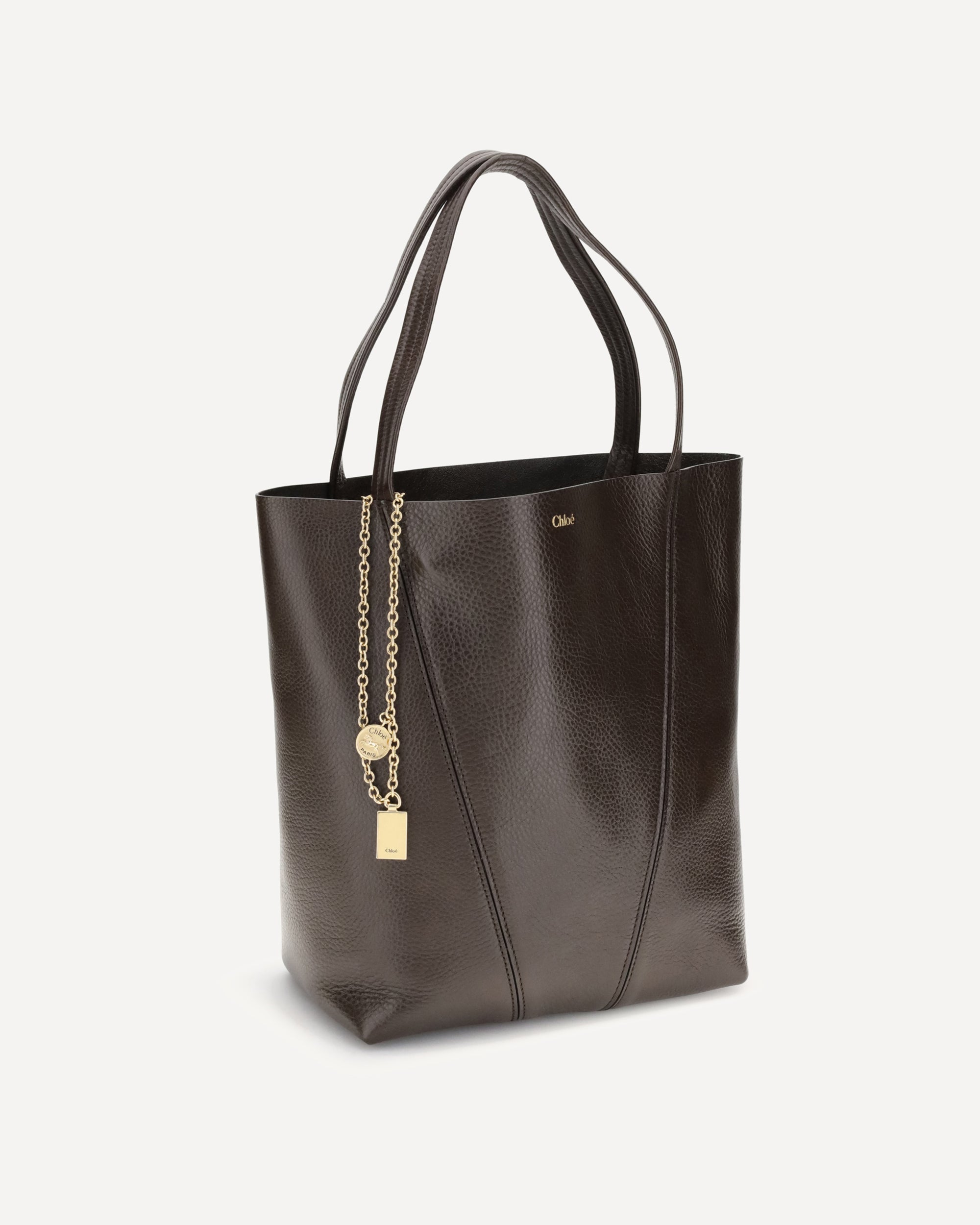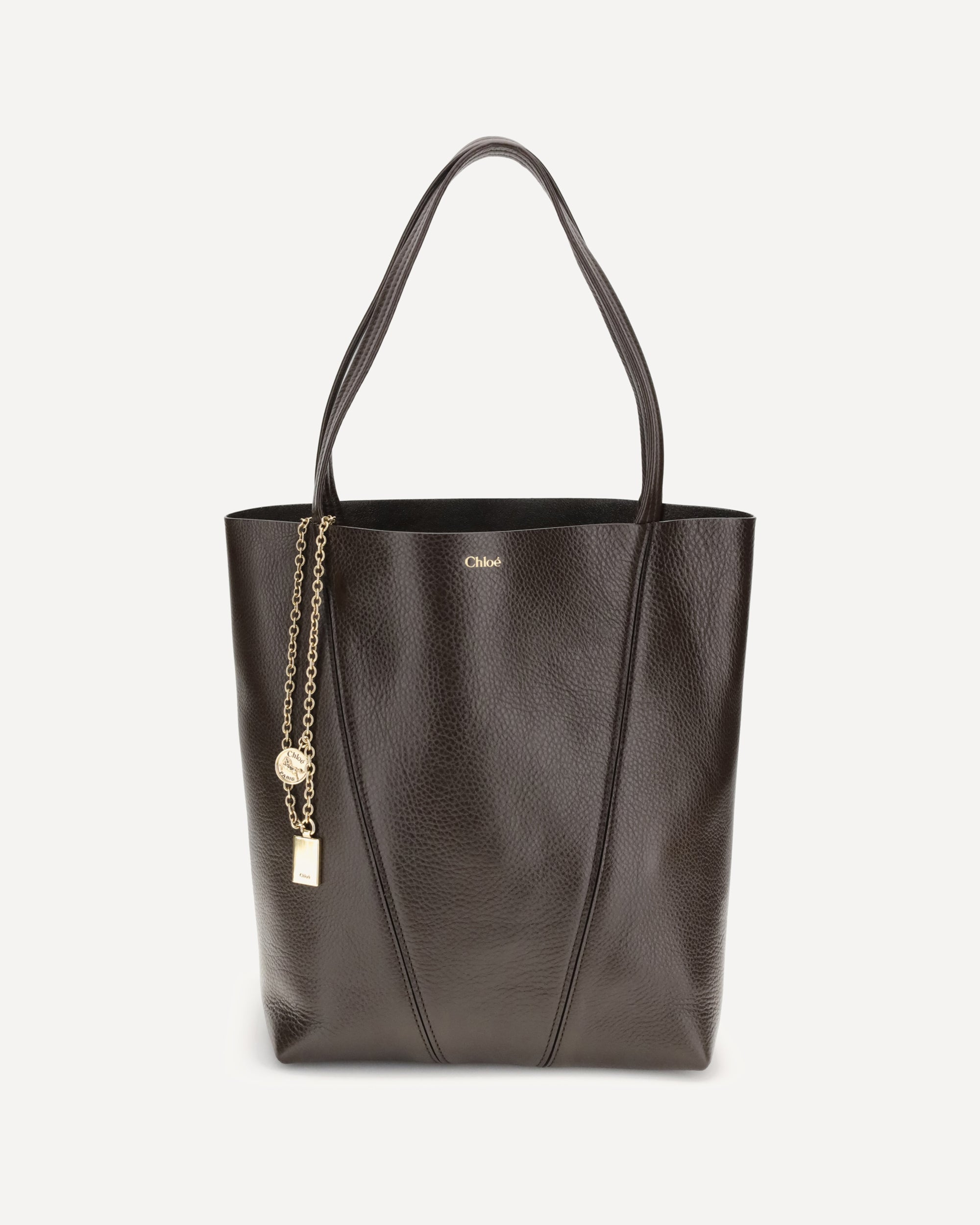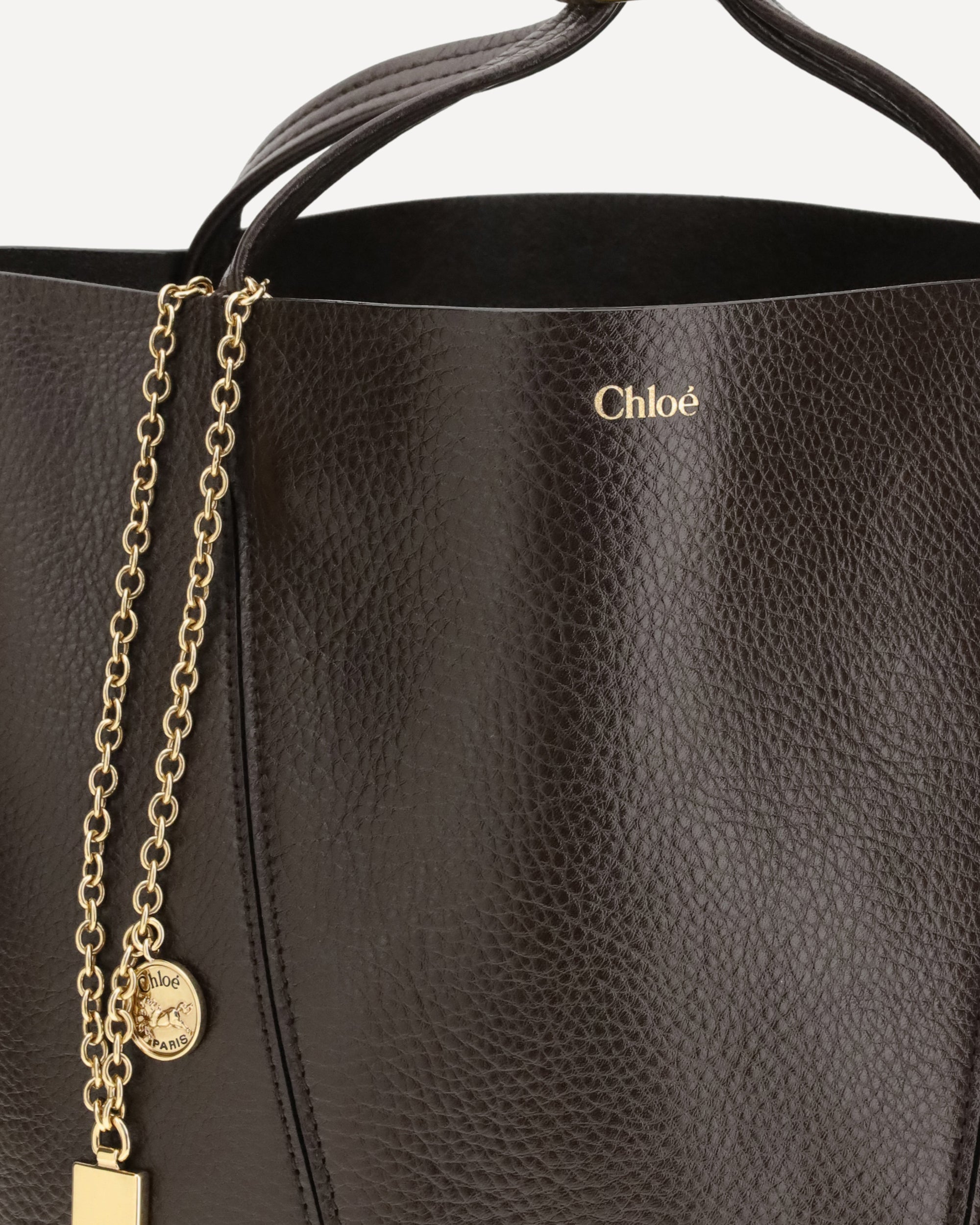 Leather Spin Shoulder Bag by Chloé is a refined and modern accessory featuring a sleek grained leather design. The two flat top handles offer a comfortable and practical grip, while the brand's iconic monogram, press-stamped on the front, adds a distinctive touch of luxury. The closure of the bag is made via a ring that holds the two handles together, an element that gives it a unique and functional look. A fascinating detail is the chain with a pendant bearing the iconic logo applied to the handle. The interior of the bag consists of a single compartment.