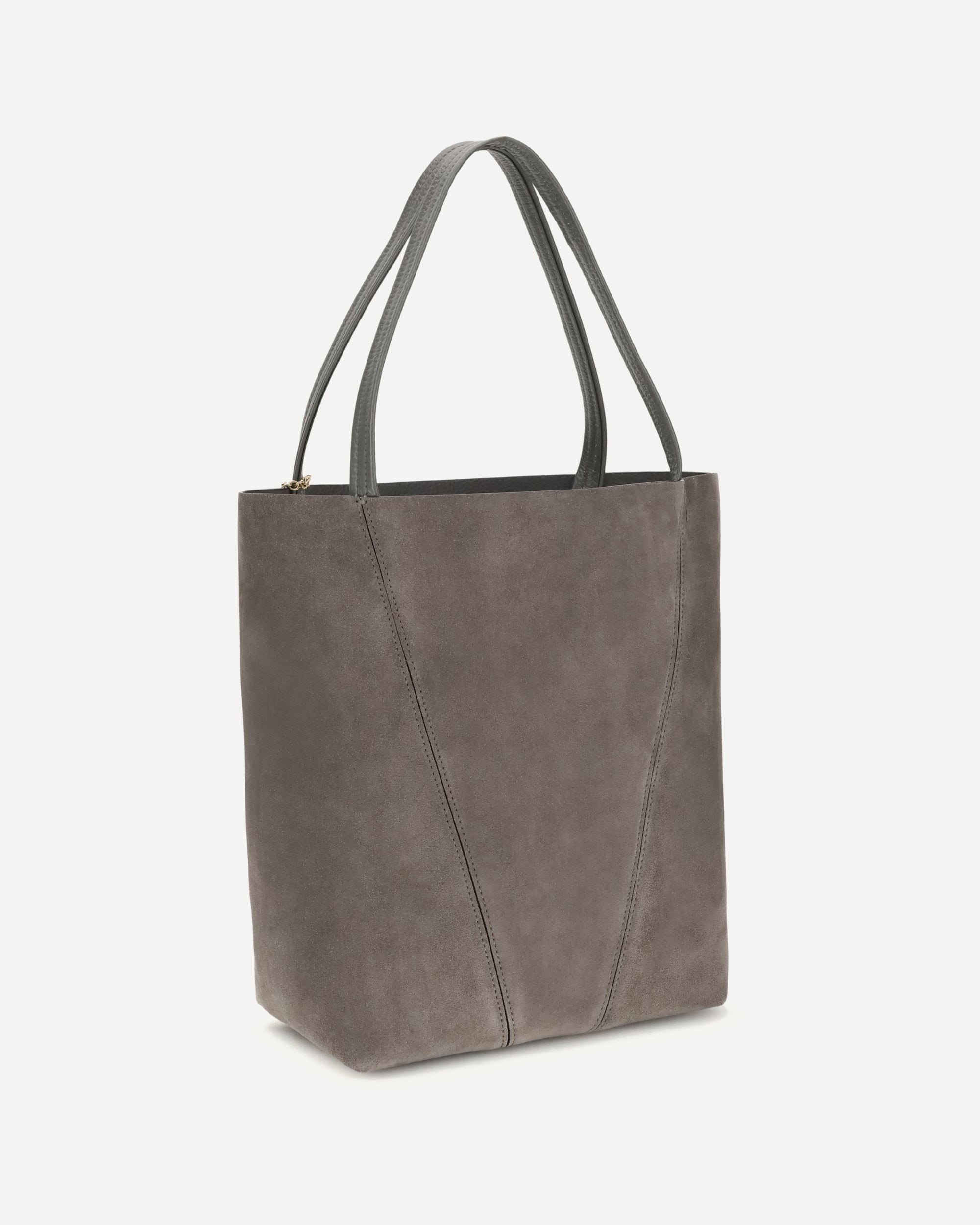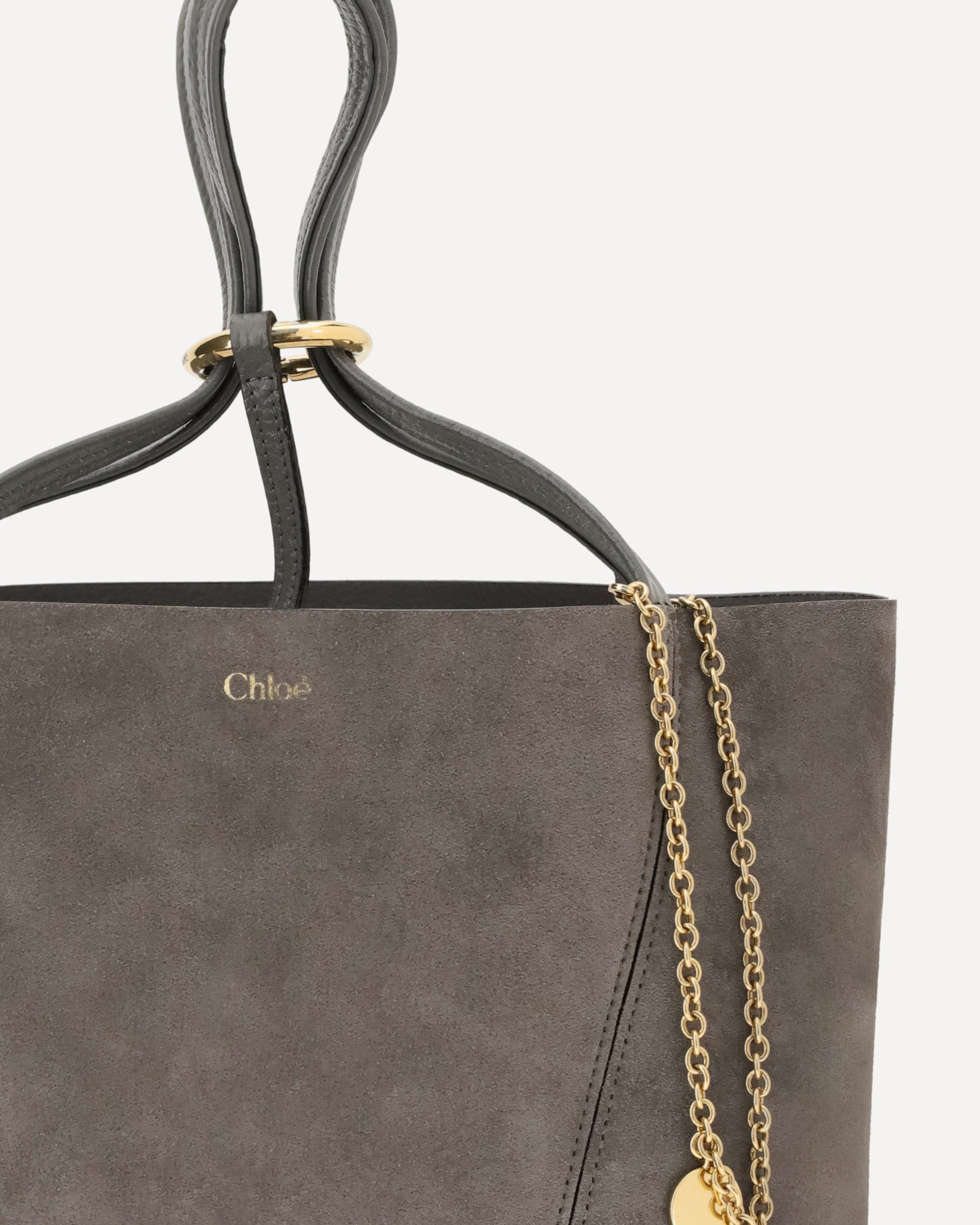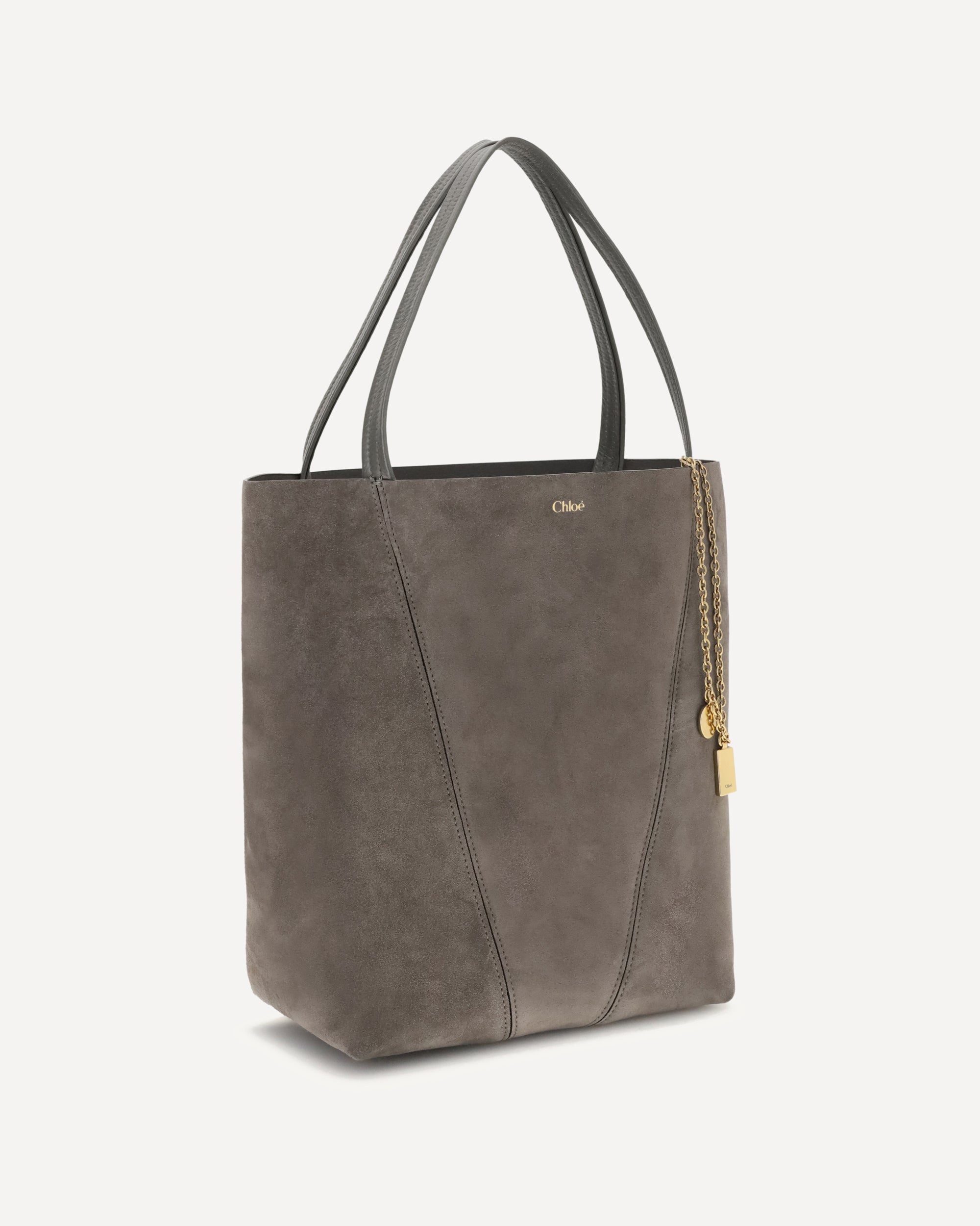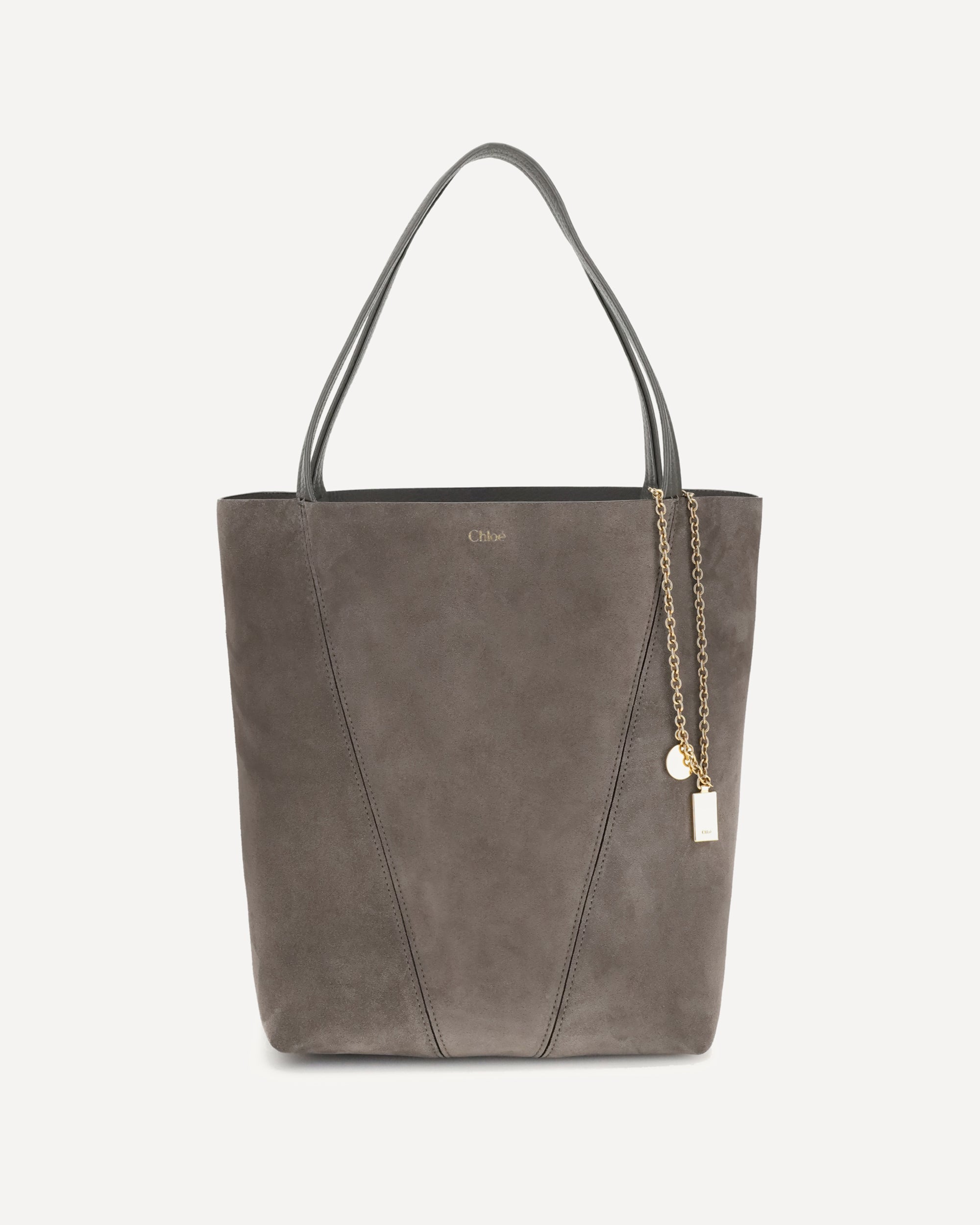 The Chloé Spin Tote Bag in suede combines a minimalist silhouette with iconic details. The two leather handles ensure practicality, while the pendant chain with the Chloé and Horse medals adds a distinctive touch. The logo printed on the front completes the elegant and refined design of the Maison.