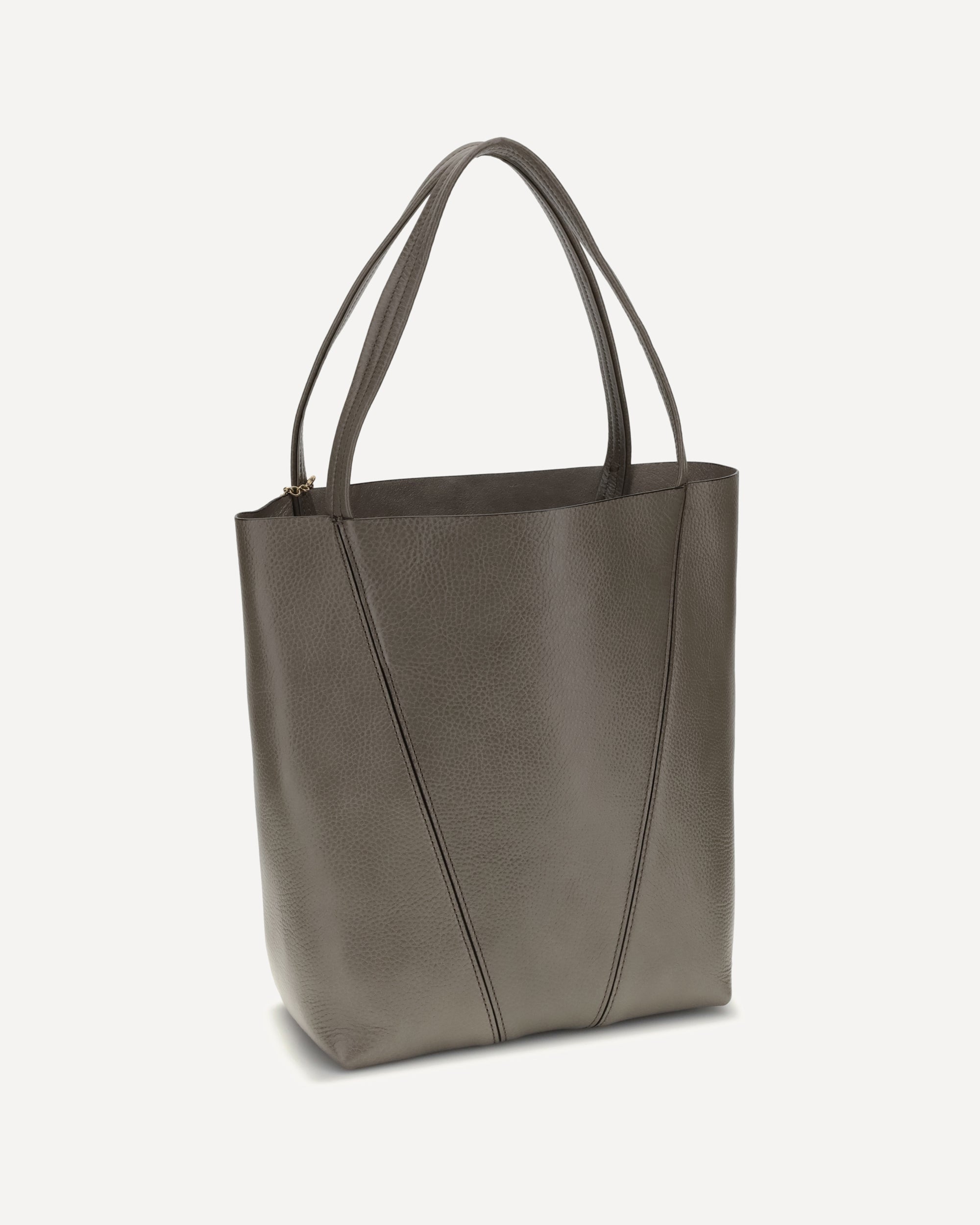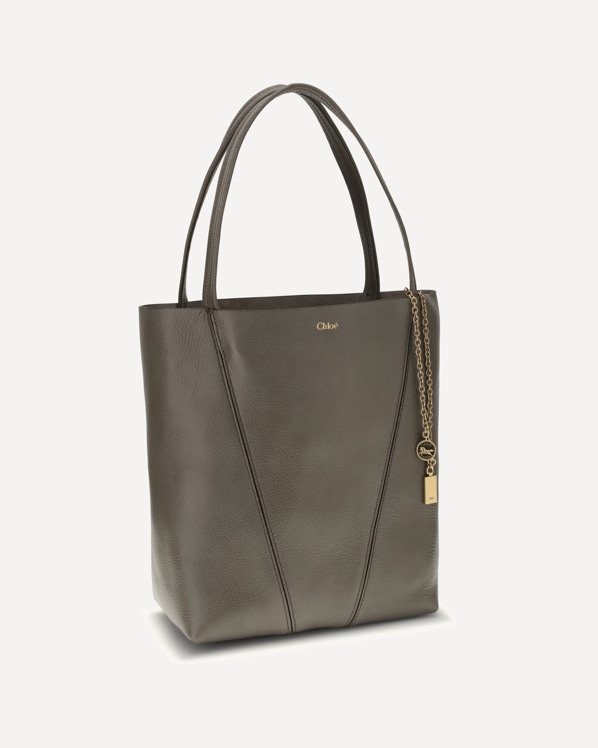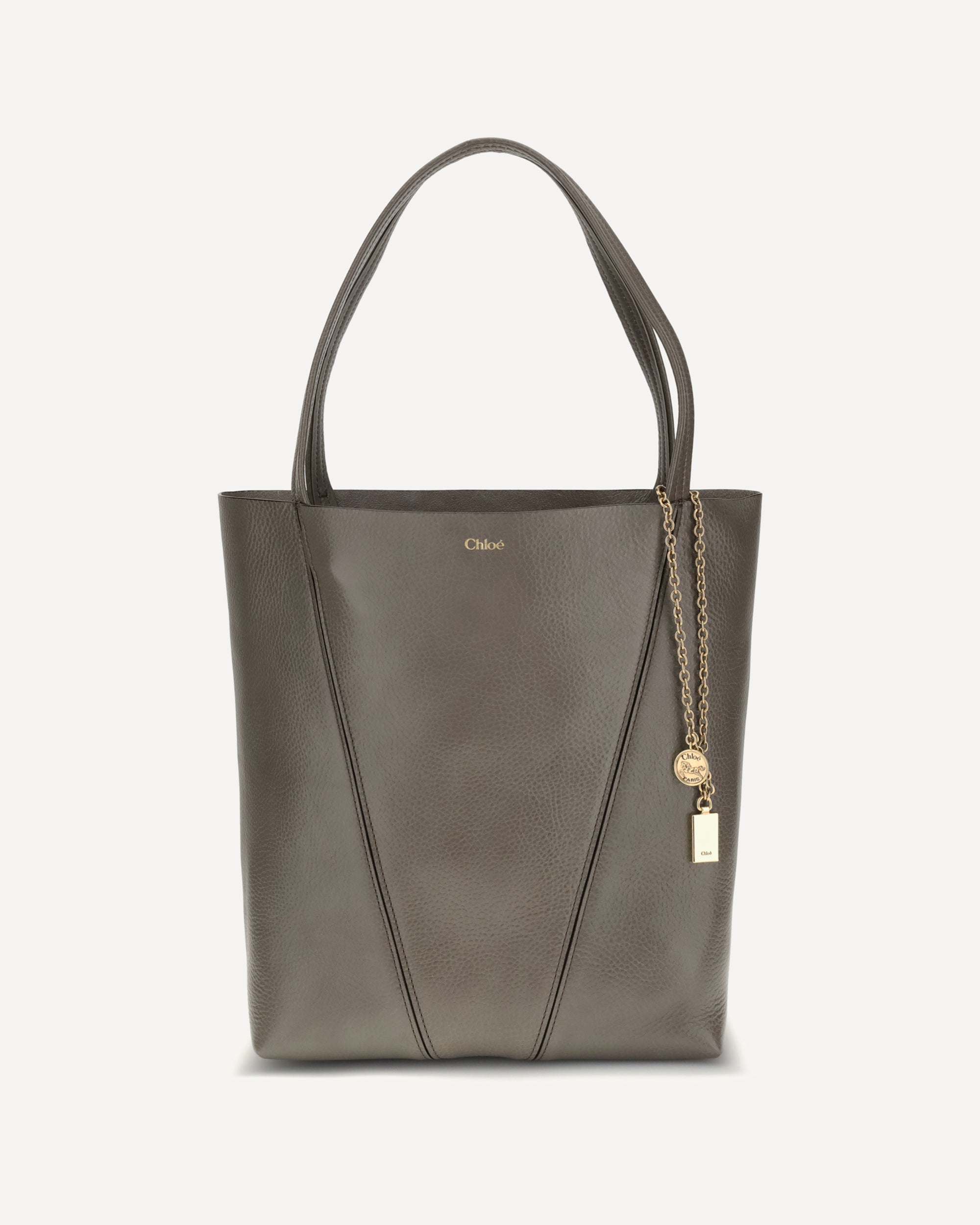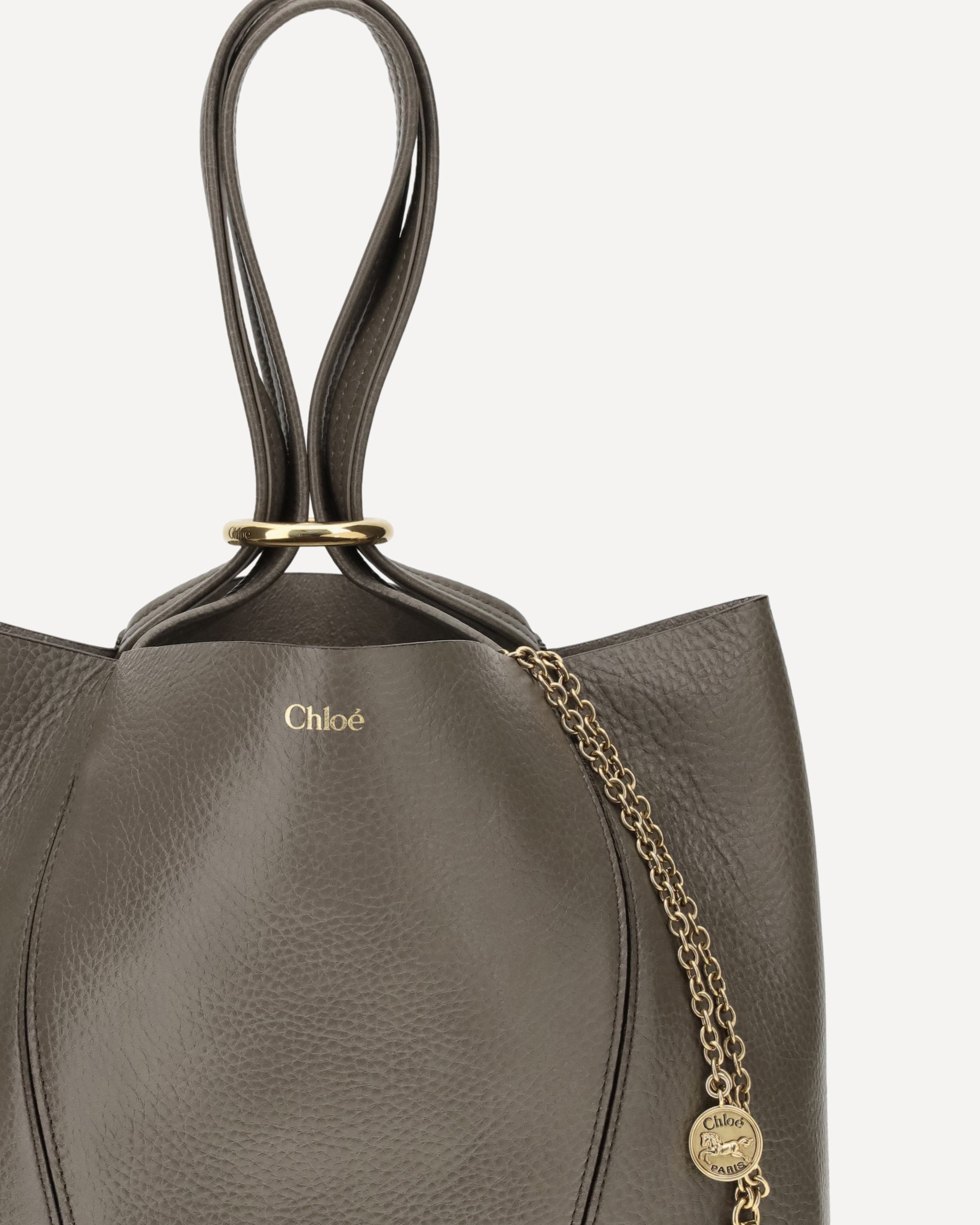 Leather Spin Shoulder Bag by Chloé is a refined and modern accessory featuring a sleek grained leather design. The two flat top handles offer a comfortable and practical grip, while the brand's iconic monogram, press-stamped on the front, adds a distinctive touch of luxury. The closure of the bag is made via a ring that holds the two handles together, an element that gives it a unique and functional look. A fascinating detail is the chain with a pendant bearing the iconic logo applied to the handle. The interior of the bag consists of a single compartment.