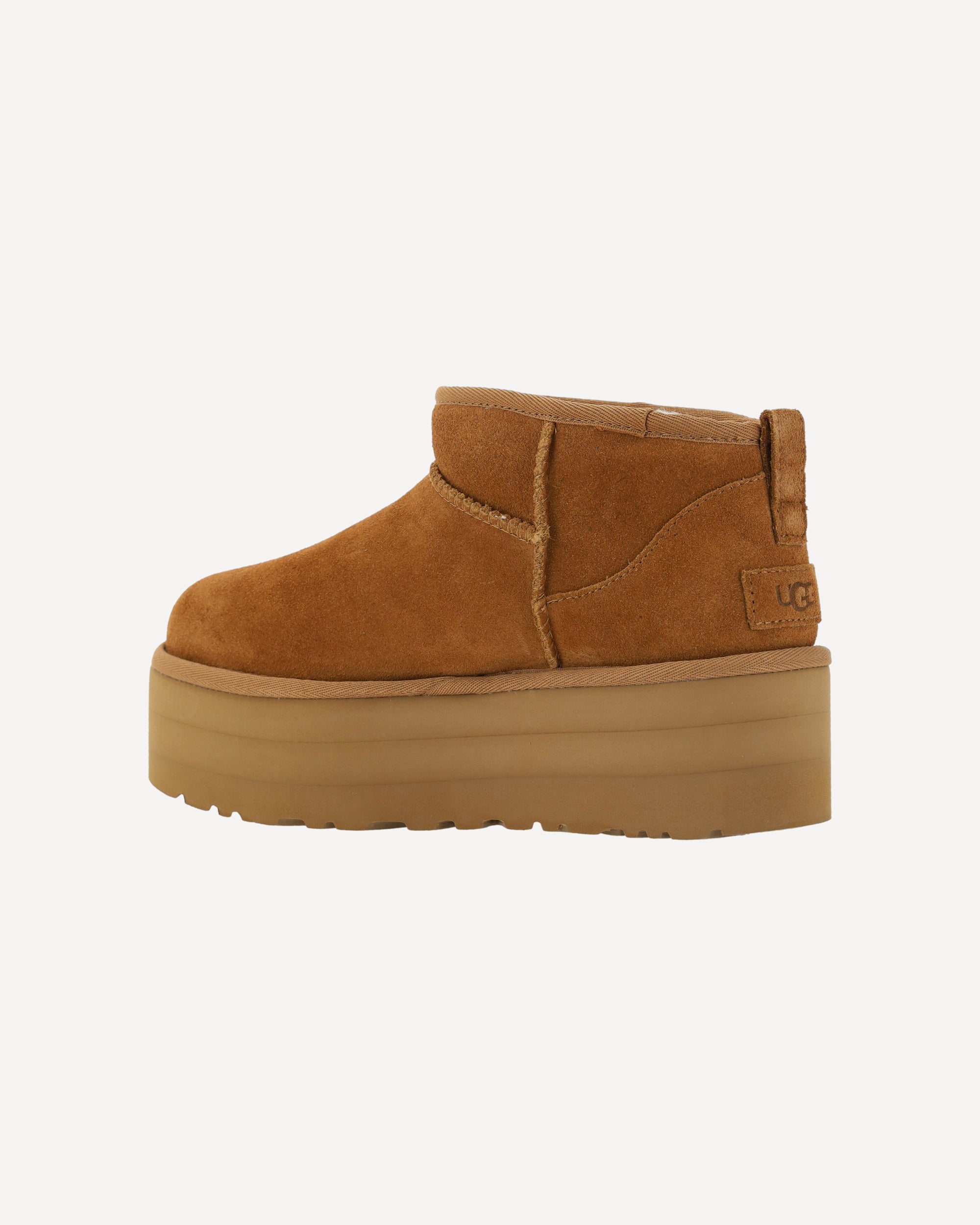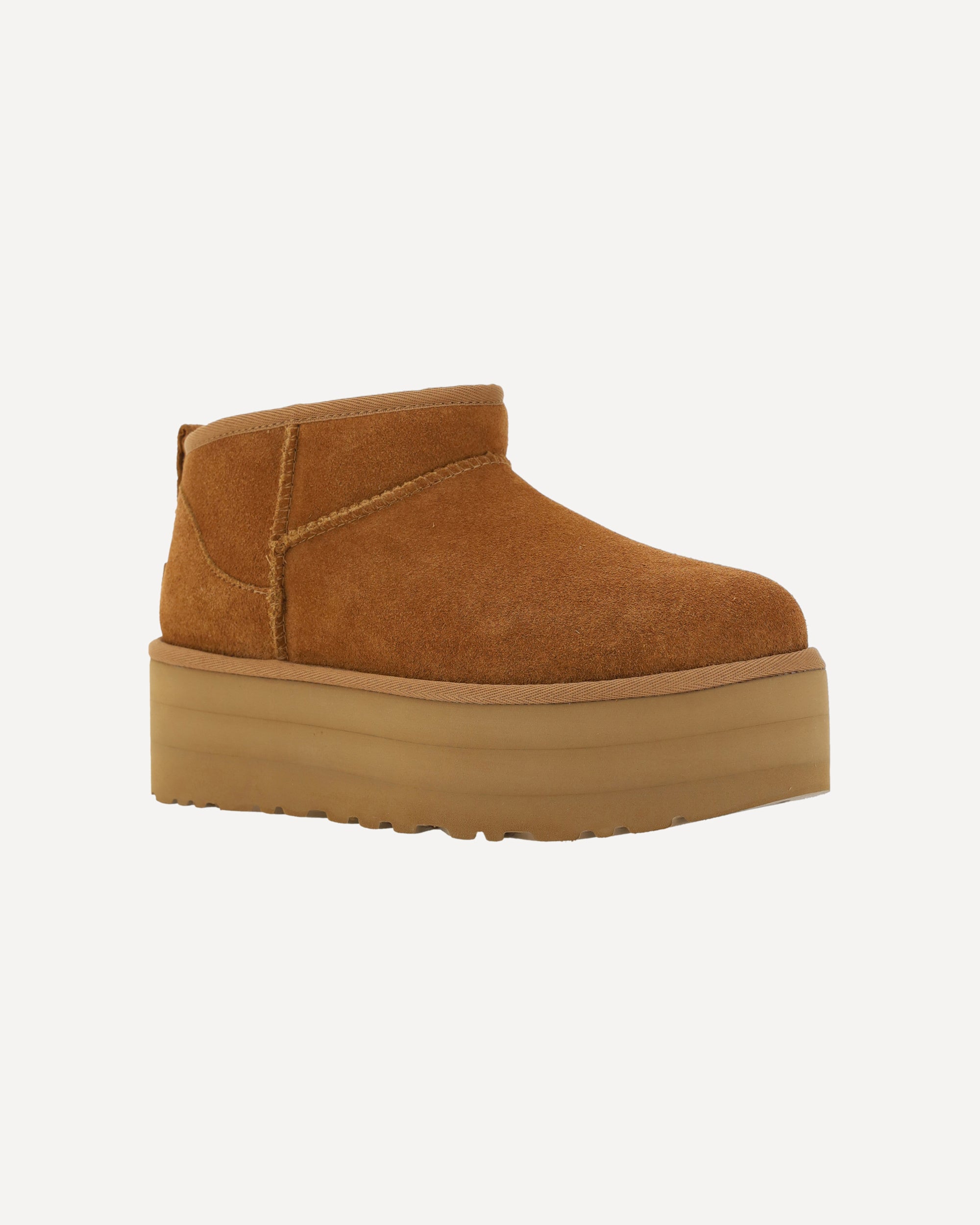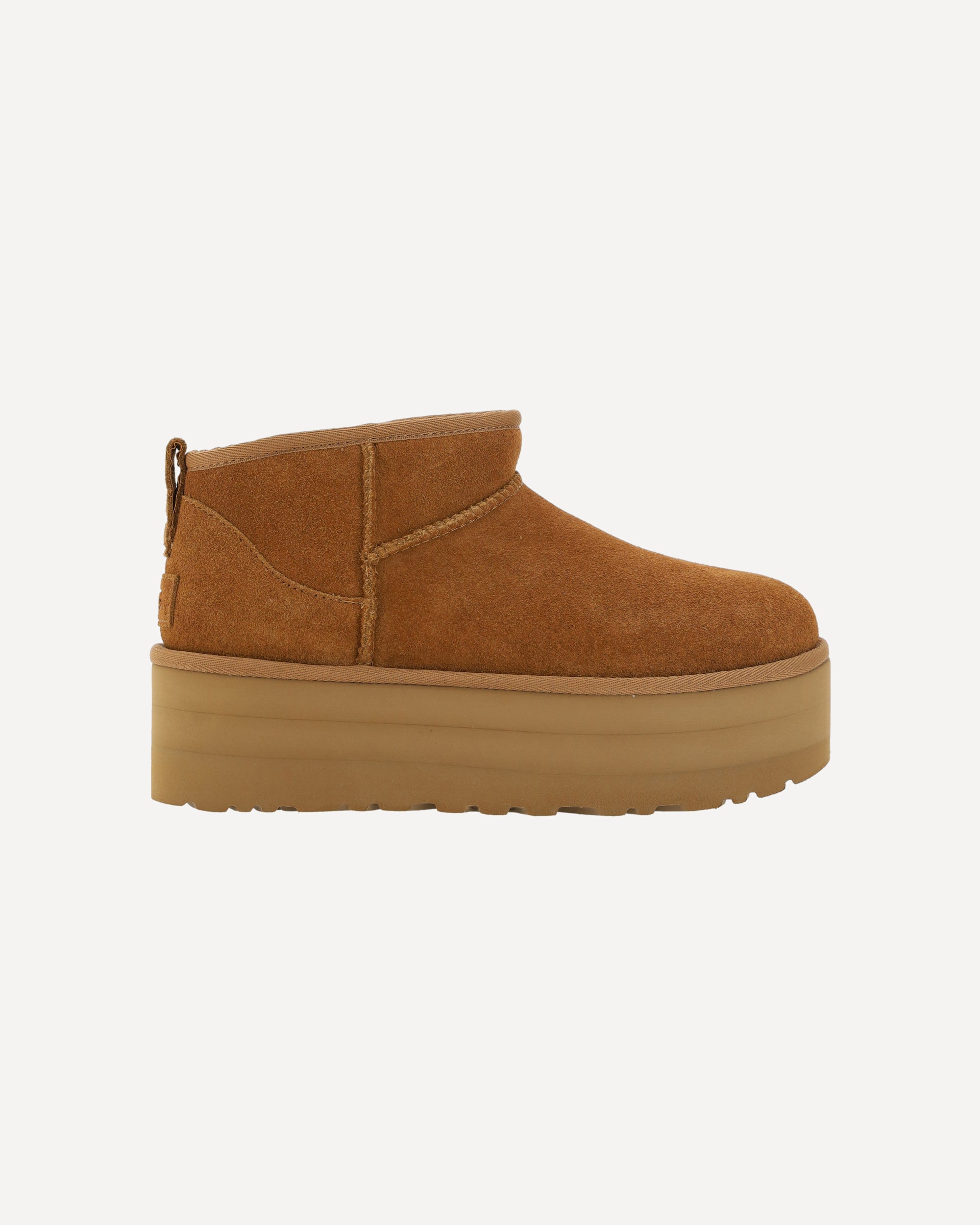 Calfskin Classic Ultra Mini Platform Boots by UGG, knurled platform sound, round toe, soft shearling lining, iconic brand monogram applied to heel, raised stitching, suede design.
