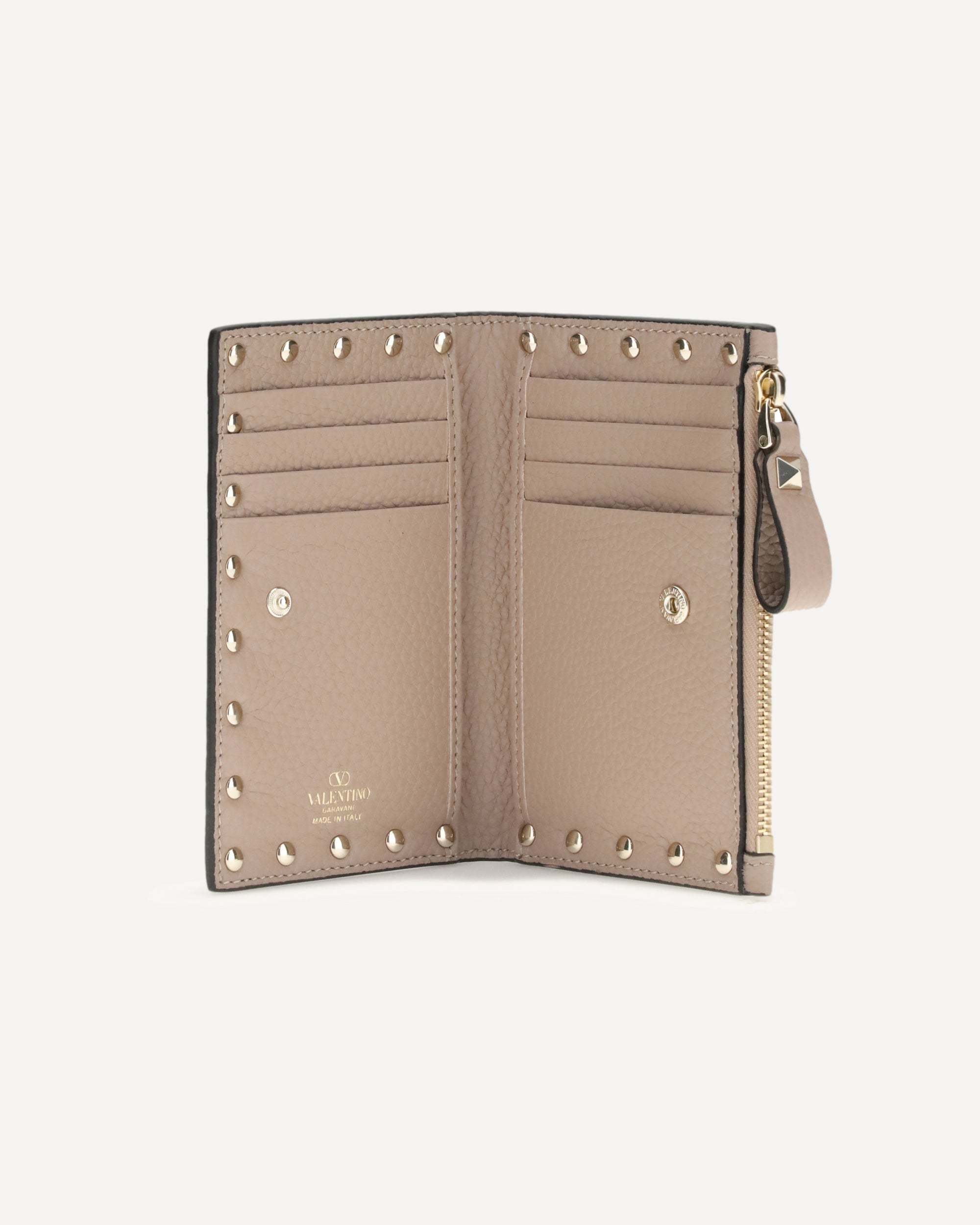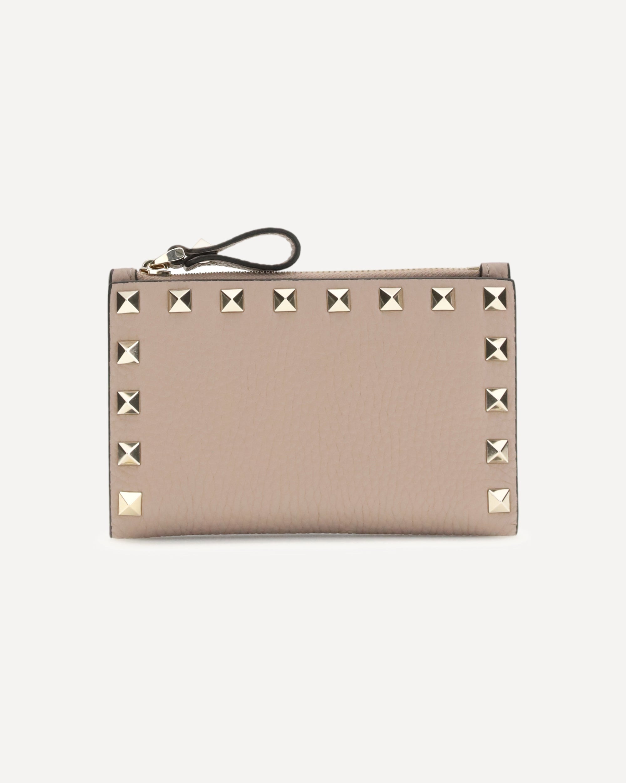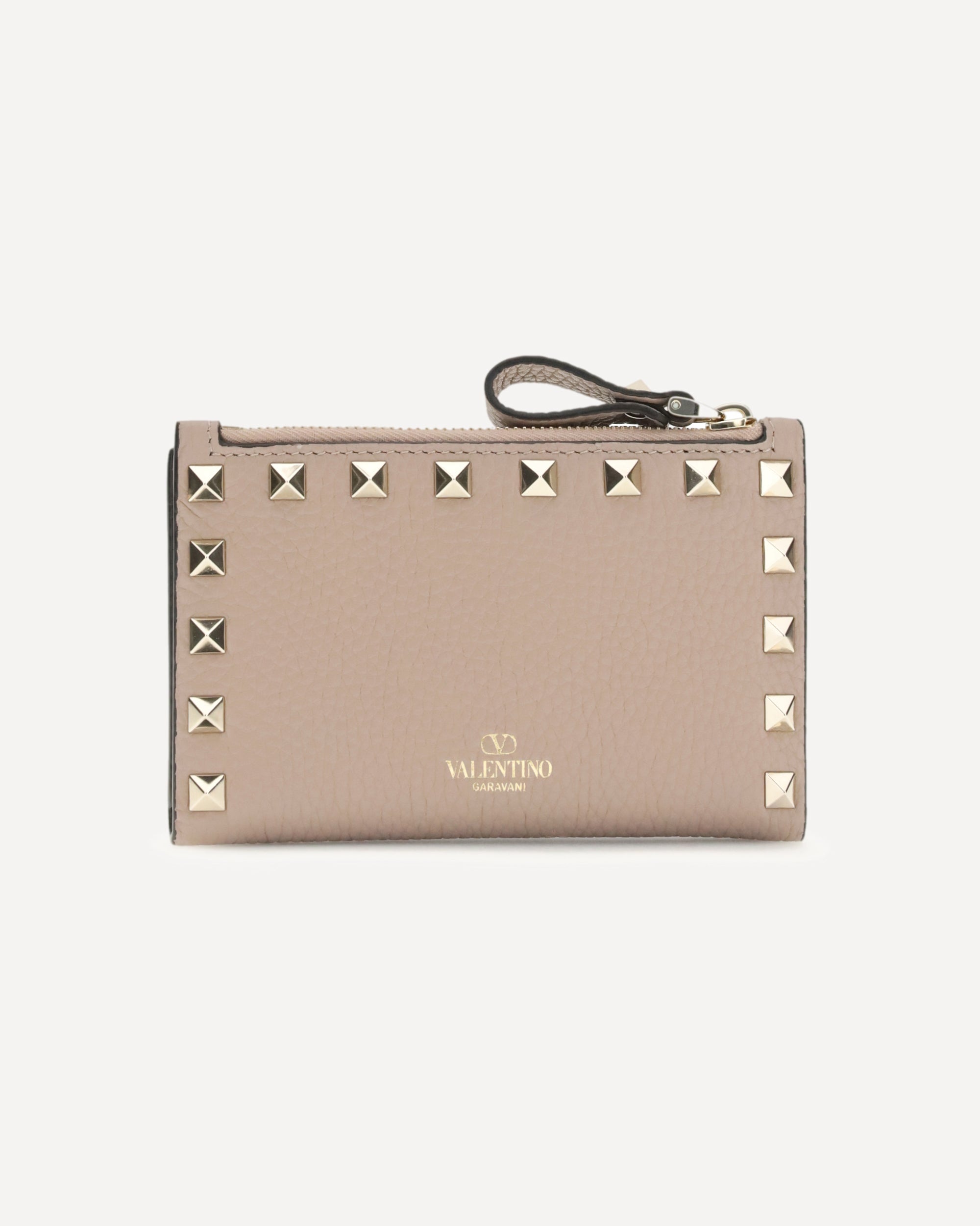 The leather Card holder by Valentino Garavani is crafted from grained calfskin and embellished with the iconic platinum-finish Rockstuds. It features a snap-button closure, a zipped coin compartment, six card slots and two flat pockets, offering a compact and luxurious blend of functionality and signature style.