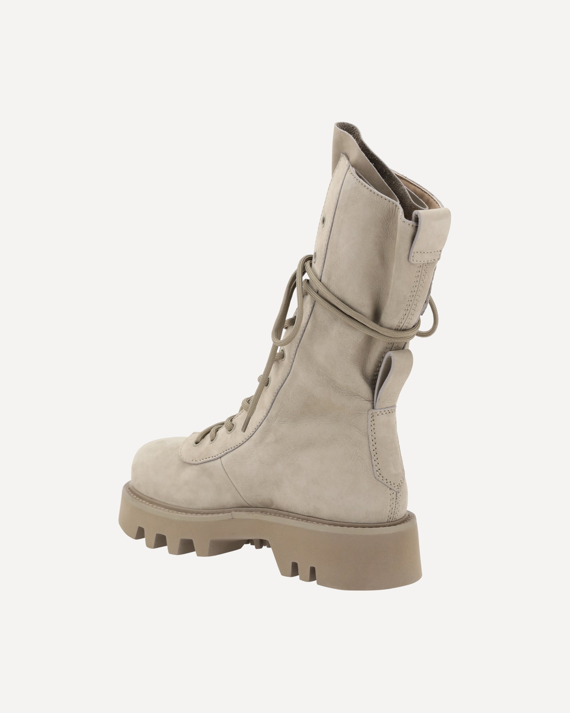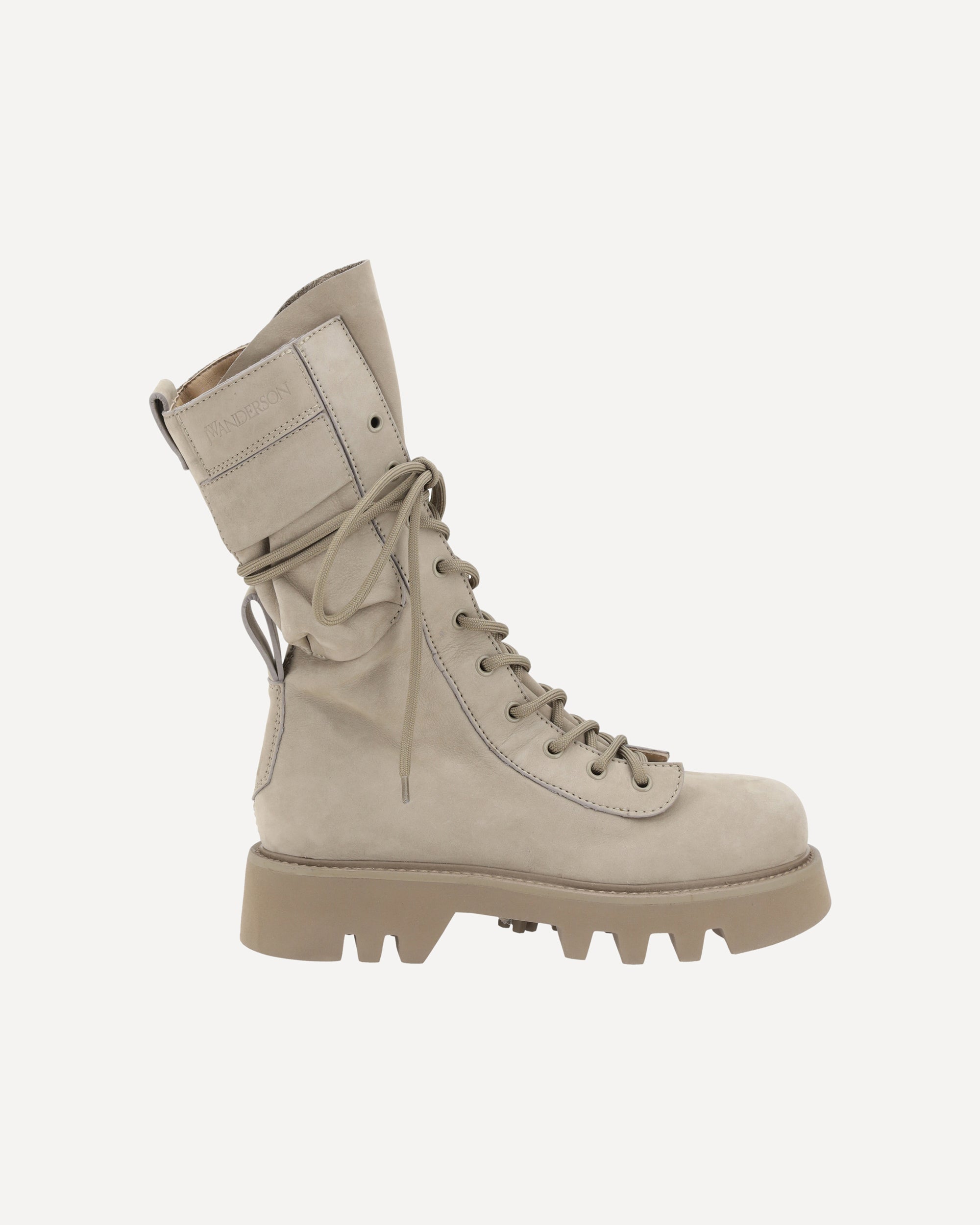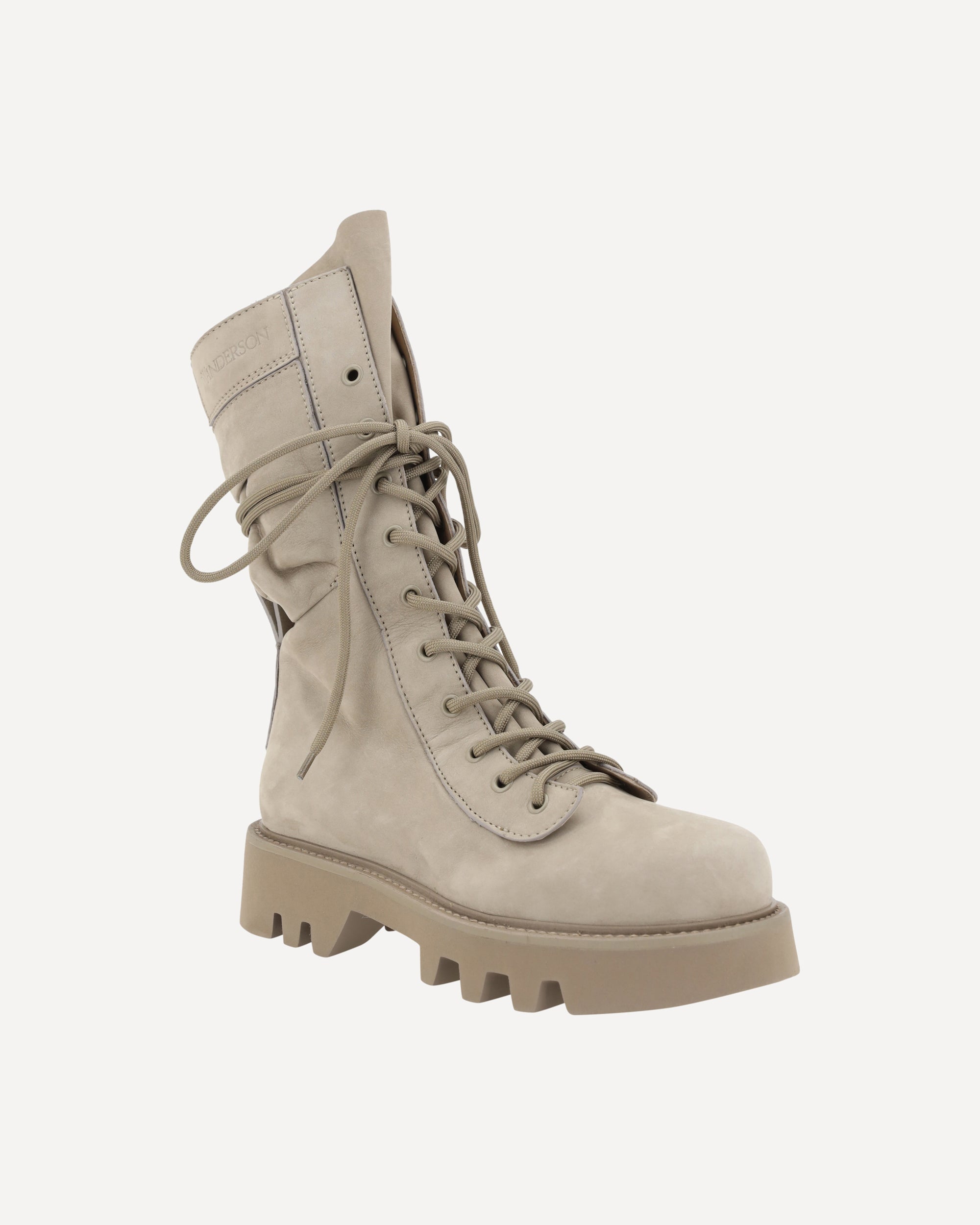 The suede Combat Ankle Boots by J.W. Anderson feature a round toe for comfort and a roomy fit. The lace-up front closure allows for precise adjustment, while the lugged sole ensures durability and grip on a variety of surfaces. The branded insole adds a distinctive detail, complementing the rugged and contemporary design of these ankle boots, ideal for a bold and functional look.