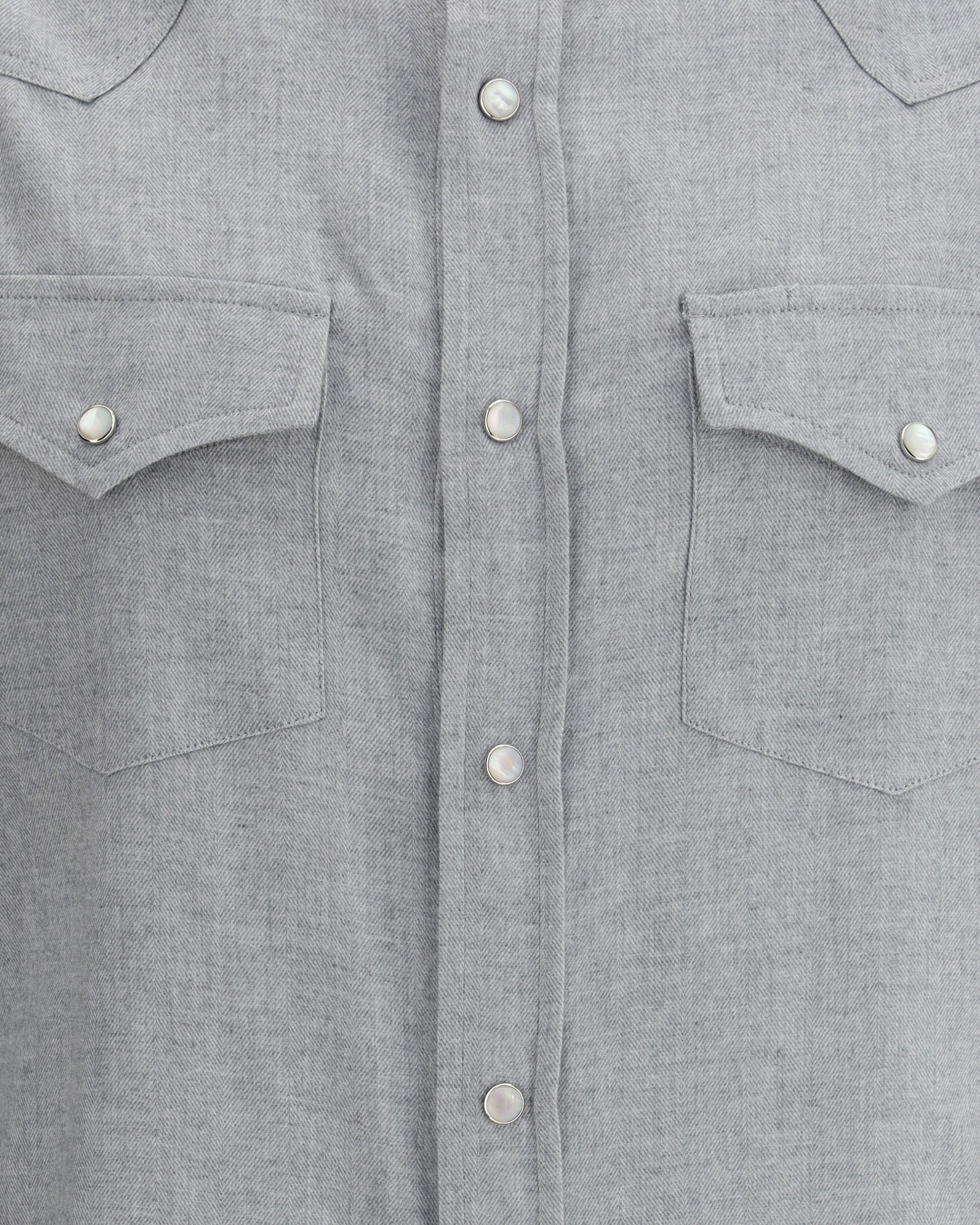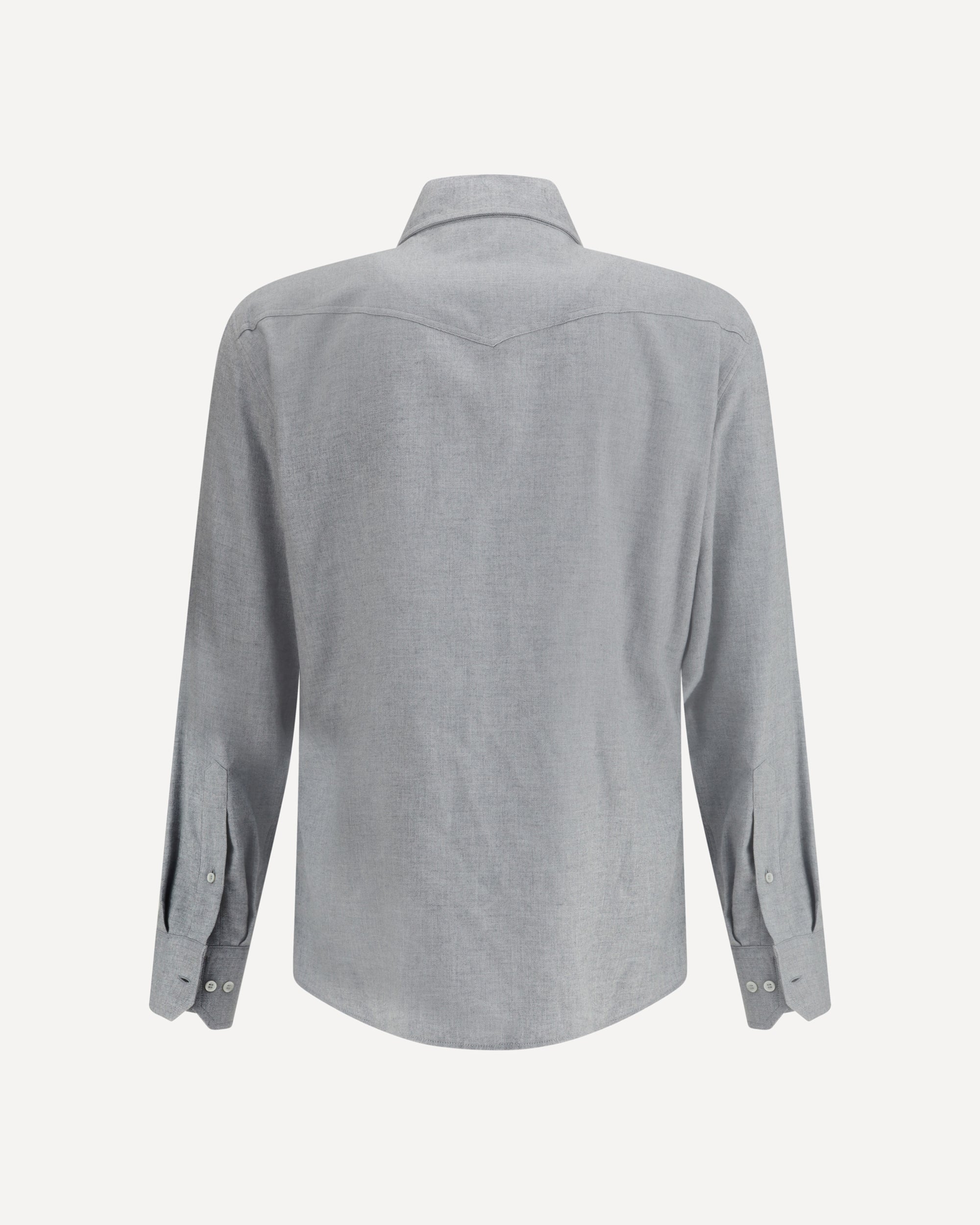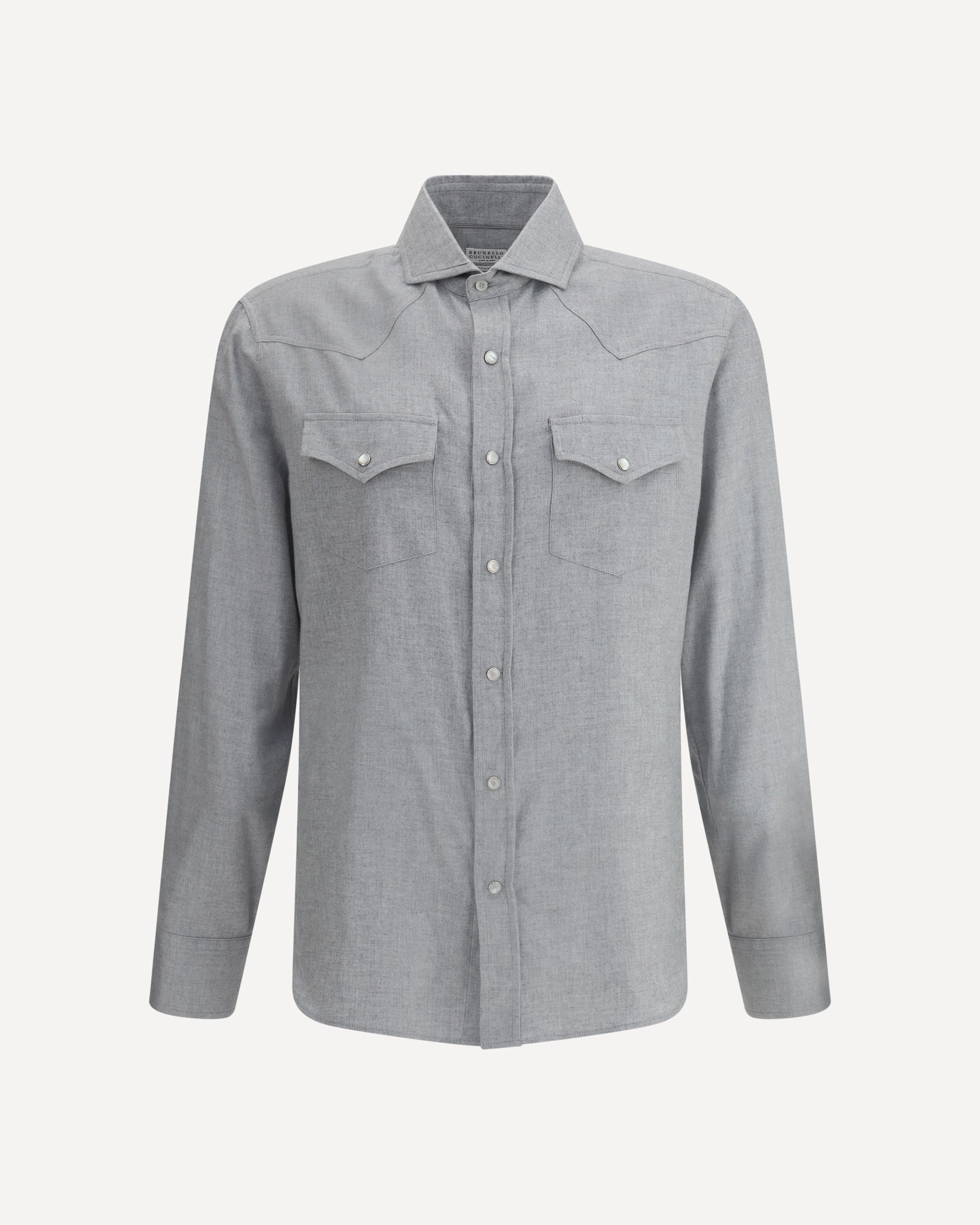 Brunello Cucinelli's cotton Shirt is a sophisticated and functional piece featuring a classic collar that adds a touch of elegance. The two patch flap pockets on the front offer practicality and style, while the front snap-button closure gives a clean, modern look. Adjustable button cuffs allow for a customized fit. The monochrome pattern makes this shirt versatile and easy to match, perfect for a casual-chic or more formal look.