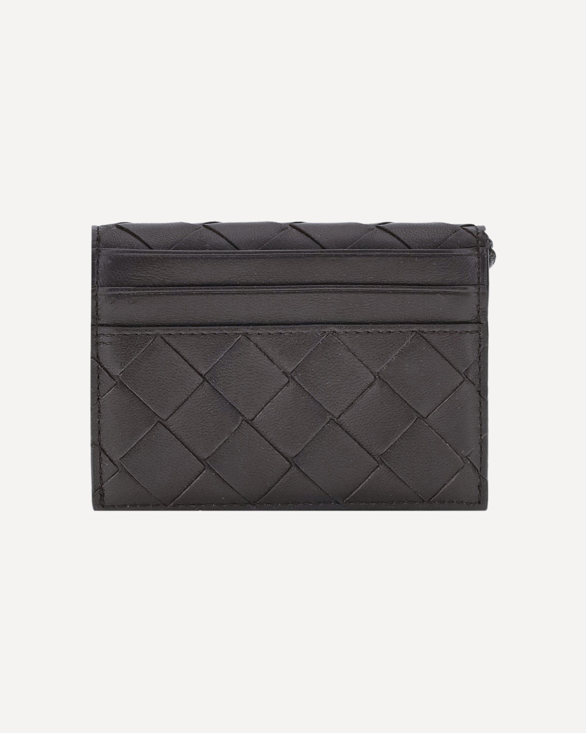 The leather Card Holder by Bottega Veneta combines elegance and functionality in a compact and refined format. Made of fine leather with the iconic intrecciato pattern, it features card slots on the back panel and a flap welt pocket on the front, embellished with a metallic knot detail, the distinctive symbol of the maison.