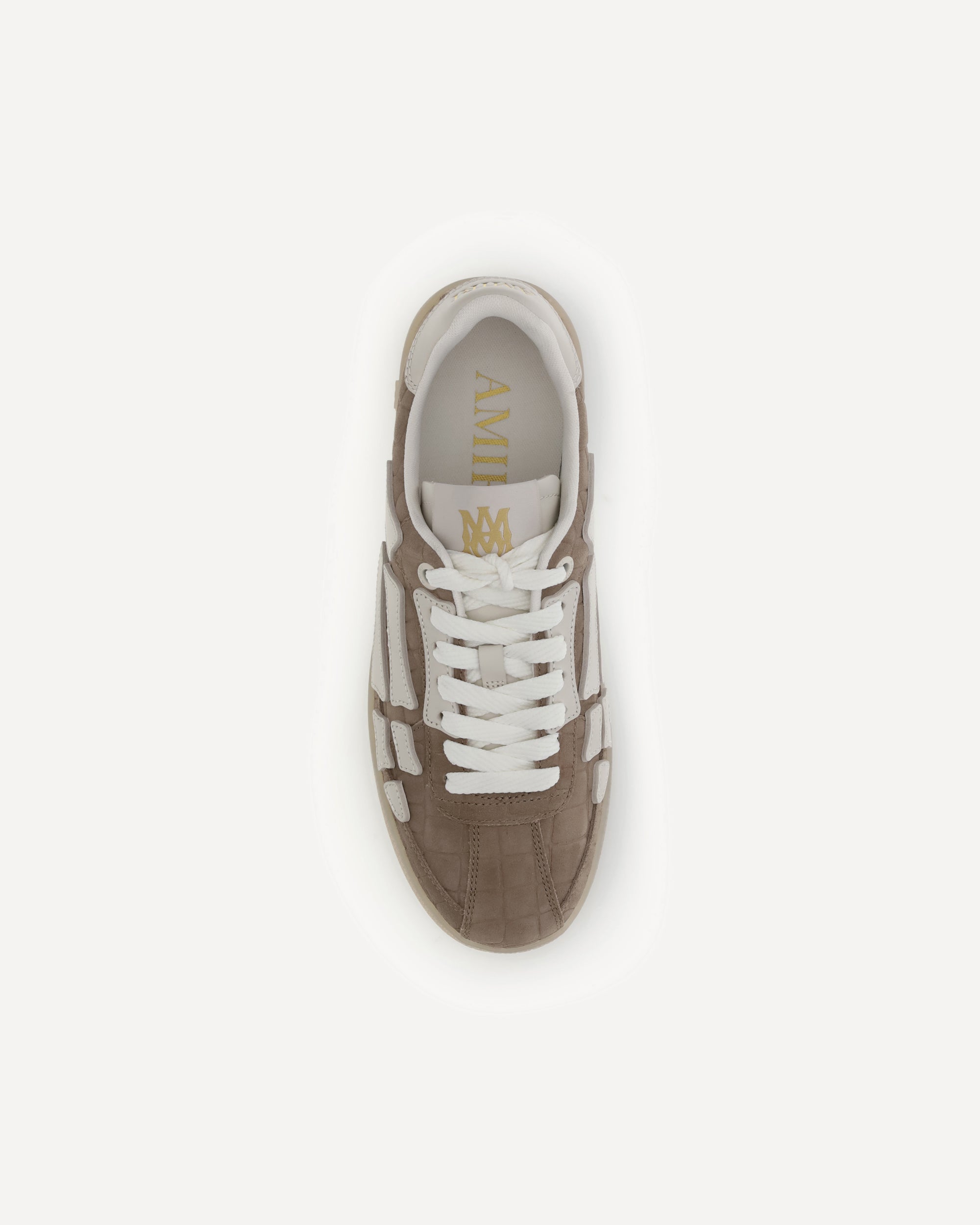 Croc Debossed Pacific Bones Sneakers by Amiri represent a refined reinterpretation of the maison's iconic Pacific model inspired by classic sports sneakers. Made of suede with a croc effect, they stand out for their low, sleek profile that enhances their sporty elegance. The rubber sole is decorated with the iconic MA motif, while the upper features leather bone appliqués, a distinctive and signature detail of the brand.