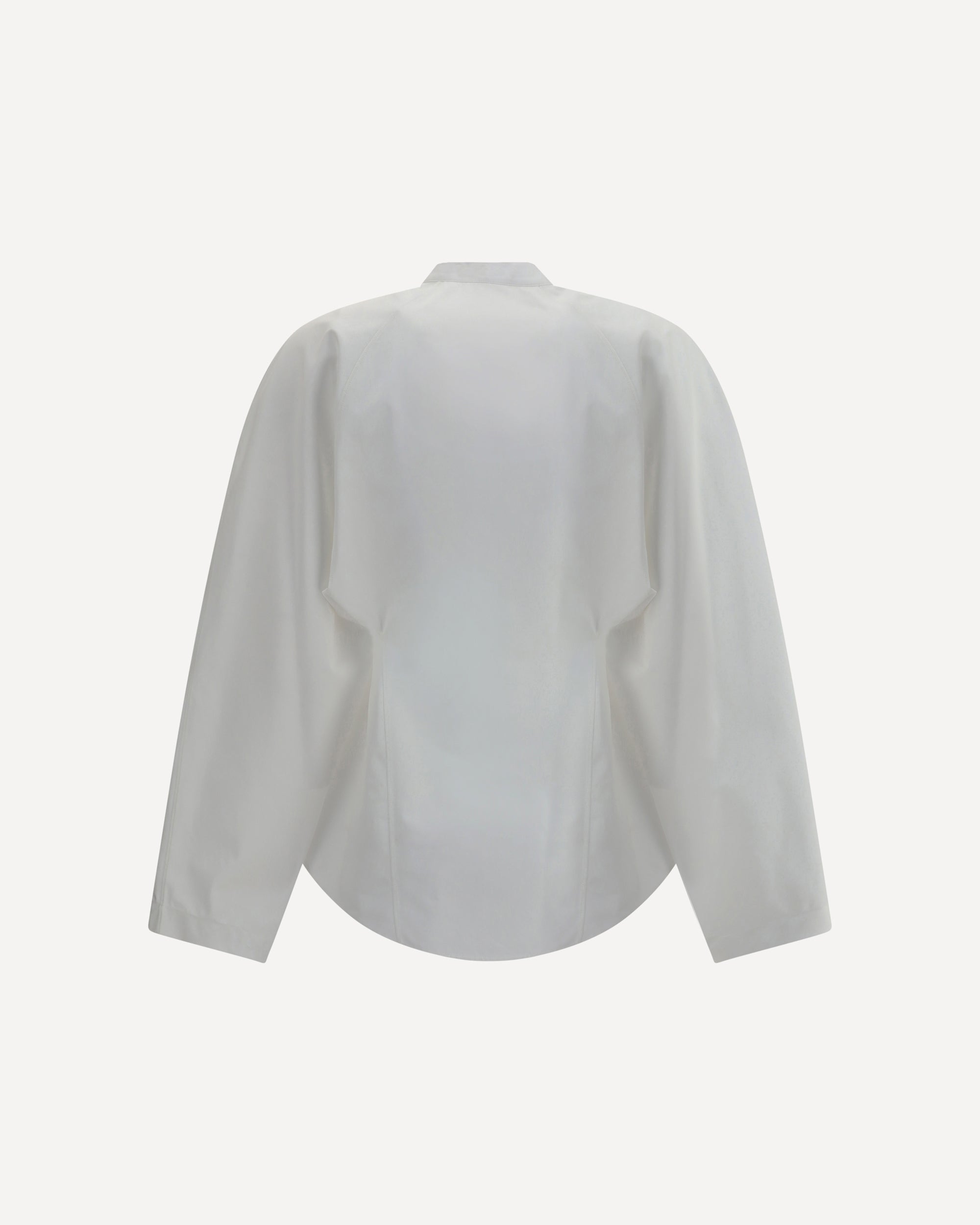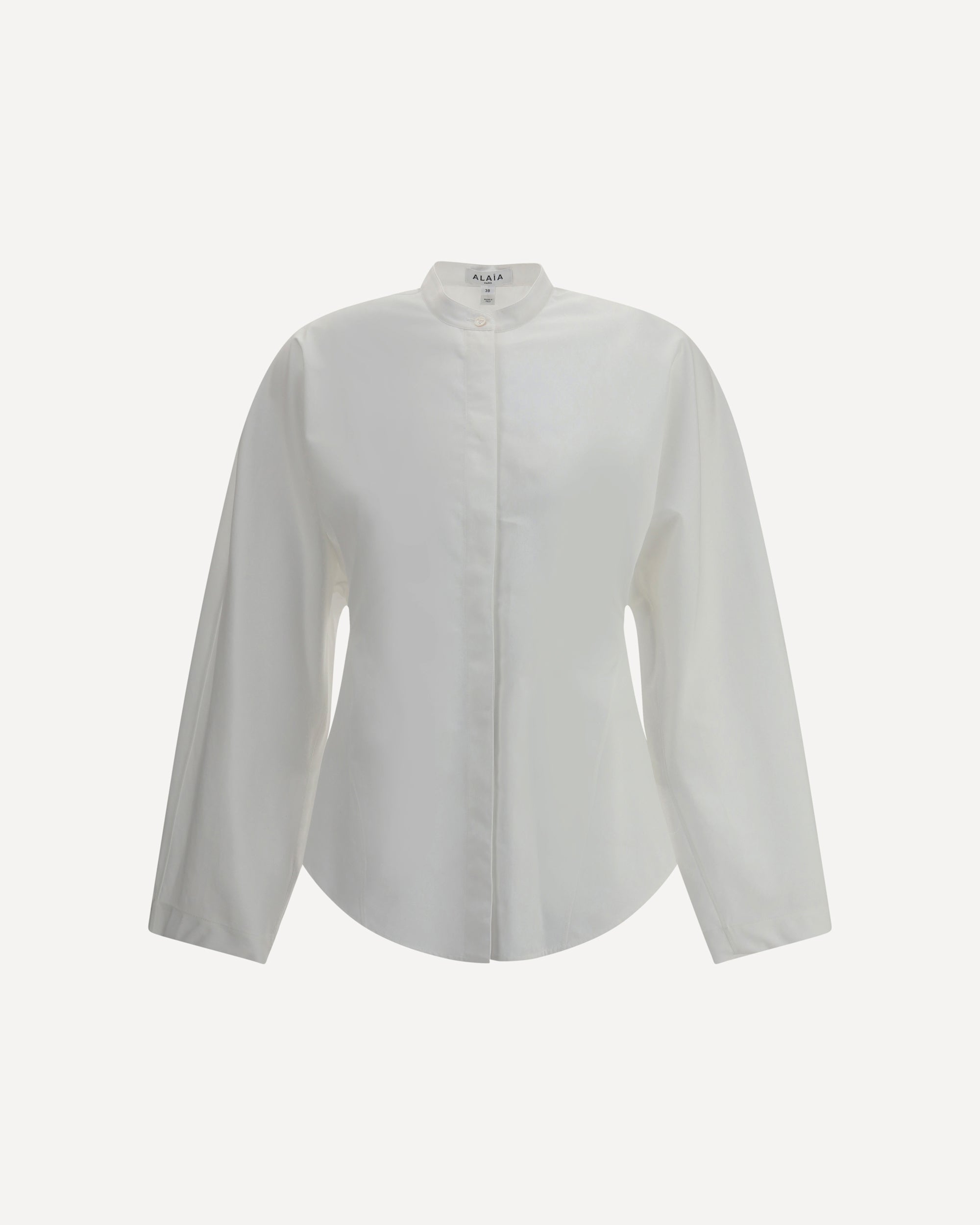 Alaïa's Curved Shirt from Alaïa is distinguished by its long sleeves with a curved silhouette, lending movement and originality to the design. Completed with a refined mandarin collar and structured cuffs, it features a shaped waist that enhances the silhouette with elegance and sartorial precision.