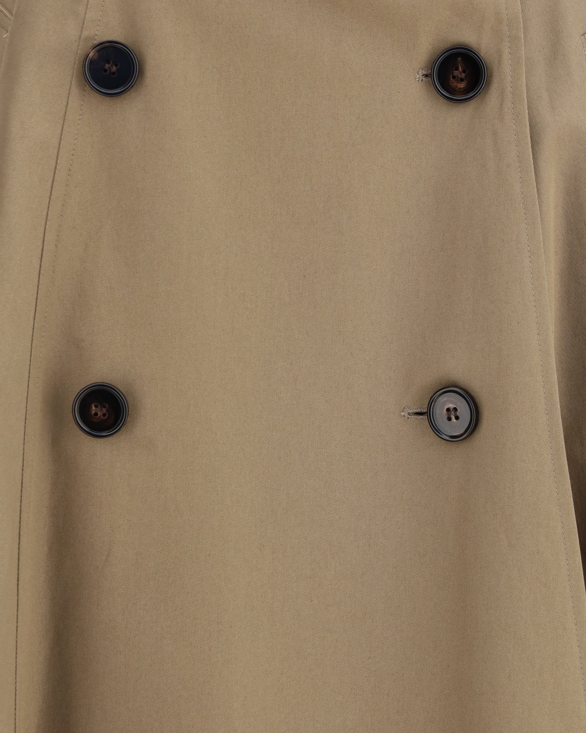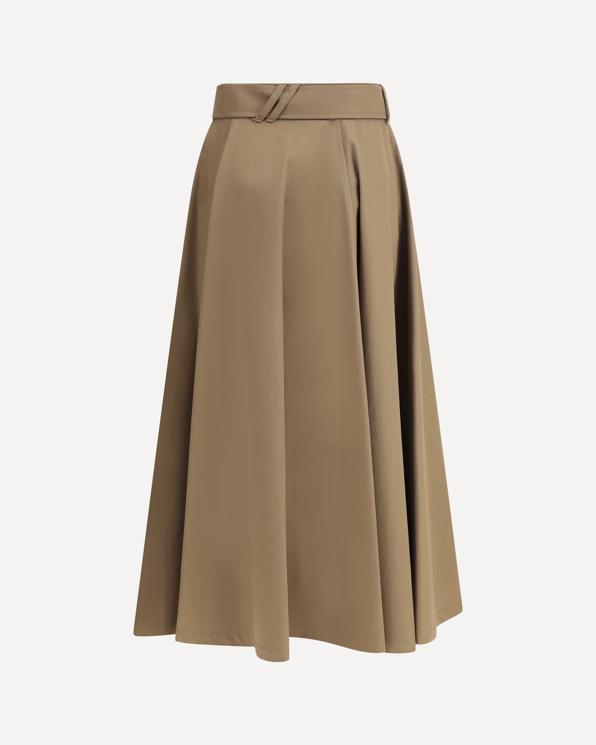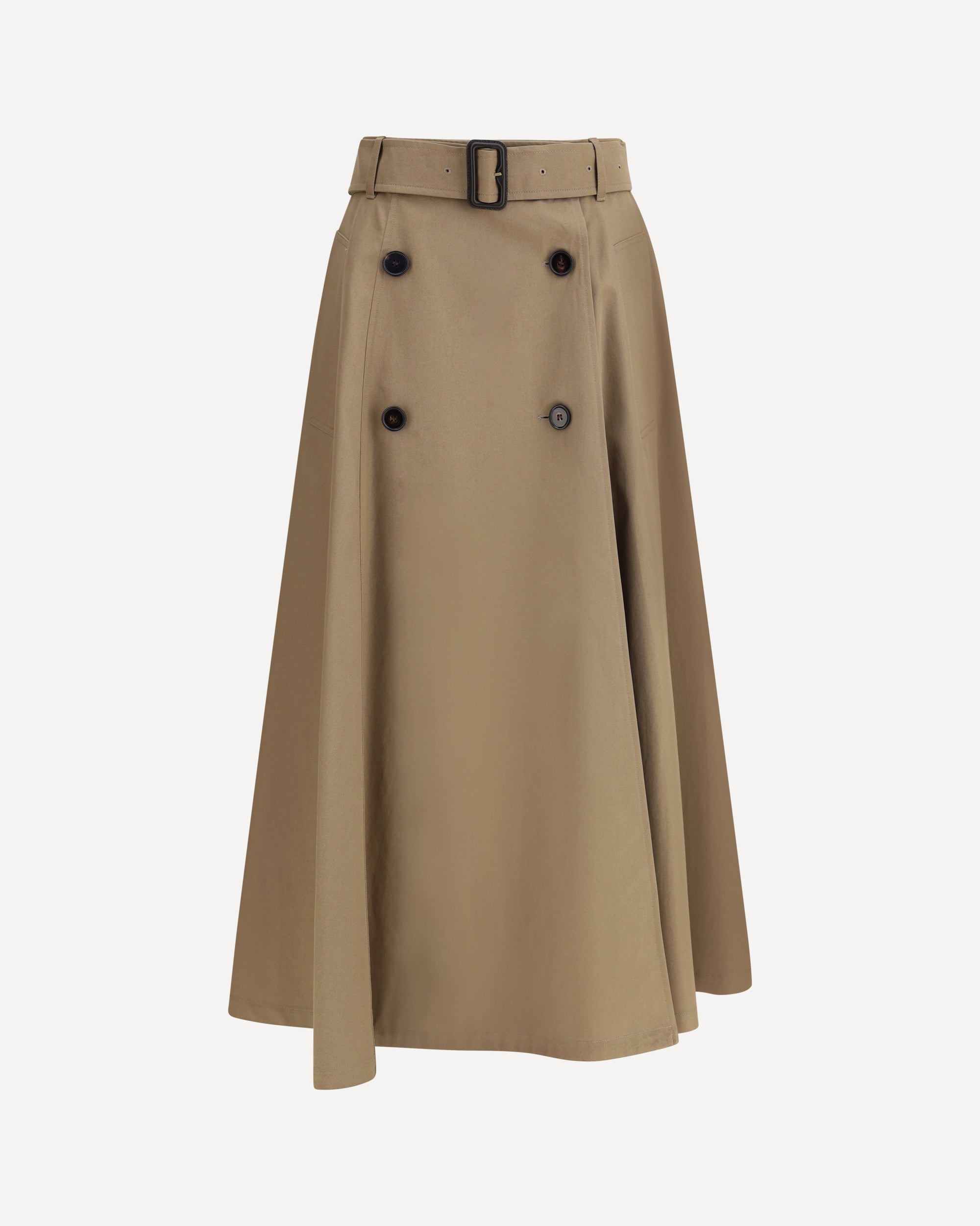 The Trench Midi Skirt by Burberry is a modern reinterpretation of the brand’s iconic rainwear piece, crafted from water-resistant cotton gabardine. The high-waist design is completed with a removable belt featuring a B-shaped buckle, allowing for an adjustable fit and adding a distinctive touch to the design.