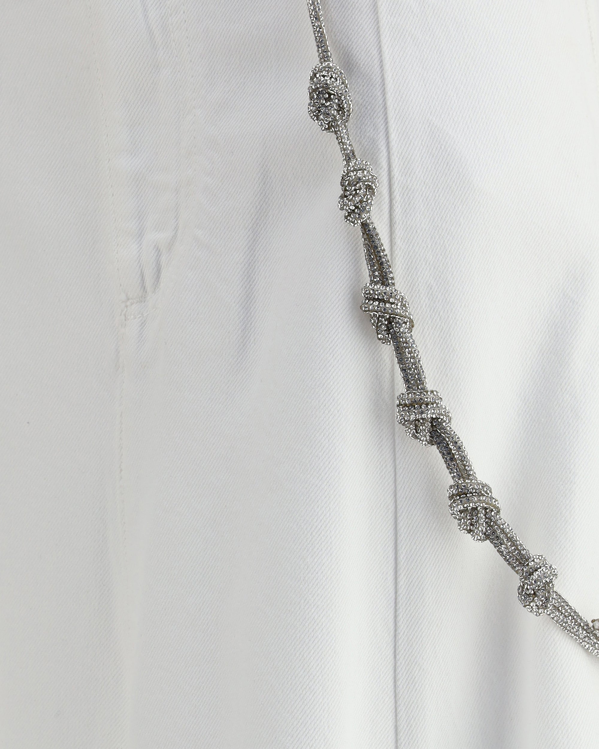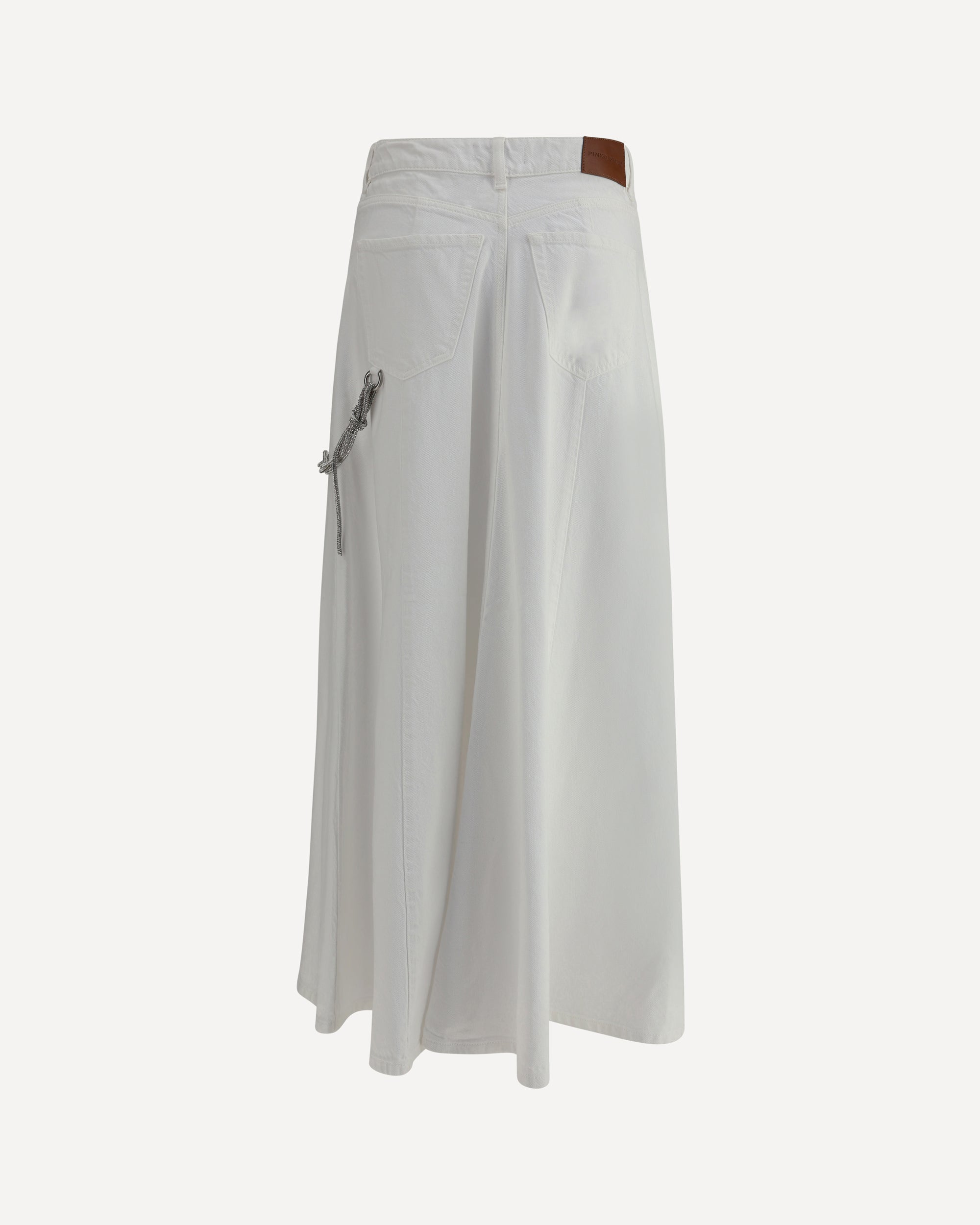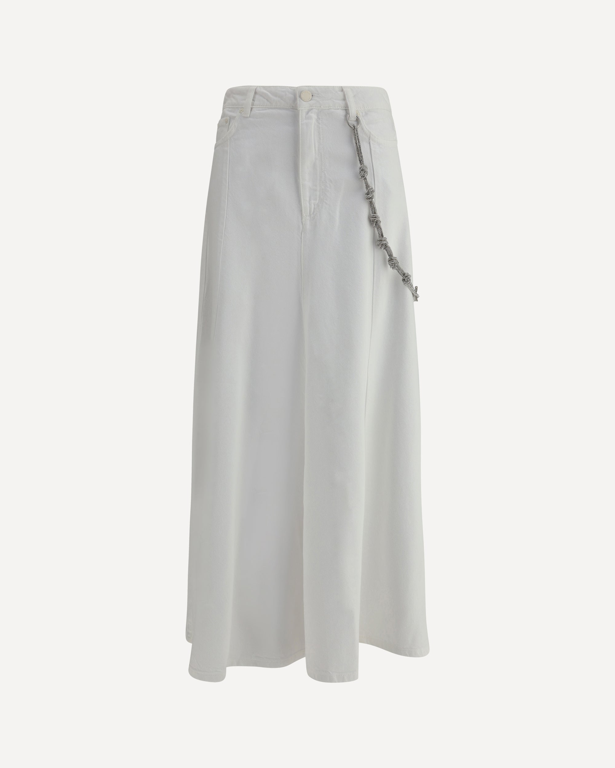 The Pinko denim long Skirt is a sophisticated and contemporary piece. The five-pocket design, flared at the bottom, offers a comfortable fit and an elegant silhouette. The front zip and button closure ensures a secure fit, while the rhinestone chain detail hooked onto the belt loops at the waist adds a touch of sparkle and originality.