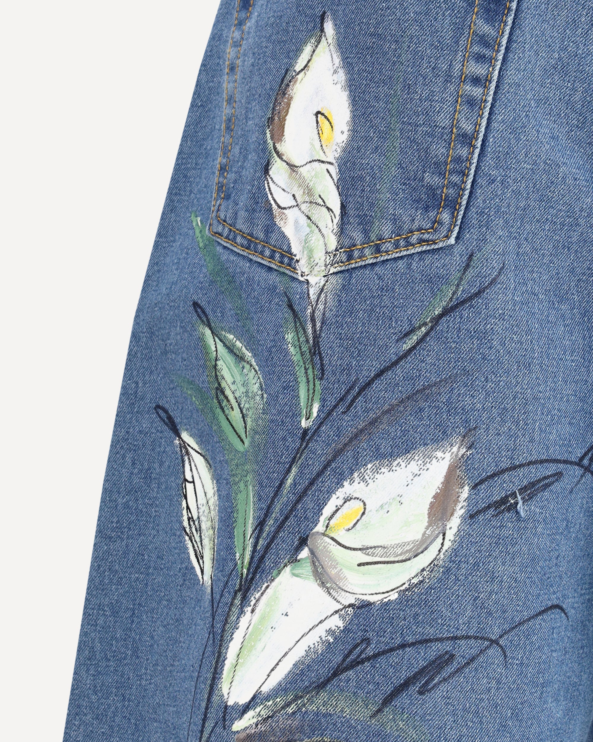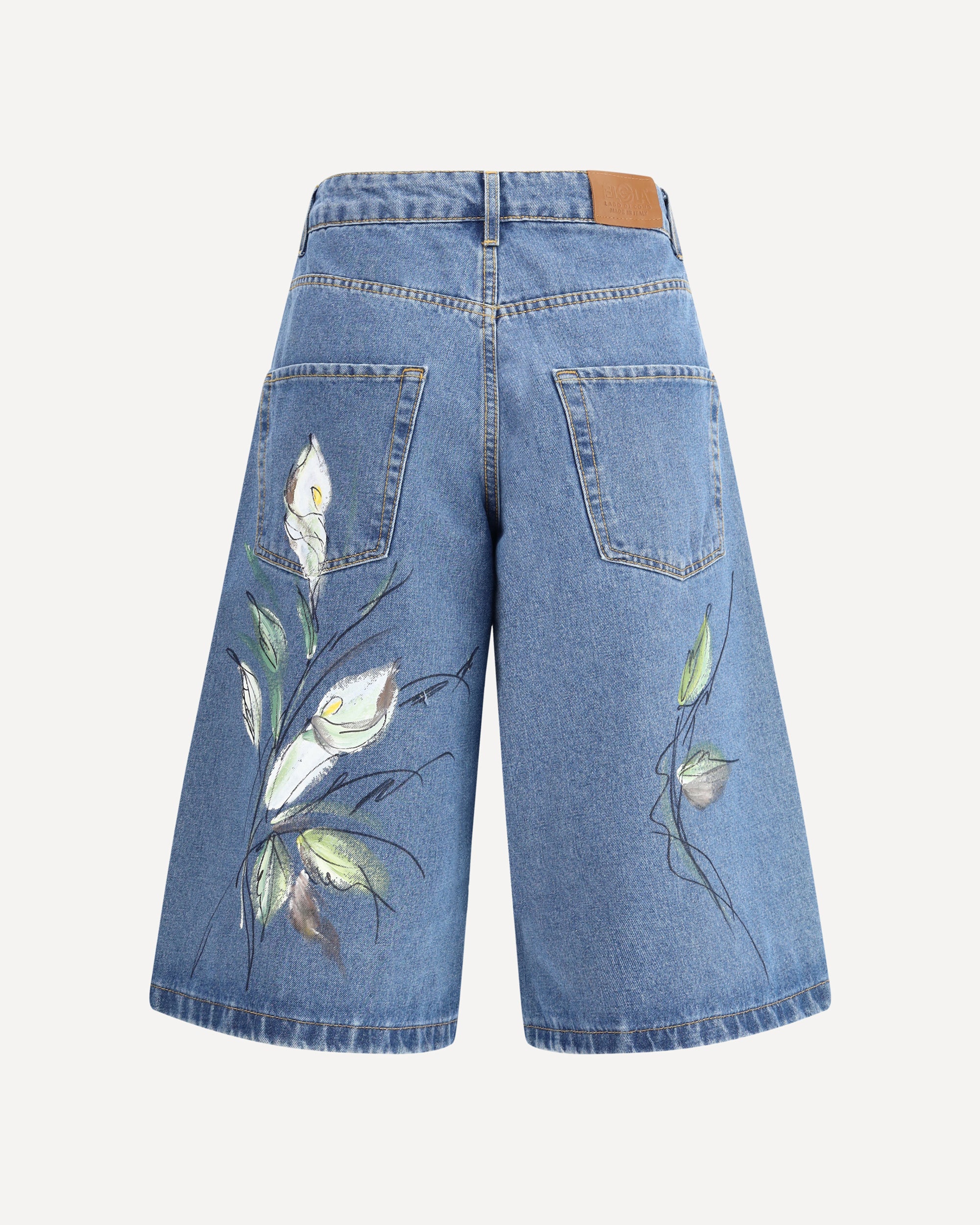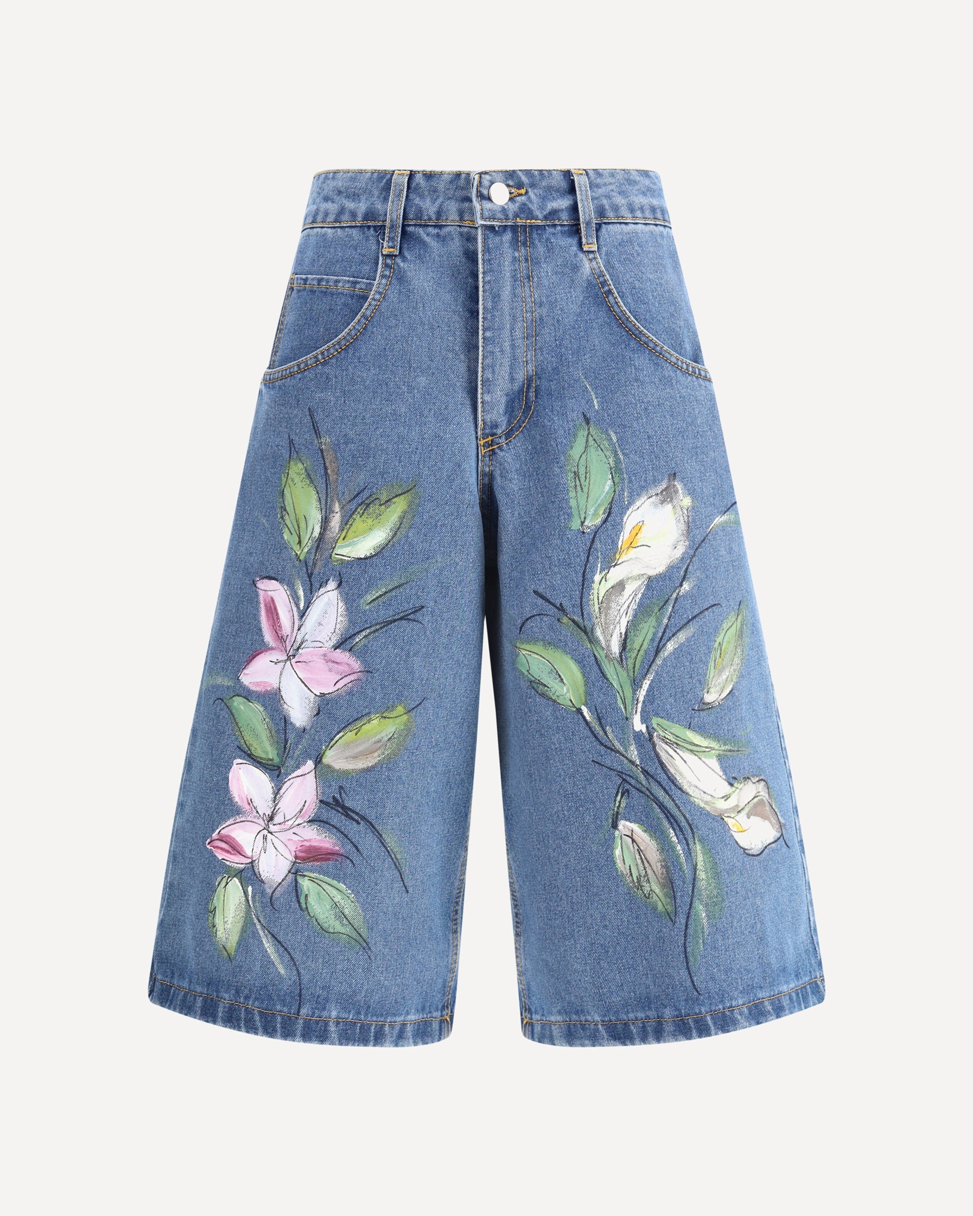 Ella's denim bermuda Shorts offer a casual, cool look. The zip-and-button front closure and classic five-pocket design make them practical and functional. The painted floral pattern on both the front and back adds a unique and creative touch, turning these shorts into a distinctive and stylish garment for summer.