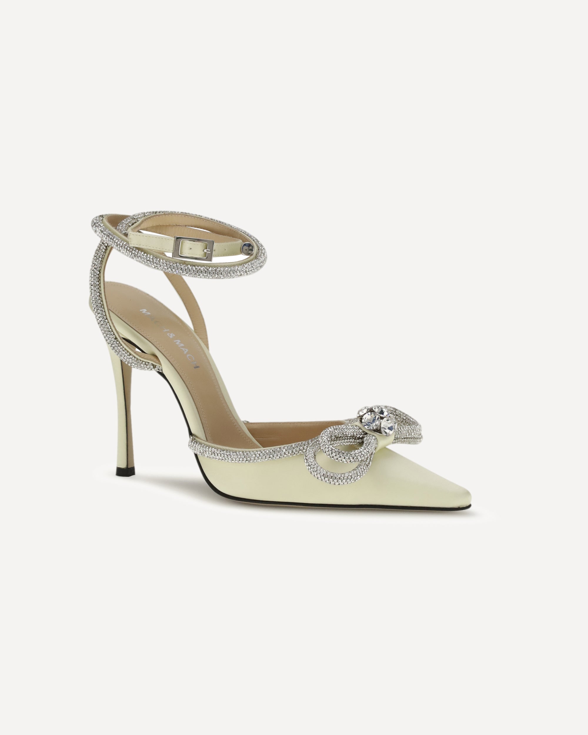 The Pumps by Mach & Mach in satin are embellished with the signature double crystal bow and an ankle strap that enhances their feminine, statement-making appeal. Crafted with sturdy heels and durable soles, they are perfect for adding elegance and sparkle to your most fashionable outings.