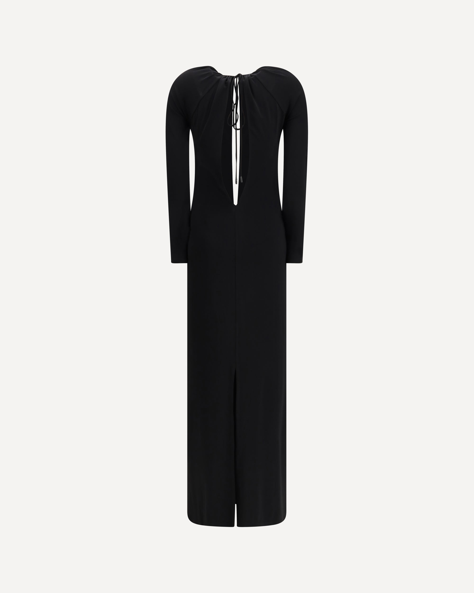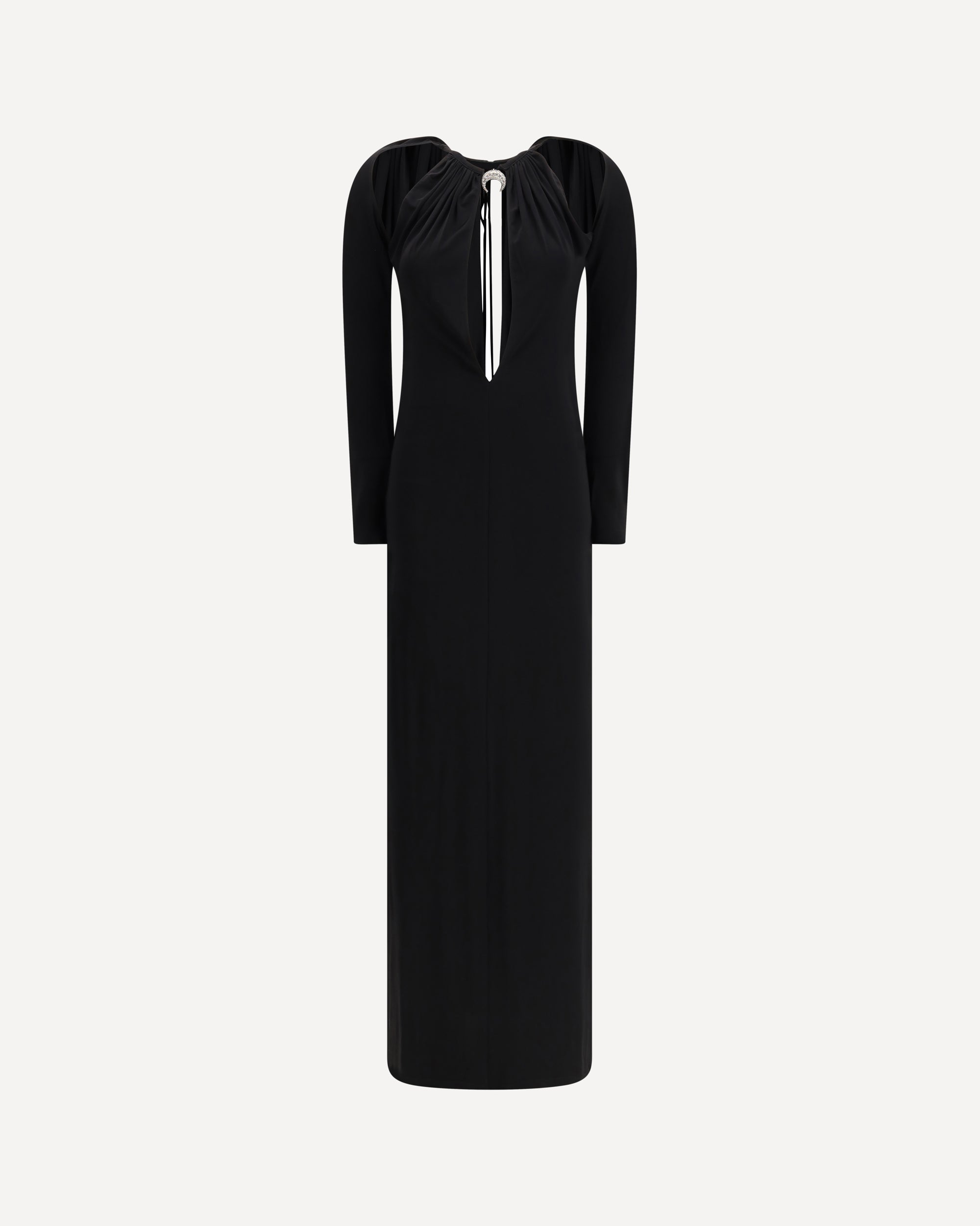 The long draped jersey Dress by Marine Serre embodies sensuality and modernity through fluid lines and distinctive detailing. Crafted from soft jersey, it is adorned with the brand’s signature metallic Moon detail on the front. The fitted silhouette features a round neckline, open back, and adjustable tie fastening at the top. Strategic cut-outs and a central back slit add a bold yet refined allure. Unlined for a lightweight, effortless feel.