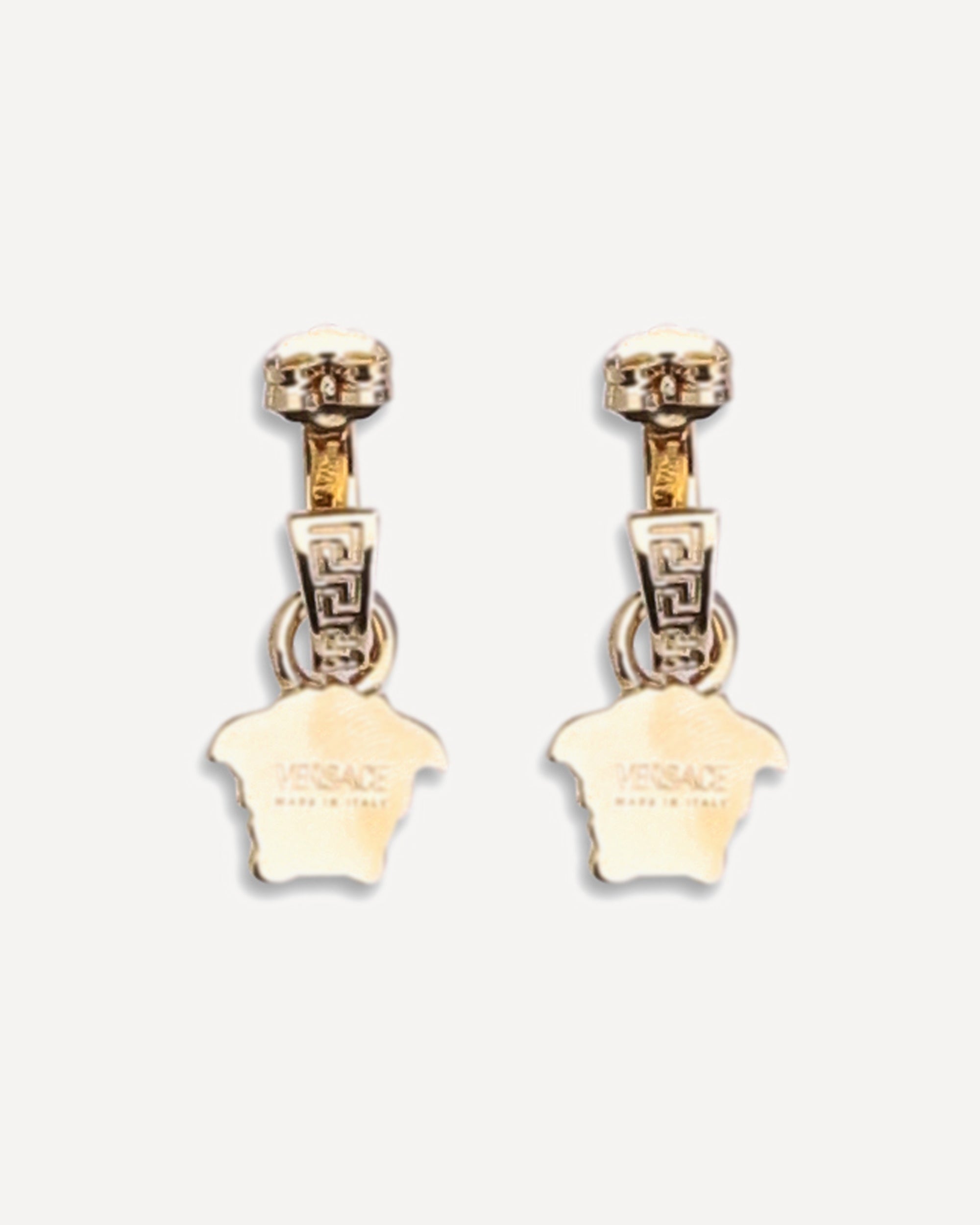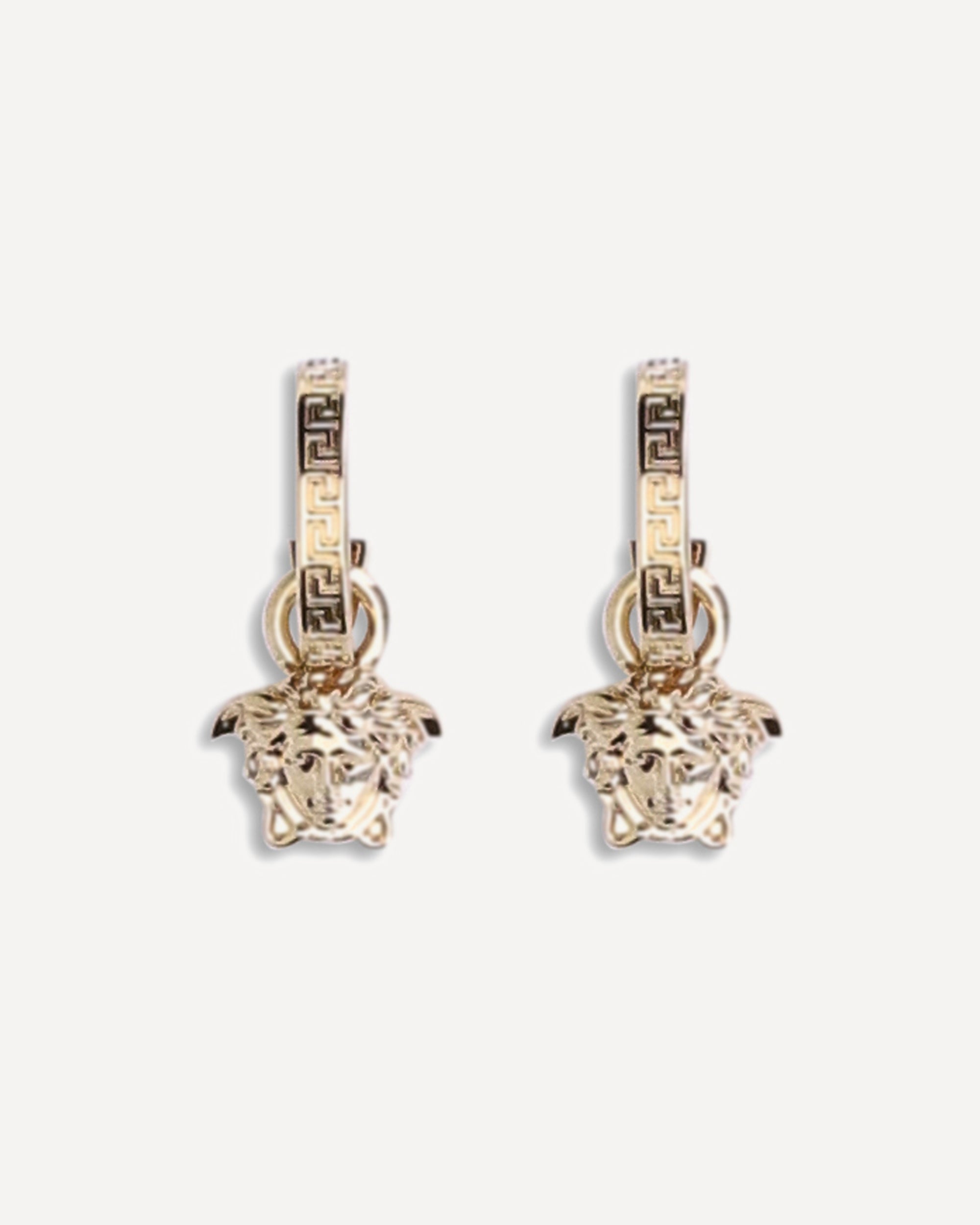 Versace earrings are a bold and distinctive accessory. Composed of small hoops with the iconic texture of the brand, they feature a butterfly closure and a pendant with the famous Medusa head, a timeless symbol of Versace style.
