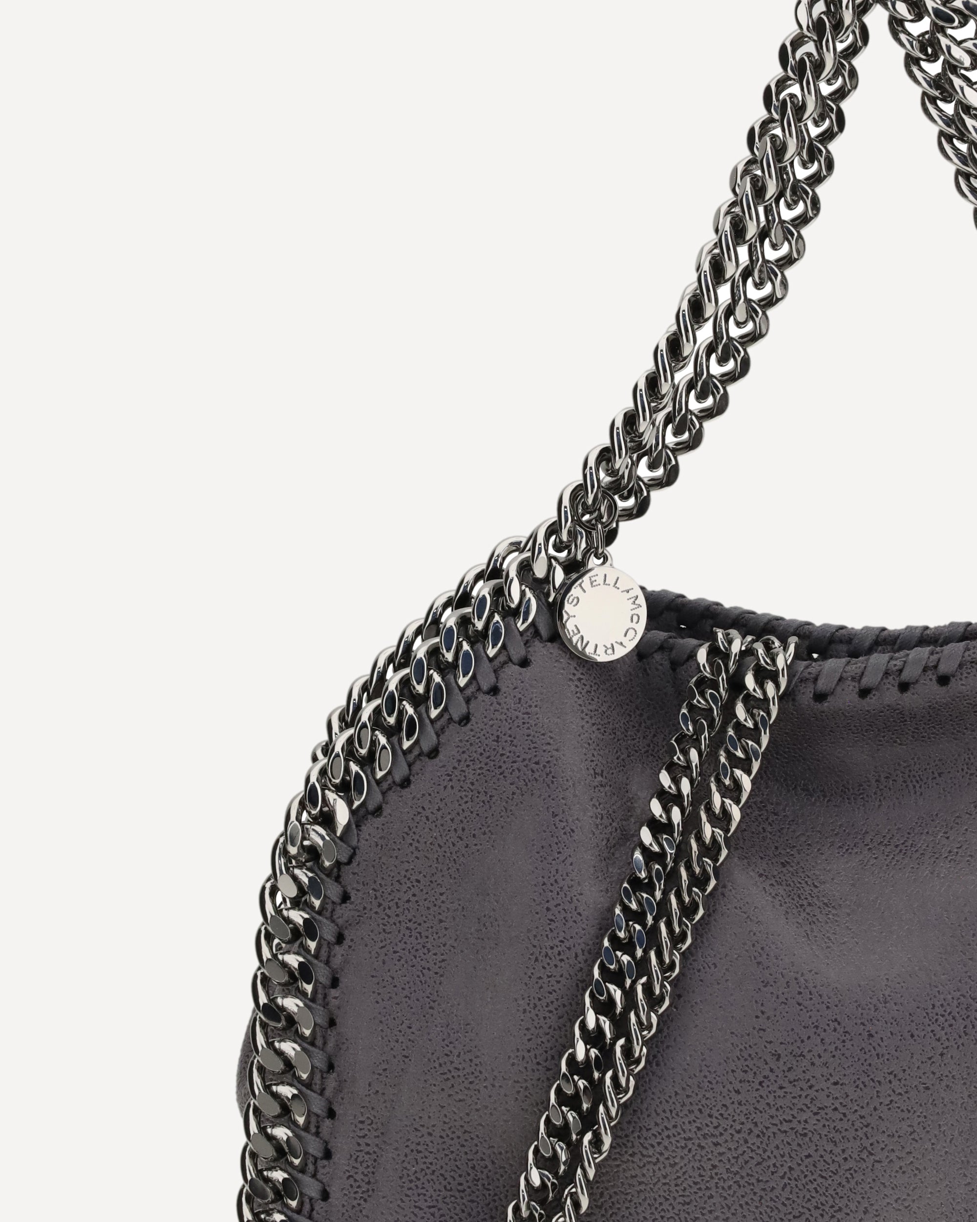 The Falabella mini Tote Handbag by Stella McCartney is a cruelty-free style icon, recognizable by its distinctive chain details. It features a silver-tone chain shoulder strap and handles, defining its unique, shiny silhouette. The magnetic flap closure ensures convenience and security. The interior, lined with the brand's logo, includes a convenient open branded pocket, perfect for essentials. A round silver brand logo pendant completes the design, adding a final touch of recognition and sophistication.