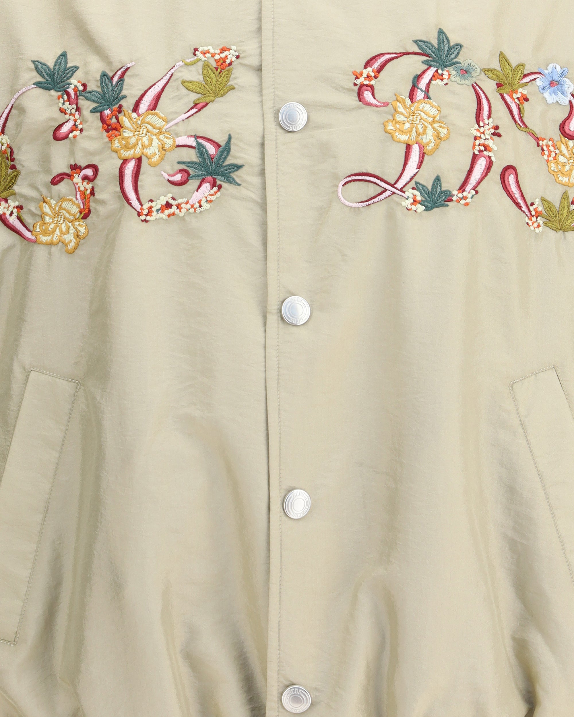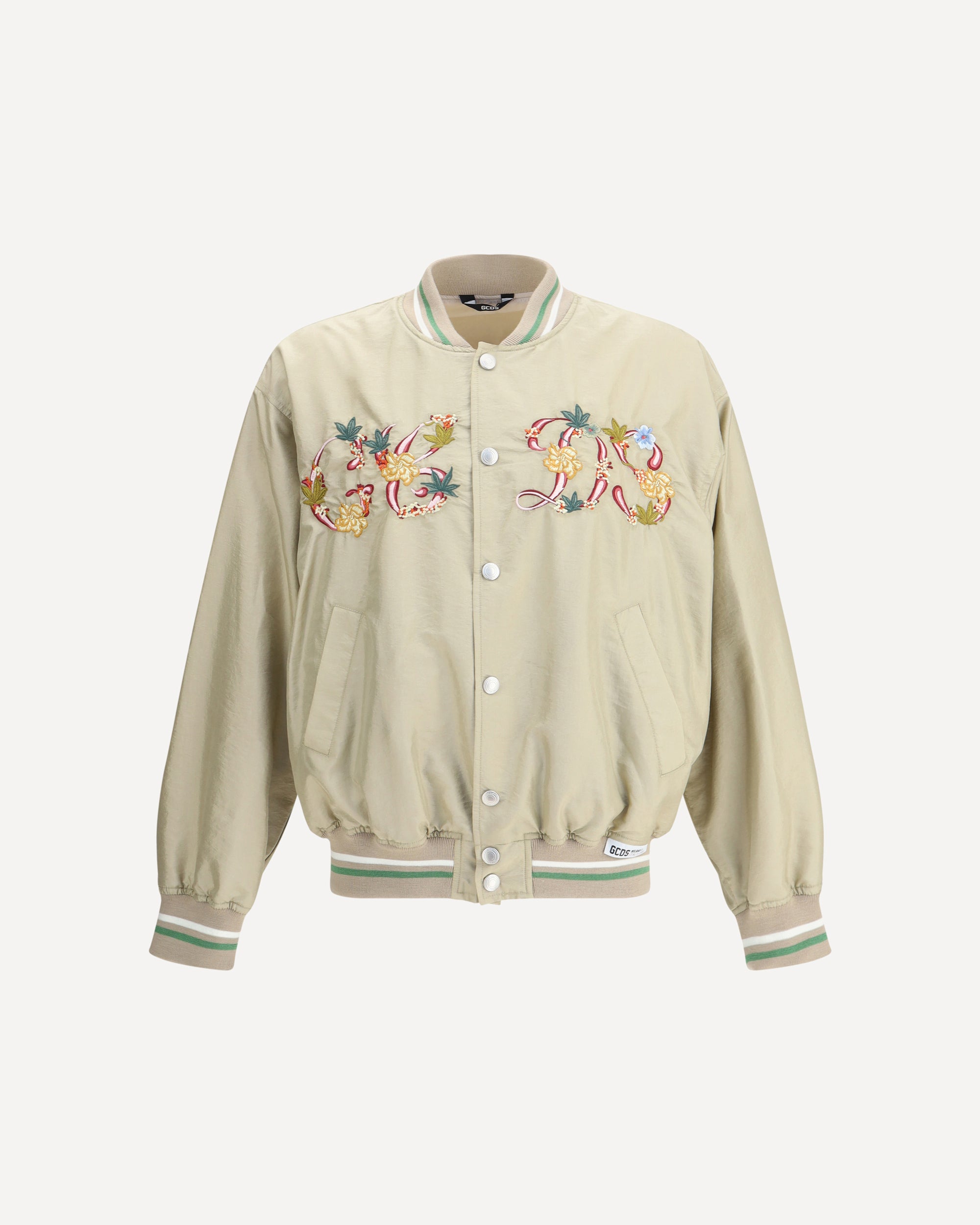 The Varsity bomber Jacket by GCDS combines a college aesthetic with contemporary and sophisticated details. Featuring a front button closure, it has ribbed cuffs and hem for a snug and comfortable fit. Two practical buttoned welt pockets are positioned on the sides for functionality and style. The distinctive detail is the iconic GCDS monogram embroidered on the chest, embellished with floral motifs, which gives the garment an original and decorative touch. A perfect mix of streetwear and craftsmanship.