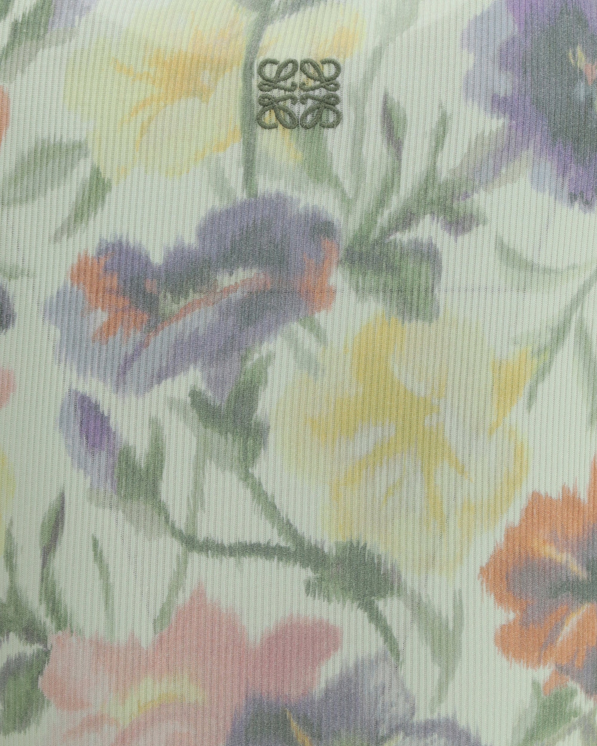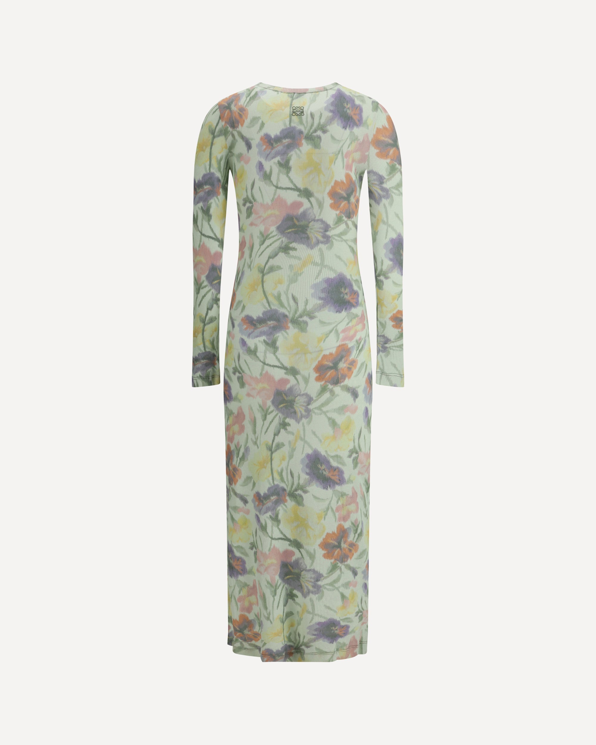 The Loewe floral maxi Dress is an elegant and vibrant piece that combines the charm of contemporary design with the beauty of a delicate floral pattern. The ribbed crew neck and long sleeves offer a comfortable and sophisticated fit. The ribbed design adds texture to the fabric, while the iconic brand logo sewn on the back adds a distinctive and classy touch. The floral pattern, a symbol of freshness and nature, makes the dress perfect for special occasions, but also for an everyday look that does not go unnoticed.