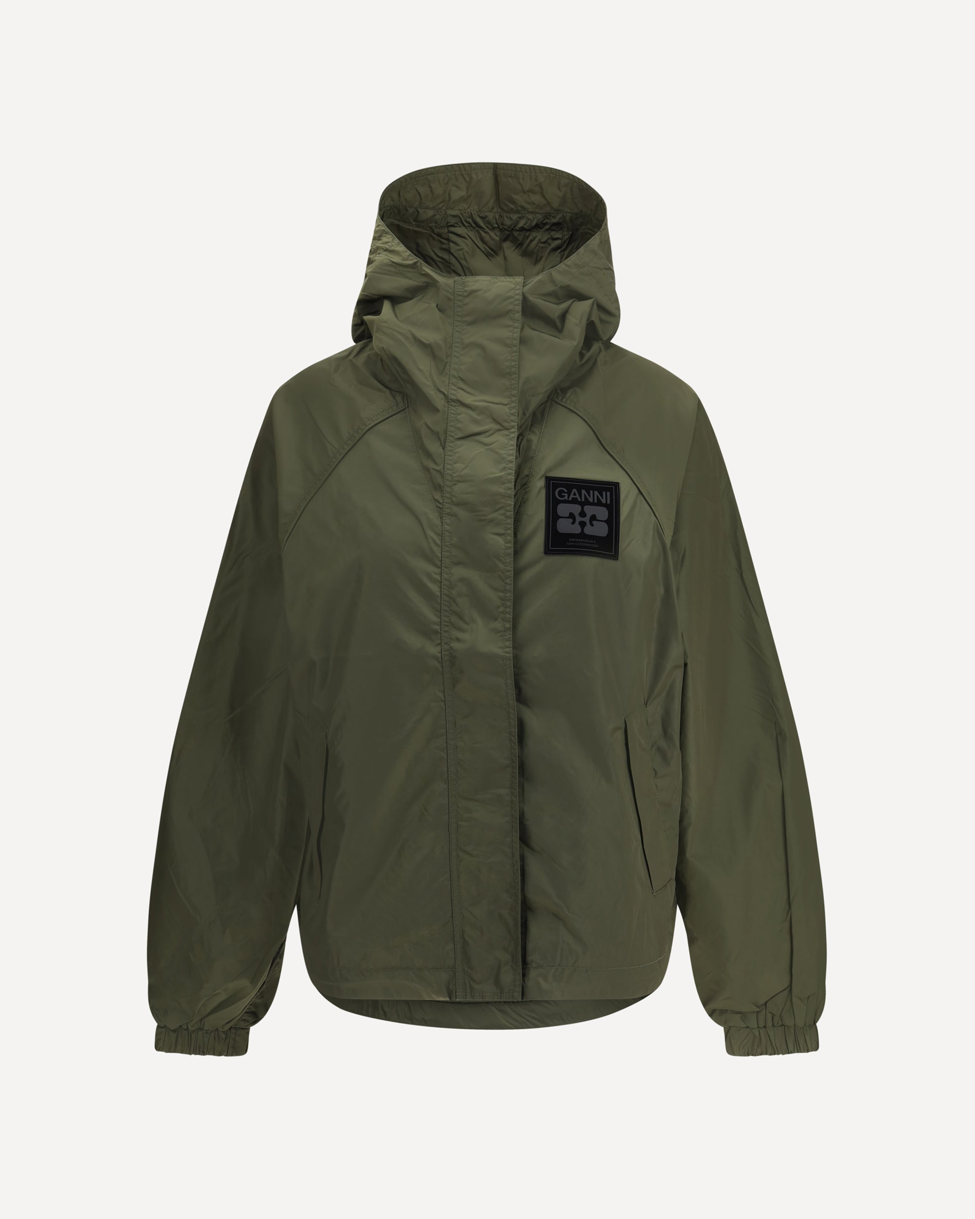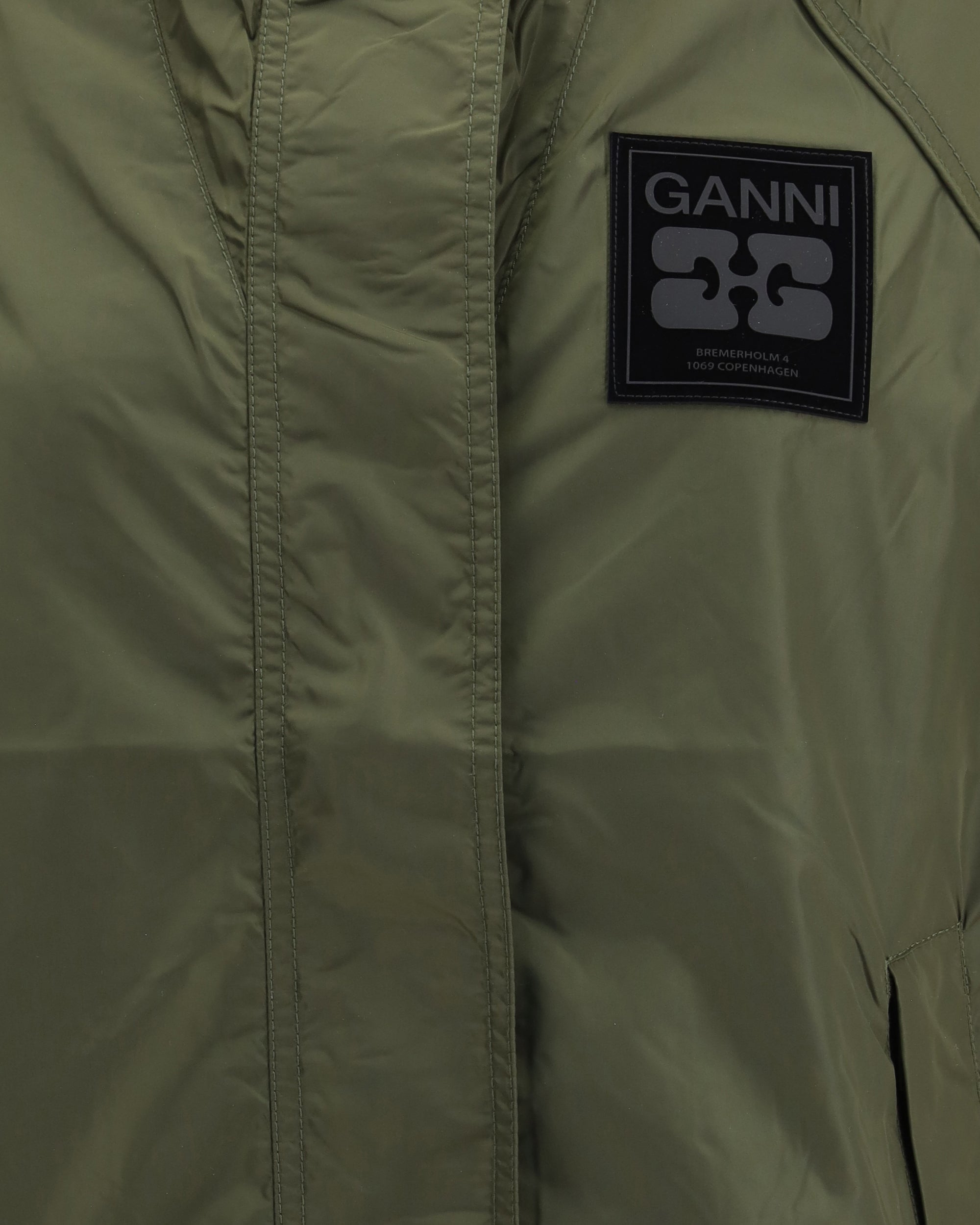 Ganni's Waterproof Jacket is a practical garment with a contemporary style designed to face bad weather with personality. Featuring a front zipper closure, it features a hooded design and convenient side pockets. The GANNI logo patch applied on the chest signs the model with a distinctive touch.