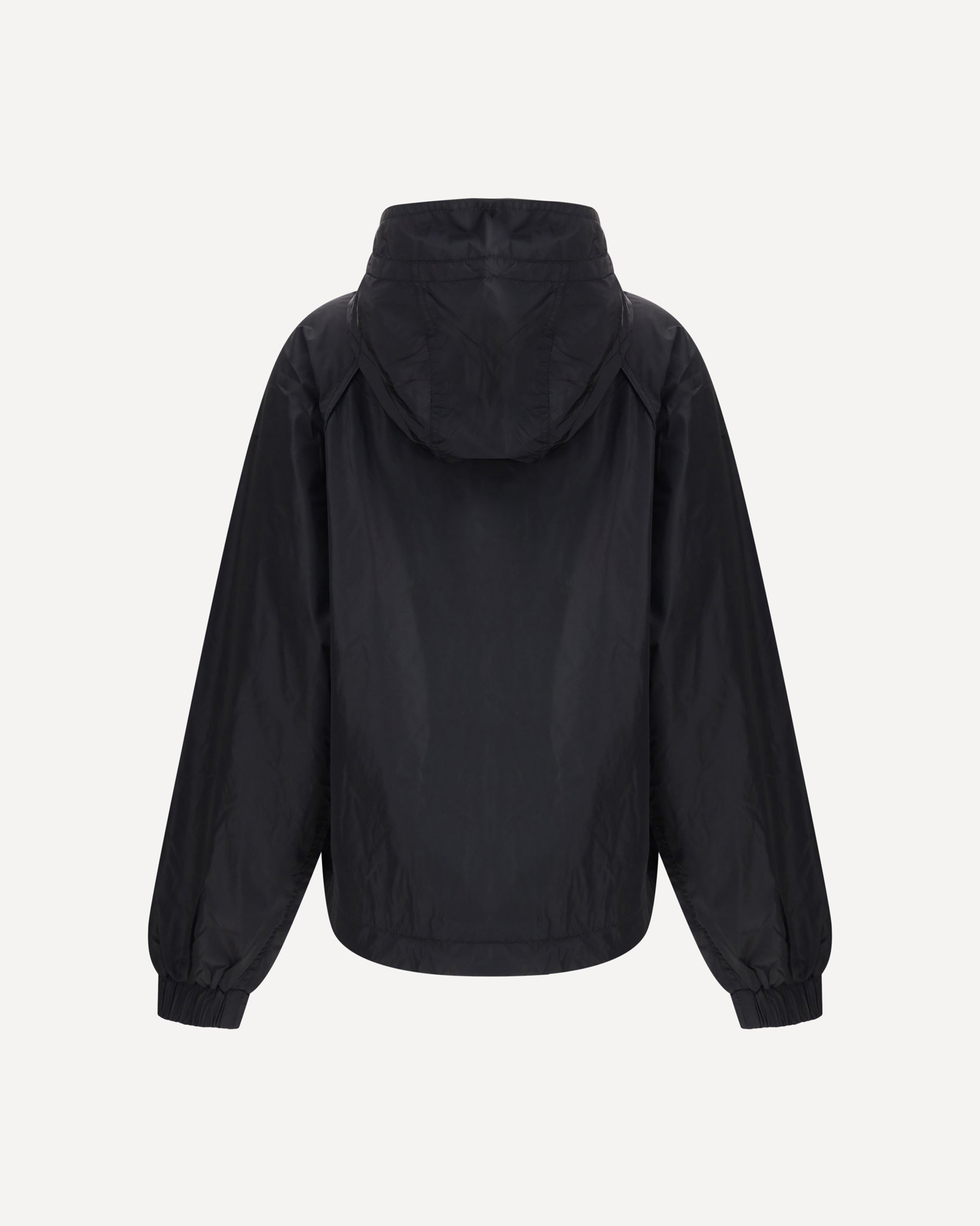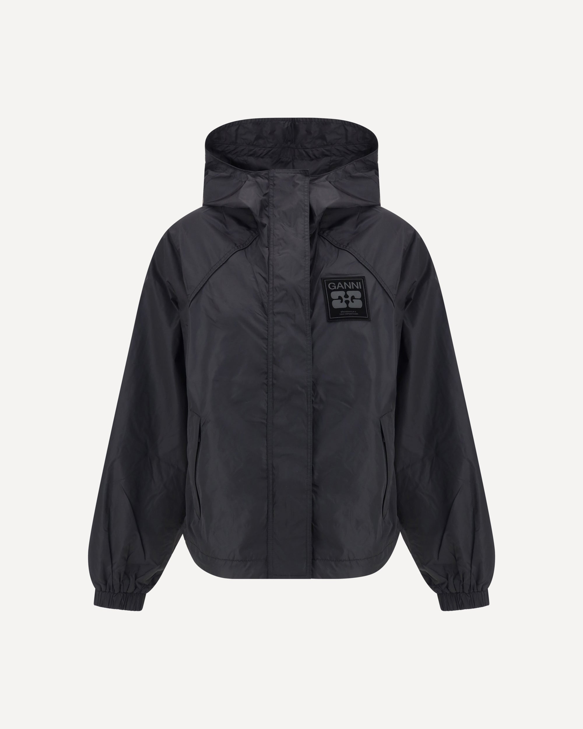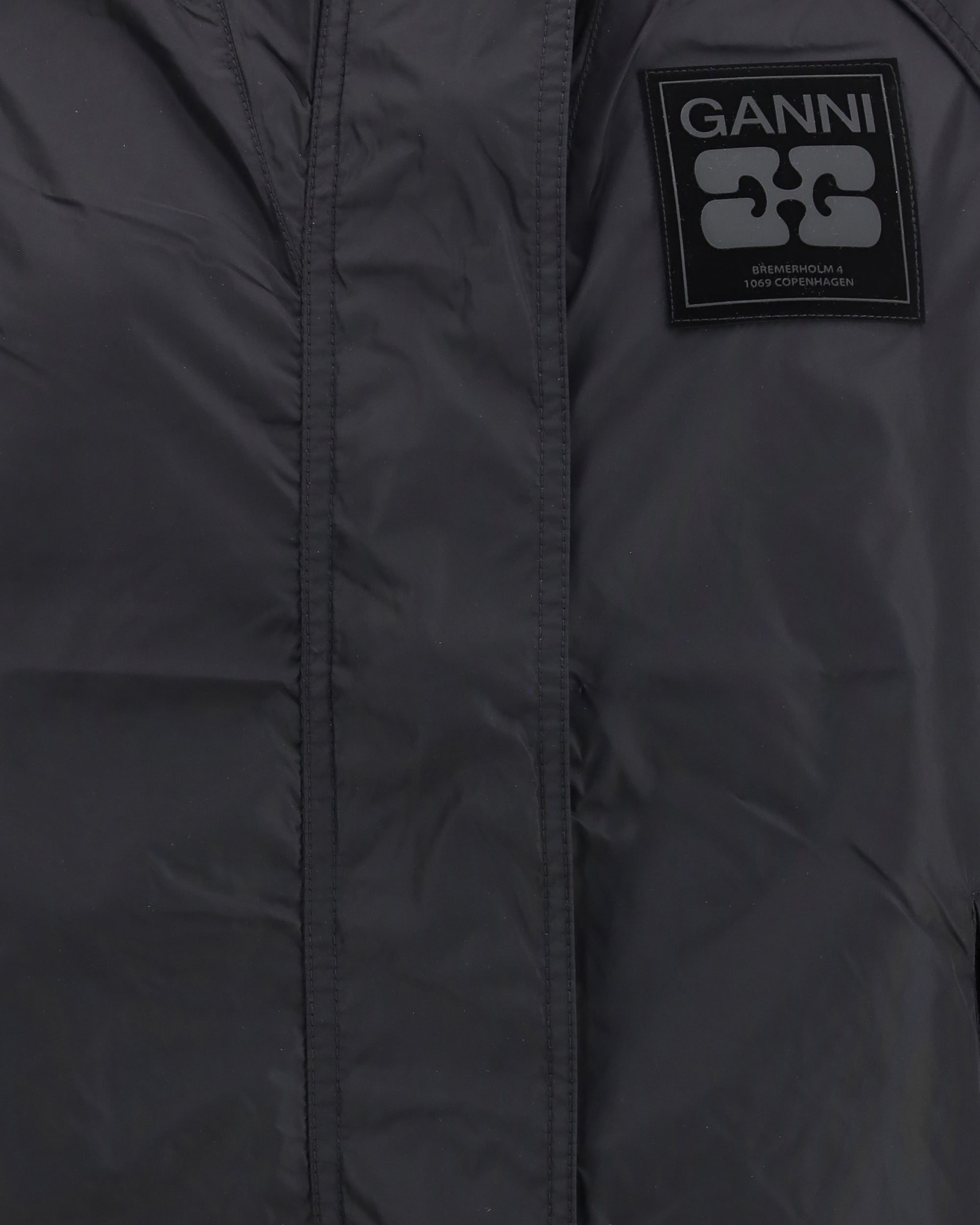 The Recycled Nylon Jacket by Ganni channels a sporty yet contemporary spirit. Its short hooded design combines practicality with urban character, while dropped shoulders and a concealed closure bring a relaxed touch. Side welt pockets complete the clean silhouette, defined by a straight hem and a subtle tonal logo, making it a piece that blends sustainability with modern aesthetics.