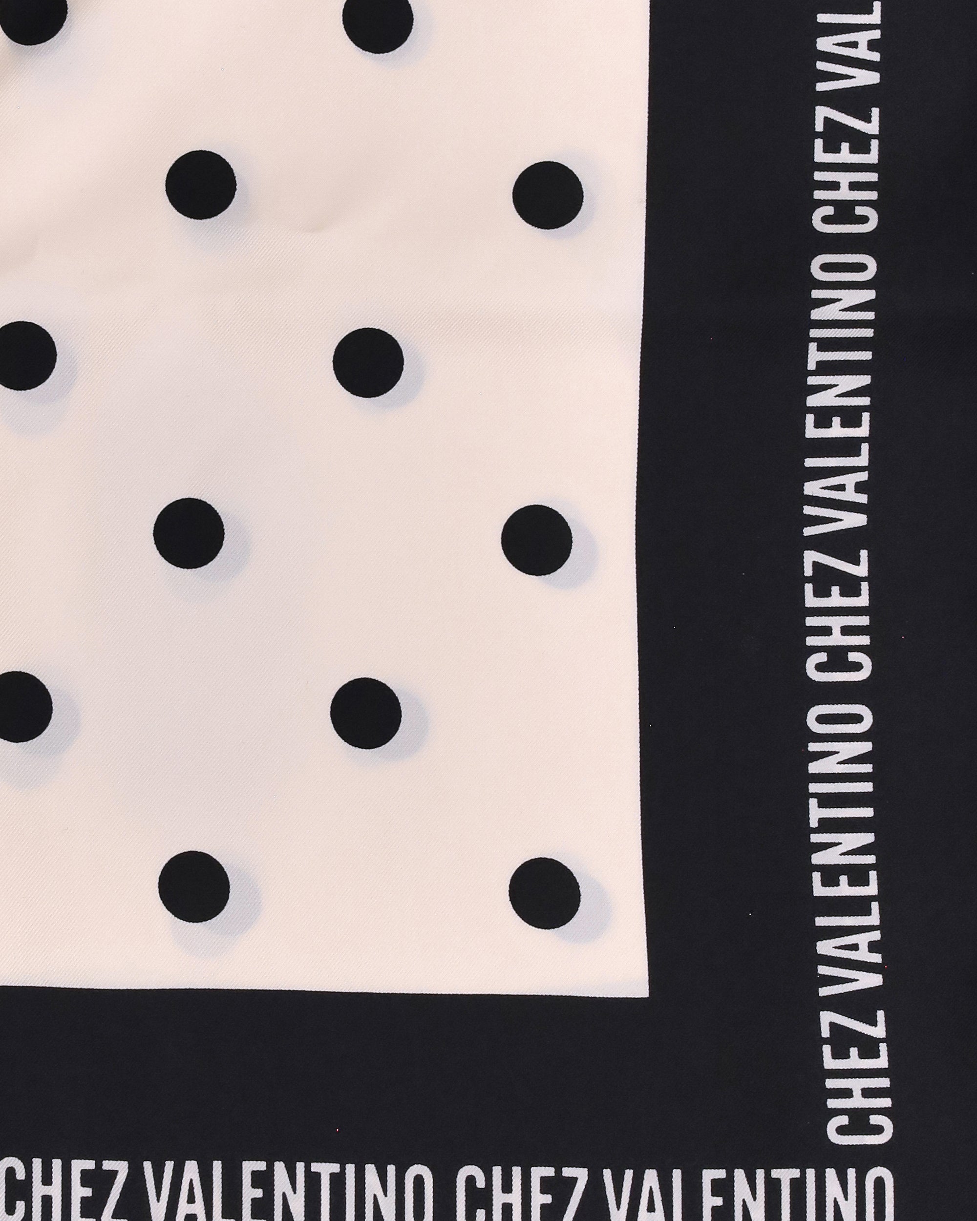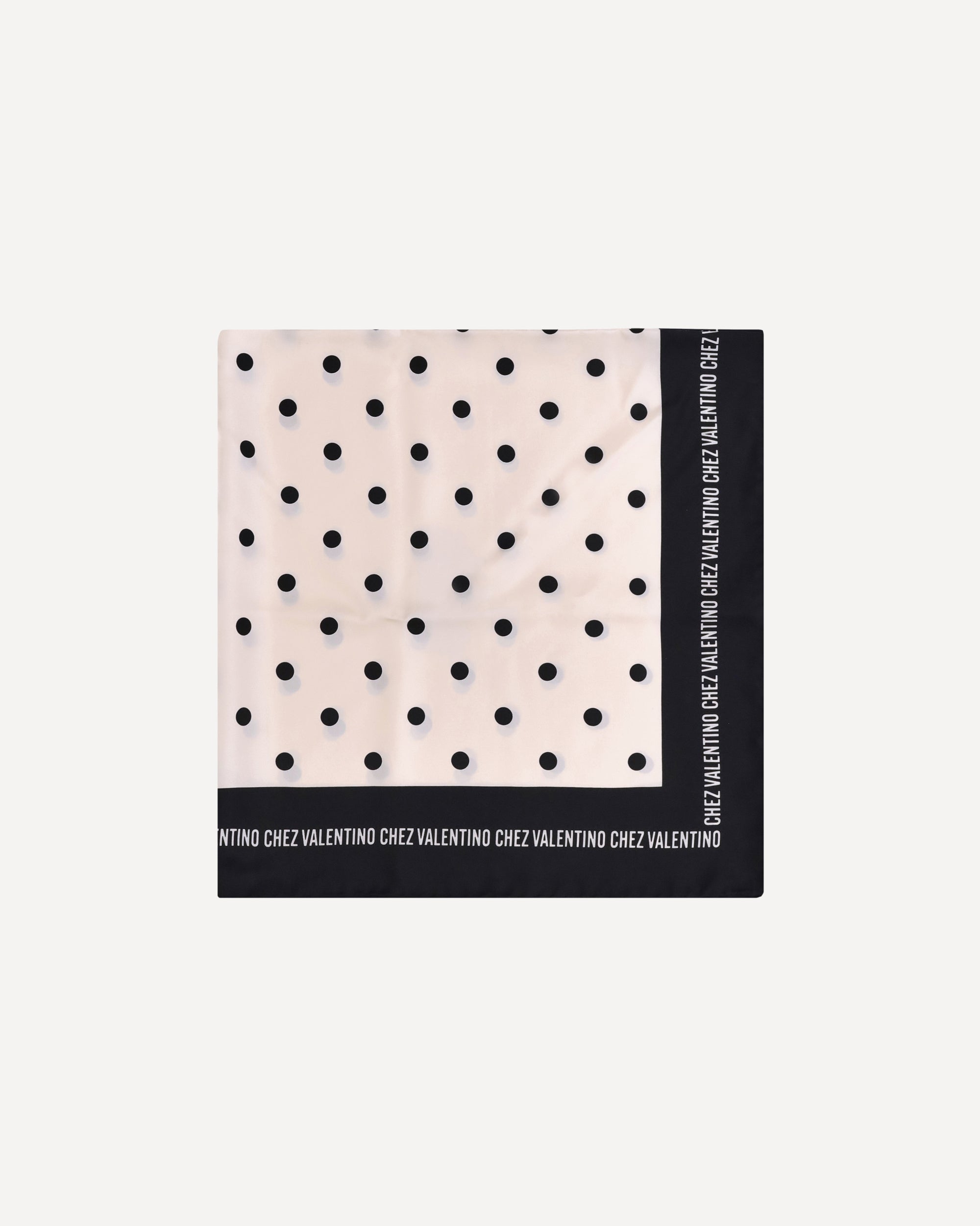 The Valentino Garavani polka dot silk Scarf is an elegant accessory with a retro flair, made of soft, high-quality silk. Featuring a refined polka dot pattern, it is embellished with Chez Valentino lettering along the profiles, adding a distinctive and contemporary touch. Perfect for completing the look with a sophisticated and sophisticated detail.