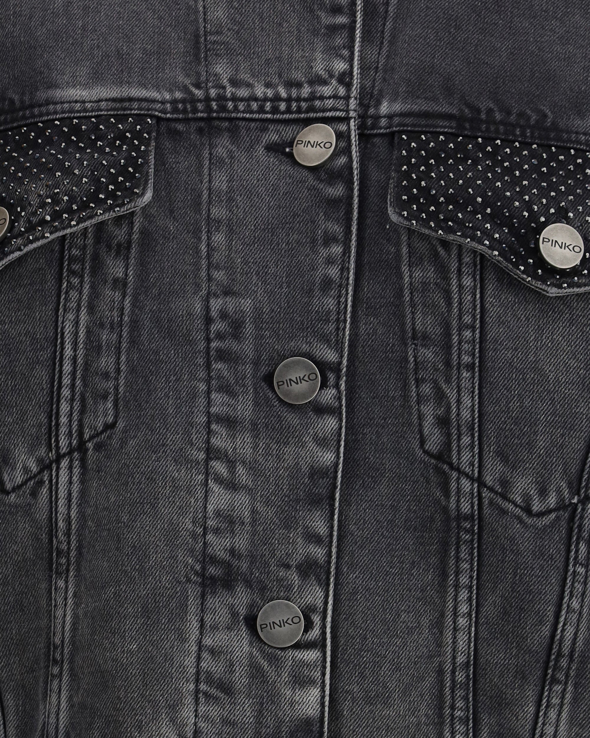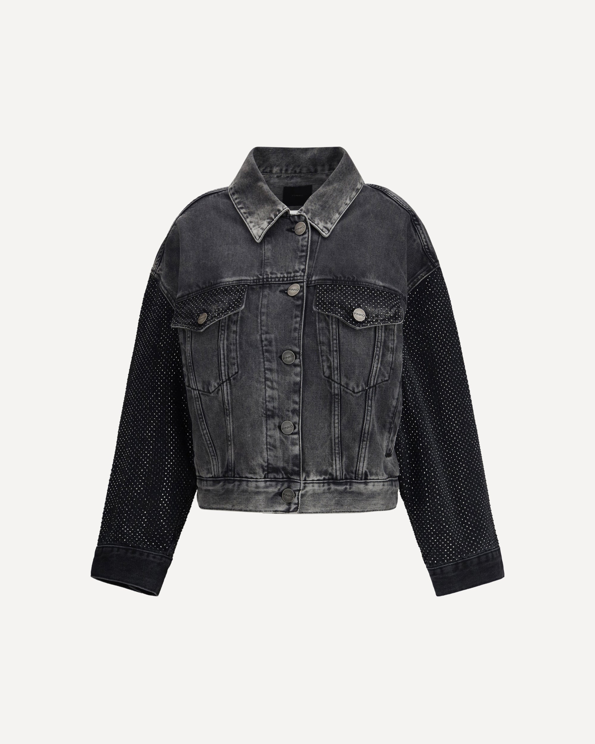The Trucker jacket features a loose, slightly oversized fit with a workwear-inspired style. Made from rigid Black Cotton Denim with a stone-wash finish, it includes contrast patches and small faceted studs for added detail. The design features a shirt collar, flap front pockets with buttons, adjustable closures at the hem and cuffs, and a front button fastening. Pair it with matching denim for a standout coordinated look.