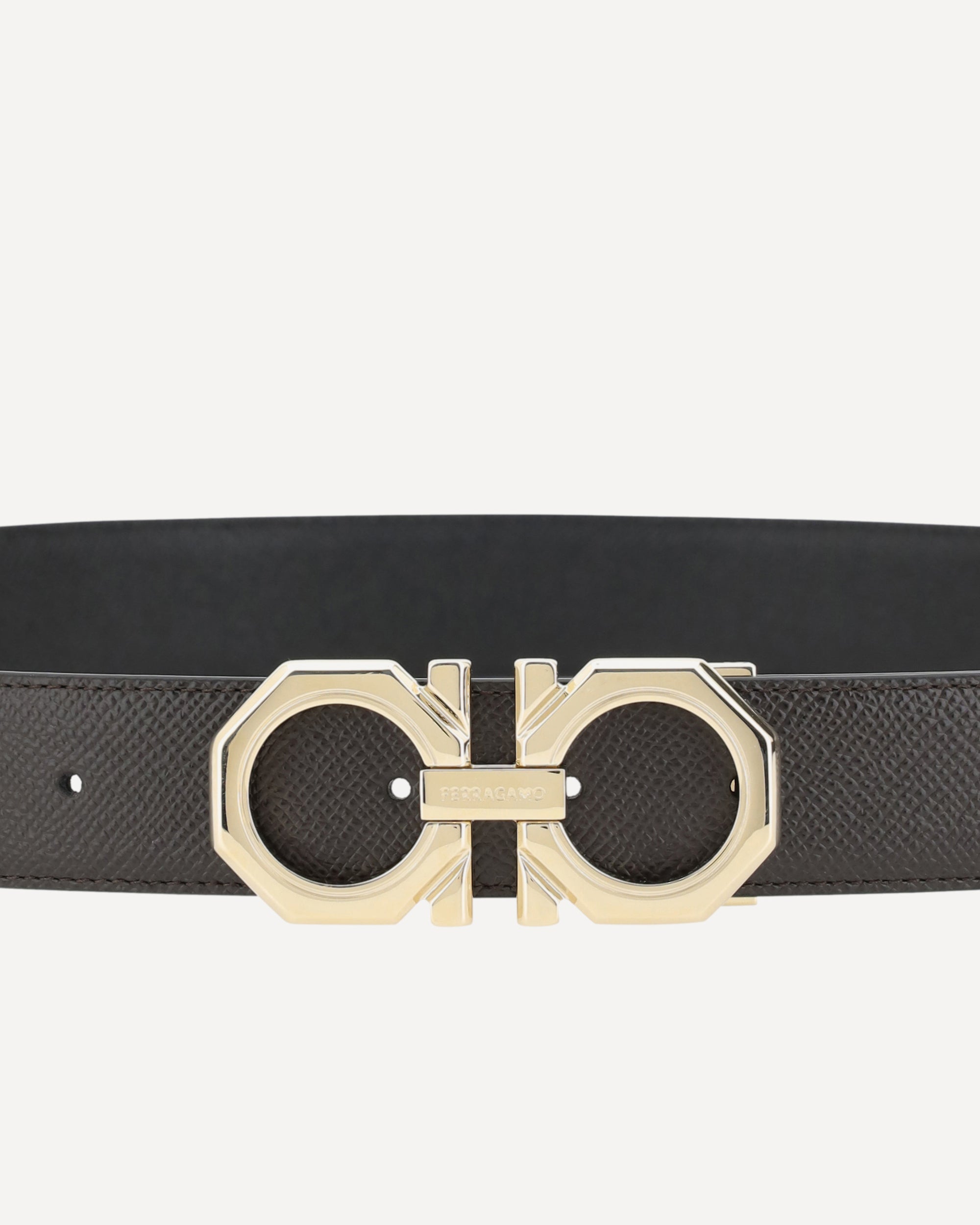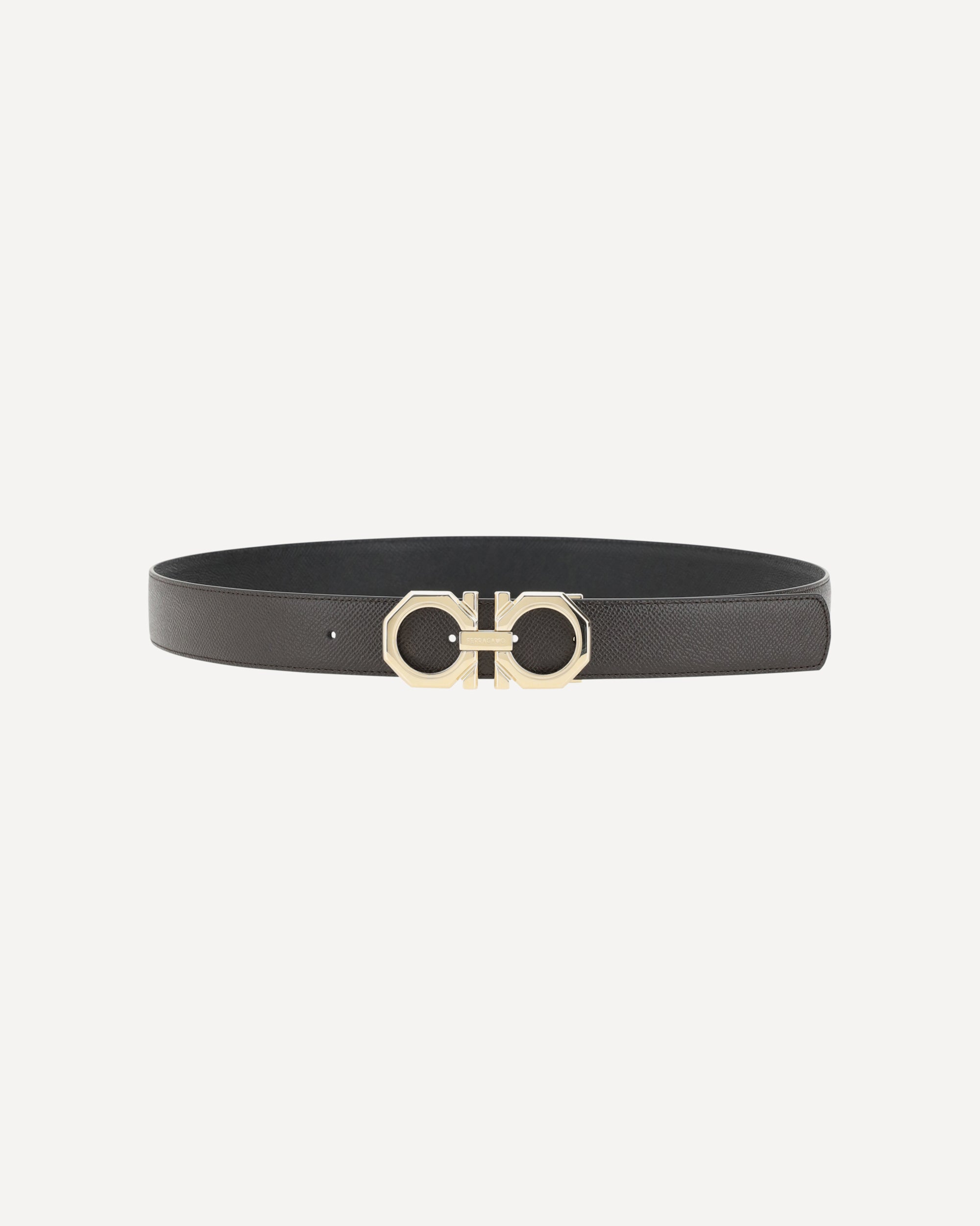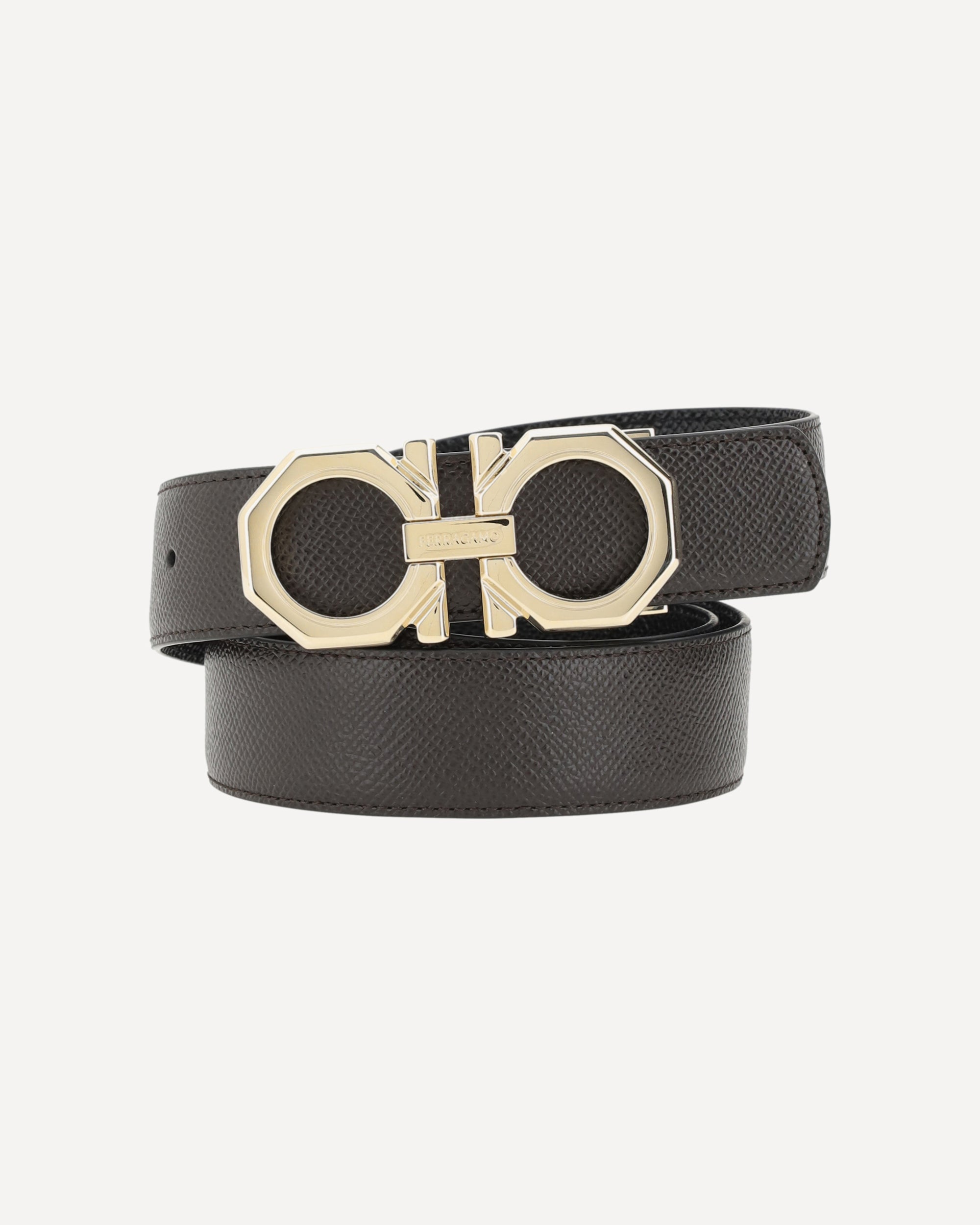 Ferragamo's Gancini Belt is an elegant and sophisticated accessory, featuring a grained leather design that gives a rich texture and refined look. The metal buckle, with the iconic Gancini logo, adds a distinctive and recognizable detail, a symbol of the brand's luxury and craftsmanship. This model combines the quality of leather with a simple yet striking design, making it perfect for completing formal or casual looks with a touch of timeless class.