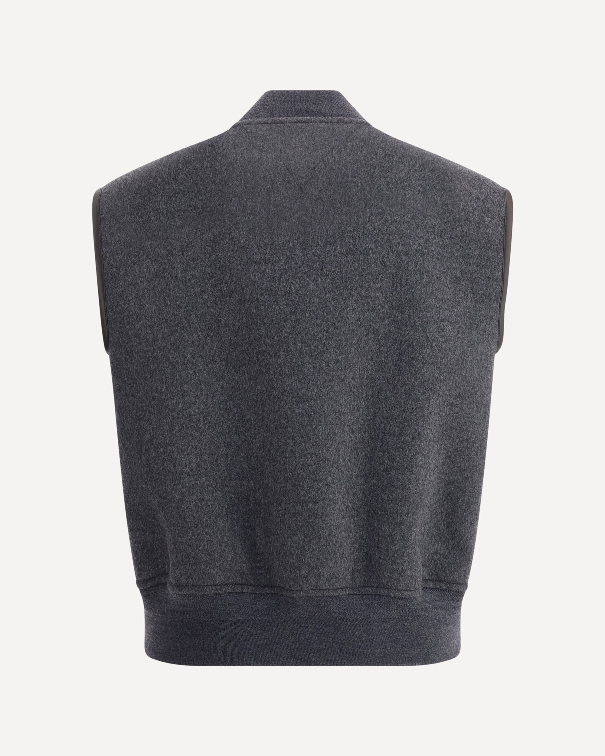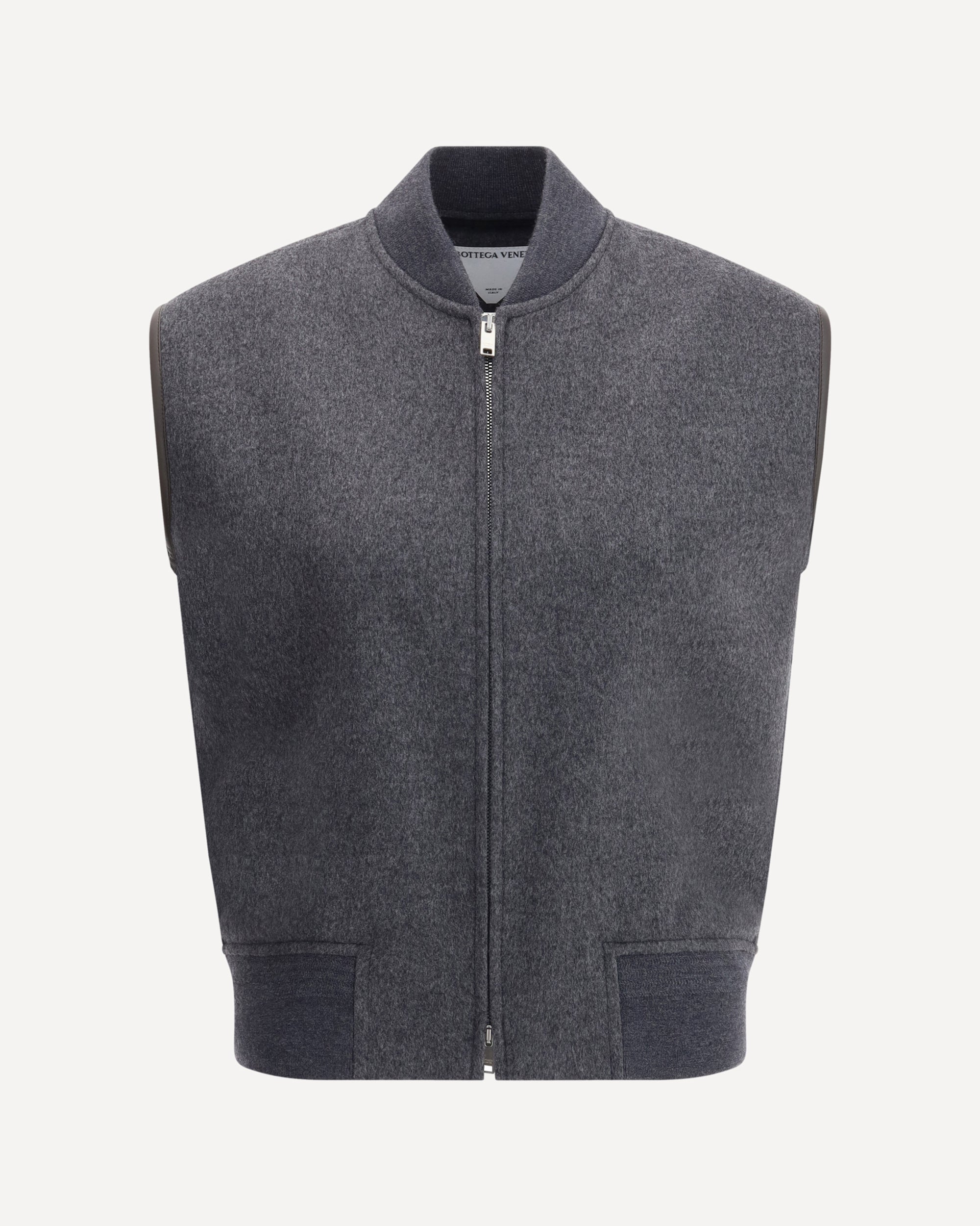 Bottega Veneta's Vest is made of fine double-faced wool, with an essential and refined design. Leather piping adds a touch of sophistication, while the zipper closure lends practicality and linearity. The model is unlined and features a regular cut, ideal for wearing on its own or as a midlayer with elegance and versatility.