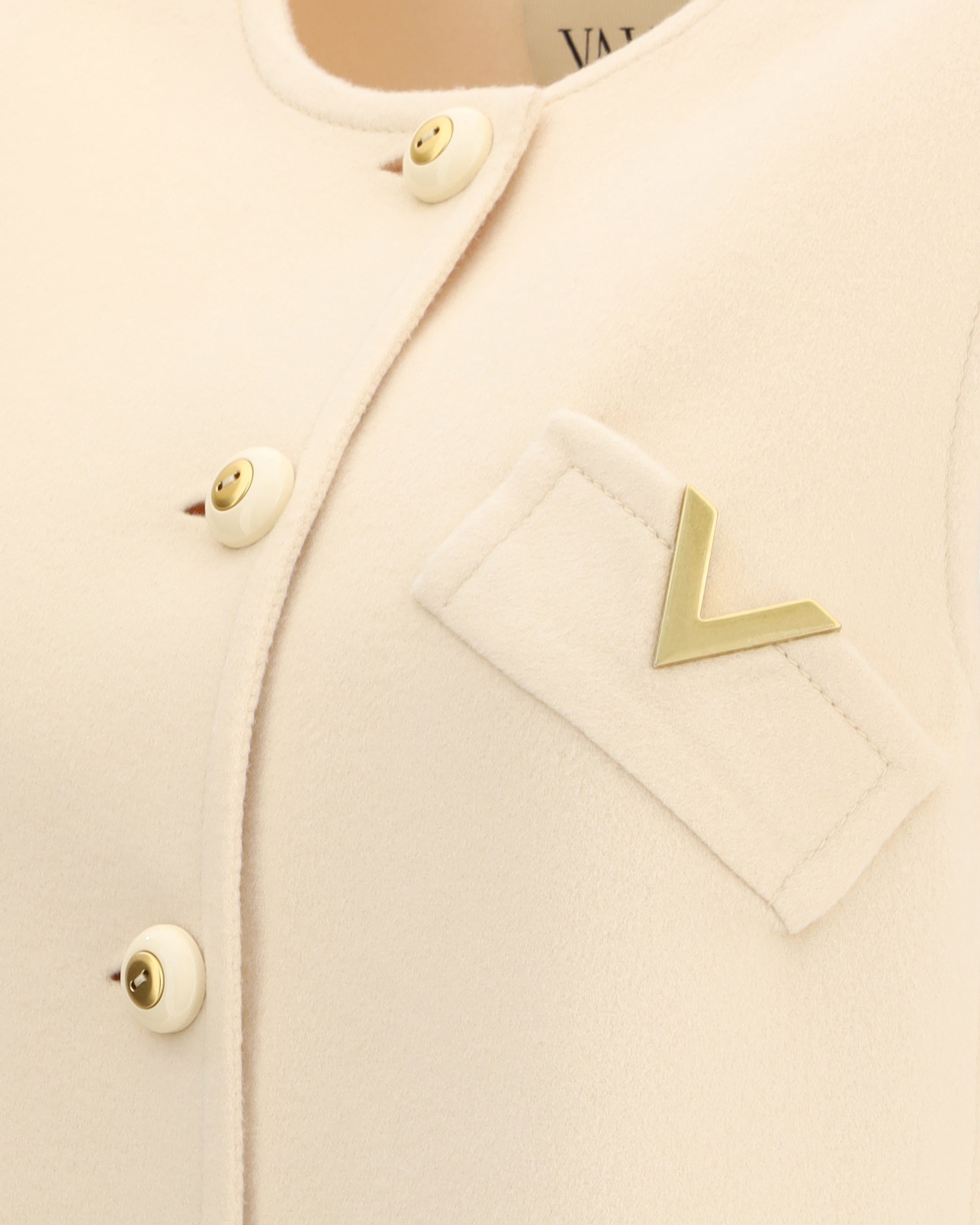 The compact drap long Dress by Valentino is made from a fine blend of virgin wool and cashmere, providing comfort and warmth. It features a front button closure and four welt pockets on the front, embellished with the gold V logo for a touch of class and sophistication.