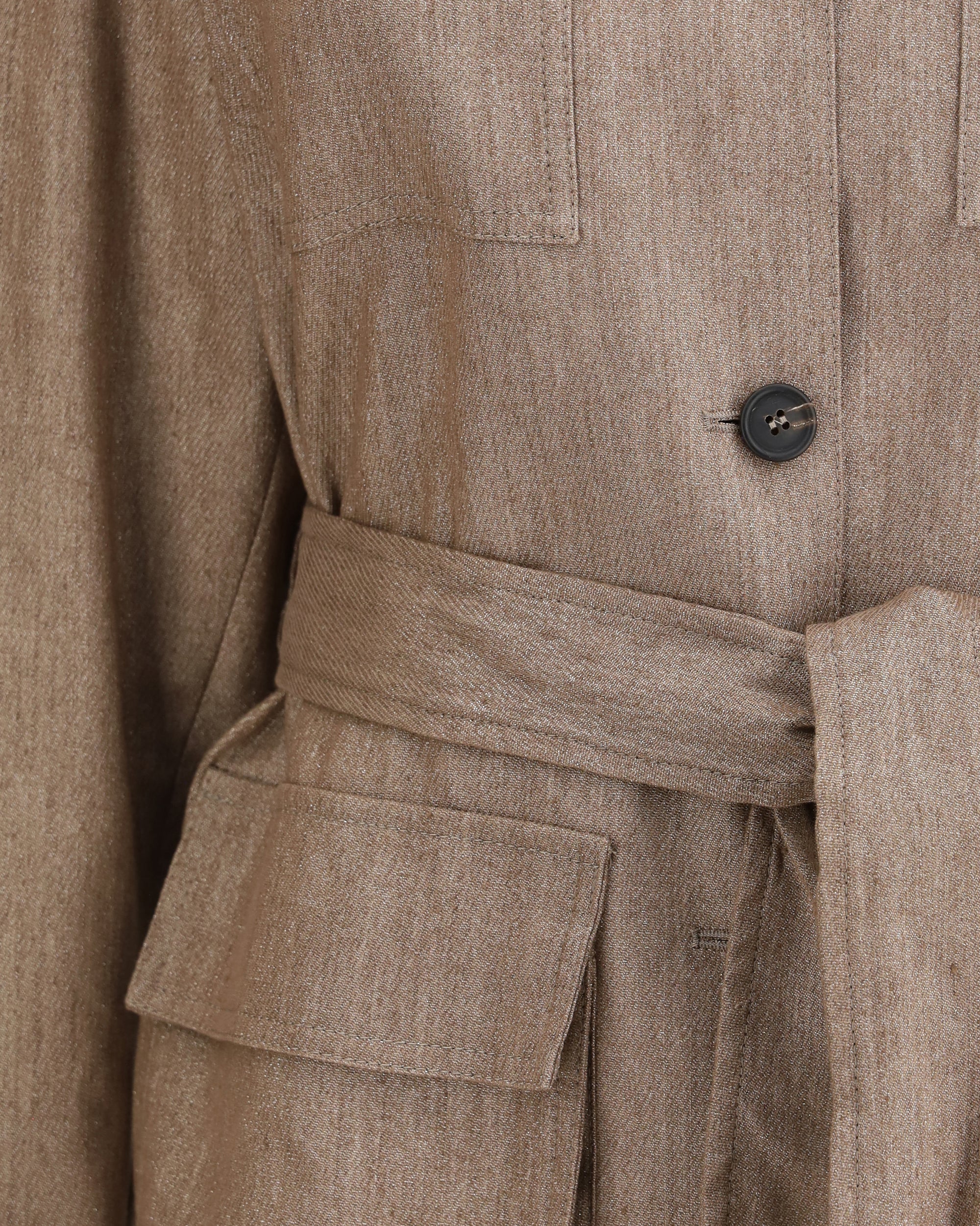 The Safari Jacket in Sparkling Twill by Brunello Cucinelli crafted from linen and wool, it is inspired by traditional Saharan jackets and features large front pockets, with the silhouette cinched at the waist by an elegant belt. The iconic monile embroidery adds a subtle touch of sparkle, perfectly reflecting Brunello Cucinelli’s refined style.
