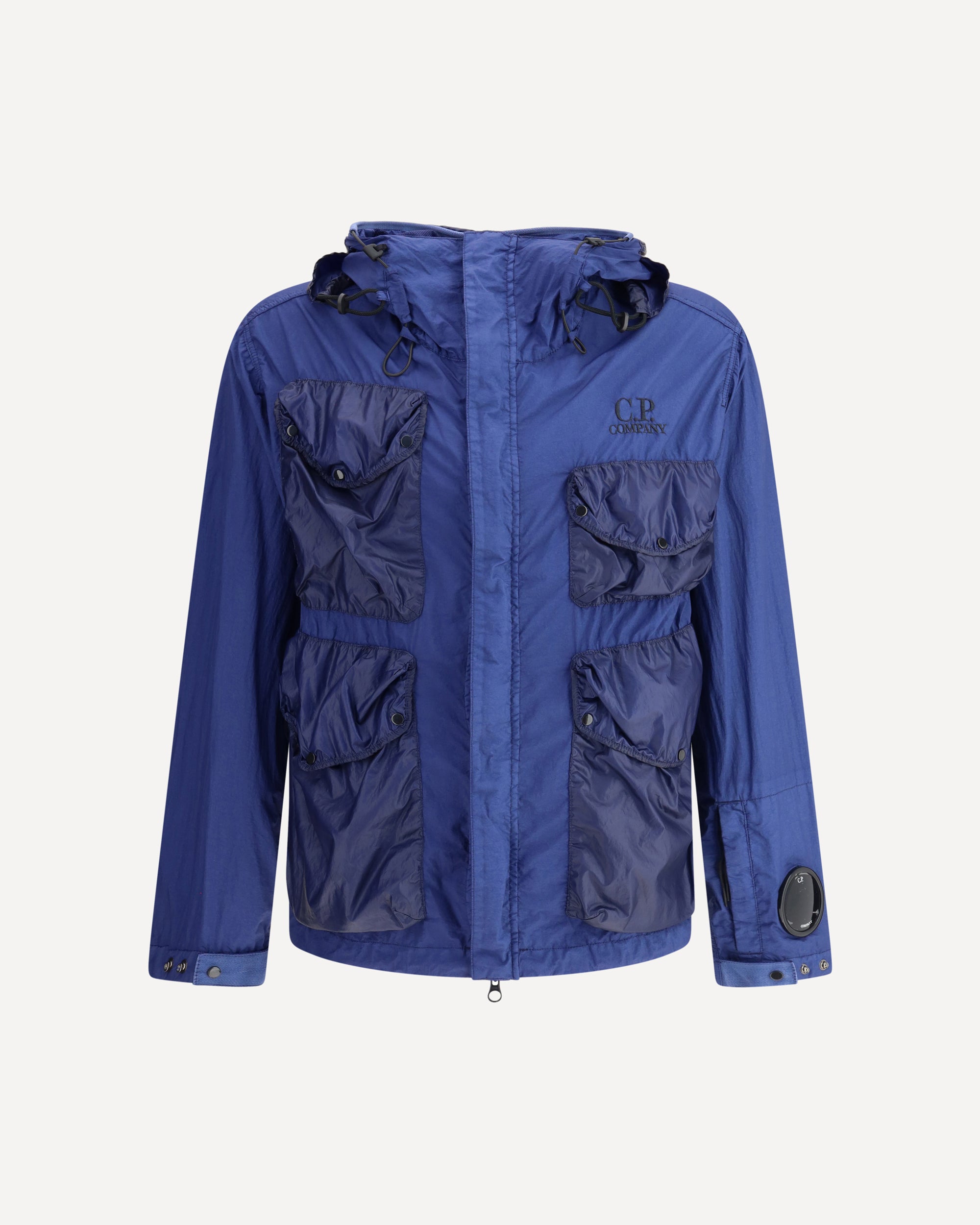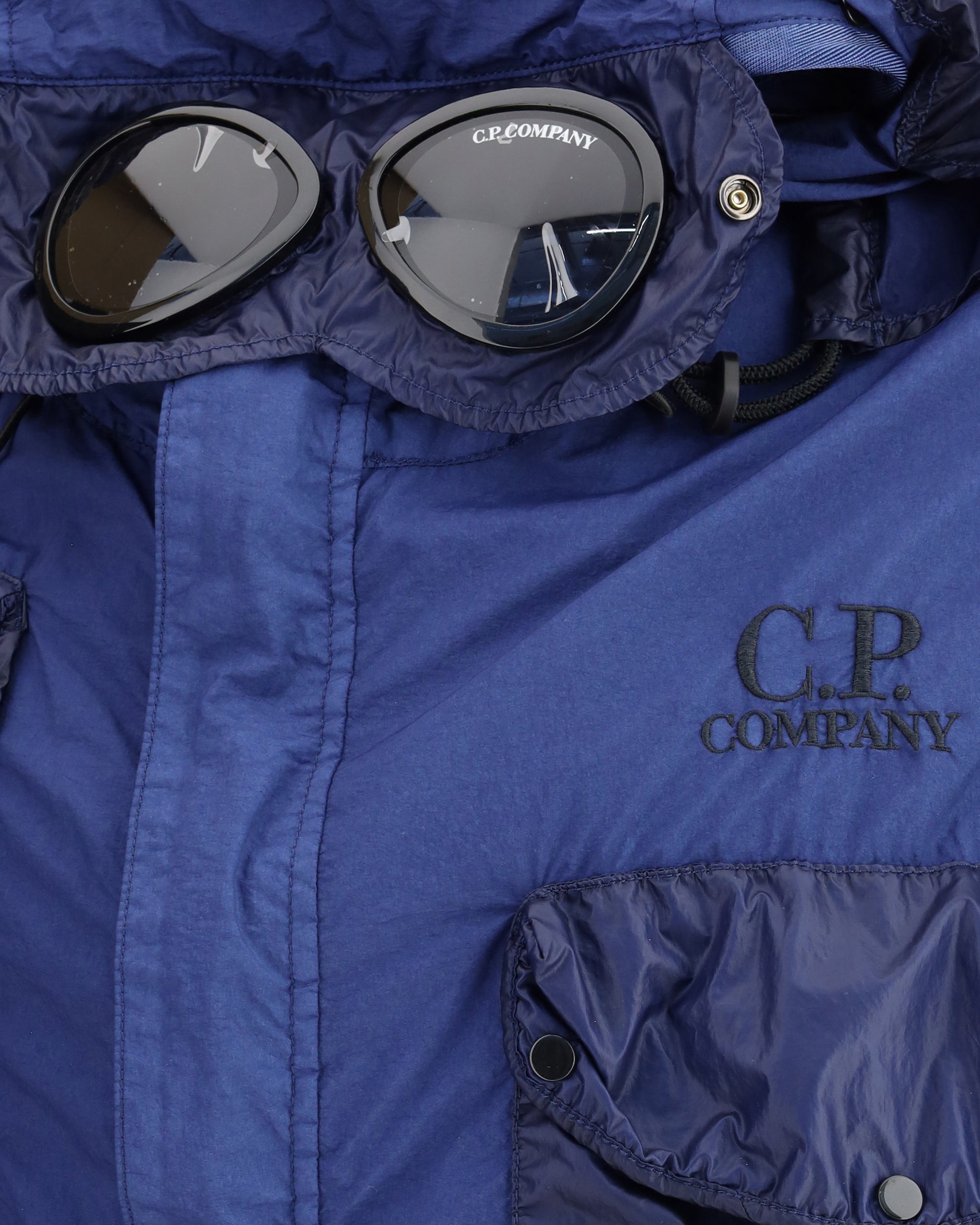 The Goggle Jacket by C.P. Company combines functionality and innovative design in a distinctive garment with an urban aesthetic. Crafted with an adjustable drawstring hood and featuring a front zipper and flap button closure, it ensures protection and practicality. The design is enhanced by four maxi flap patch pockets on the front, ideal for added functionality, and a vertical zipper pocket on the left sleeve. The iconic embroidered monogram on the front and the plastic logo patch applied on the left sleeve add a touch of brand recognition. Adjustable button cuffs and drawstring hem complete the design, ensuring a customizable fit.